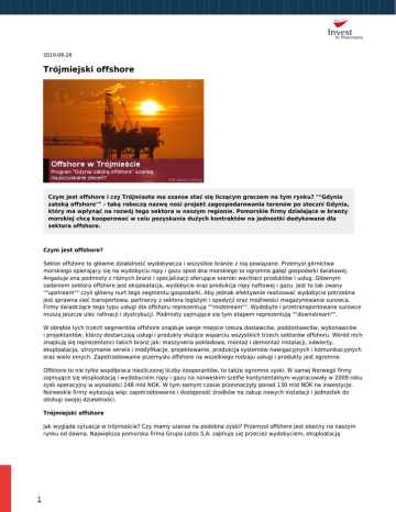 2010-08-26 Trójmiejski offshore Czym jest offshore i czy Trójmiasto ma szanse stać się liczącym graczem na tym rynku? ""Gdynia zatoką offshore"" - taką roboczą nazwę nosi projekt zagospodarowania terenów po stoczni Gdynia, który ma wpłynąć na rozwój tego sektora w naszym regionie. Pomorskie firmy działające w branży morskiej chcą kooperować w celu pozyskania dużych kontraktów na jednostki dedykowane dla sektora offshore. Czym jest offshore? Sektor offshore to głównie działalność wydobywcza i wszystkie branże z nią powiązane. Przemysł górnictwa morskiego opierający się na wydobyciu ropy i gazu spod dna morskiego to ogromna gałąź gospodarki światowej. Angażuje ona podmioty z różnych branż i specjalizacji oferujące szeroki wachlarz produktów i usług. Głównym zadaniem sektora offshore jest eksploatacja, wydobycie oraz produkcja ropy naftowej i gazu. Jest to tak zwany ""upstream"" czyli główny nurt tego segmentu gospodarki. Aby jednak efektywnie realizować wydobycie potrzebna jest sprawna sieć transportowa, partnerzy z sektora logistyki i spedycji oraz możliwości magazynowania surowca. Firmy świadczące tego typu usługi dla offshoru reprezentują ""midstream"". Wydobyte i przetransportowane surowce muszą jeszcze ulec rafinacji i dystrybucji. Podmioty zajmujące się tym etapem reprezentują ""downstream"". W obrębie tych trzech segmentów offshore znajduje swoje miejsce rzesza dostawców, poddostawców, wykonawców i projektantów, którzy dostarczają usługi i produkty służące wsparciu wszystkich trzech sektorów offshoru. Wśród nich znajdują się reprezentanci takich branż jak: maszyneria pokładowa, montaż i demontaż instalacji, odwierty, eksploatacja, utrzymanie serwis i modyfikacje, projektowanie, produkcja systemów nawigacyjnych i komunikacyjnych oraz wiele innych. Zapotrzebowanie przemysłu offshore na wszelkiego rodzaju usługi i produkty jest ogromne. Offshore to nie tylko współpraca niezliczonej liczby kooperantów, to także ogromne zyski. W samej Norwegii firmy zajmujące się eksploatacją i wydobyciem ropy i gazu na norweskim szelfie kontynentalnym wypracowały w 2009 roku zysk operacyjny w wysokości 248 mld NOK. W tym samym czasie przeznaczyły ponad 130 mld NOK na inwestycje. Norweskie firmy wykazują więc zapotrzebowanie i dostępność środków na zakup nowych instalacji i jednostek do obsługi swojej działalności. Trójmiejski offshore Jak wygląda sytuacja w trójmieście? Czy mamy szanse na podobne zyski? Przemysł offshore jest obecny na naszym rynku od dawna. Największa pomorska firma Grupa Lotos S.A. zajmuje się przecież wydobyciem, eksploatacją 1 i rafinacją złóż ropy naftowej z dna morskiego. Za pośrednictwem Lotos Petrobaltic ma ona wyłączną koncesję na prace wydobywcze w polskiej wyłącznej strefie ekonomicznej na Bałtyku. Co więcej spółka jest także obecna na norweskim szelfie kontynentalnym (Lotos ma 20% udziałów koncesji na wydobycie ropy z norweskiego złoża Yme). Pomorska spółka jest więc wręcz podręcznikowym przykładem ""upstreamu"" w offshore. W województwie pomorskim działa ok. 6000 firm związanych w sektorem morskim. 3900 z nich to podmioty z branży konstrukcyjnej. Pomorskie stocznie budują i remontują statki do obsługi platform wiertniczych (Furgo Symphony zbudowany w Stoczni Gdańsk). Grupa Remontowa S.A., Stocznia Gdańska S.A. czy mniejsze zakłady takie jak Crist czy Odys mają na swoim koncie konserwacje, przebudowy i budowę od podstaw platform (Arctic II i Safe Esbjerg Remontowa czy Thor - Crist), a nawet elektrowni na fale morskie (Roshage Test Unit zbudowany dla duńskiej firmy Wave Star Energy przez Stocznię Odys). Na Pomorzu działają także firmy z obszaru zaawansowanych technologii, takie jak: wchodzący w skład Grupy Remontowa IT-REM dostarczający rozwiązania IT dla przemysłu morskiego czy gdyński Enamor zajmujący się elektroniką, nawigacją i automatyką morską. Pomorze jest również regionem silnym edukacyjnie. Aż trzy trójmiejskie uczelnie przygotowują inżynierów do pracy w segmencie offshore: Politechnika Gdańska, Akademia Morska w Gdynia i Akademia Marynarki Wojennej w Gdyni. Dostępność kadry jest więc duża. Gdynia zatoką offshore? Program opracowany przez Partyka Michalaka prezesa Stoczni Gdynia wraz z Romanem Nojszewskim zarządcą kompensacji stoczni przewiduje integracje firm z obszaru przemysłu morskiego i stoczniowego w celu wspólnej walki o zlecenia na budowę wyspecjalizowanych statków do obsługi górnictwa morskiego. Działalność miałaby korzystać z potencjału zlikwidowanej gdyńskiej stoczni. Zainteresowanie projektem wyraziło wiele trójmiejskich firm i ich kooperanci. Są wśród nich: Stocznia Gdańsk, Stocznia Marynarki Wojennej, Stocznia Crist, a także Euro-Cynk, Gefako, Wistal, Energomontaż Północ Gdynia, Germanisher Lloyd czy Hipolit Cegielski Poznań. Część z tych firm wykupiło lub wydzierżawiło już części majątku gdyńskiej stoczni. Projekt ma zwiększyć konkurencyjność tych firm na rynku i pozwolić na pozyskanie wielomilionowych kontraktów na budowę i remonty statków do obsługi platform wydobywczych i instalacji offshore. Grupa miałaby zajmować się w szczególności produkcją jednostek typu FPSO (Floating Production, Storage and Offloading Unit) służących do wydobycia ropy i gazu spod dna morskiego. Offshore jest obecny w Trójmieście od dawna. Potencjał naszych stoczni, wysoka dostępność kadry i rozwijający się rynek zaawansowanych technologii dla branży morskiej pozwala patrzeć na przyszłość offshoru na Pomorzu z umiarkowanym optymizmem. Jest to bowiem kierunek rozwoju branży morskiej, który pozwoli efektywnie wykorzystywać potencjał naszych firm i specjalistów. Program ""Gdynia zatoką offshore"" może więc korzystnie wpłynąć na konkurencyjność naszego regionu wśród dostawców i podwykonawców w segmencie górnictwa mor