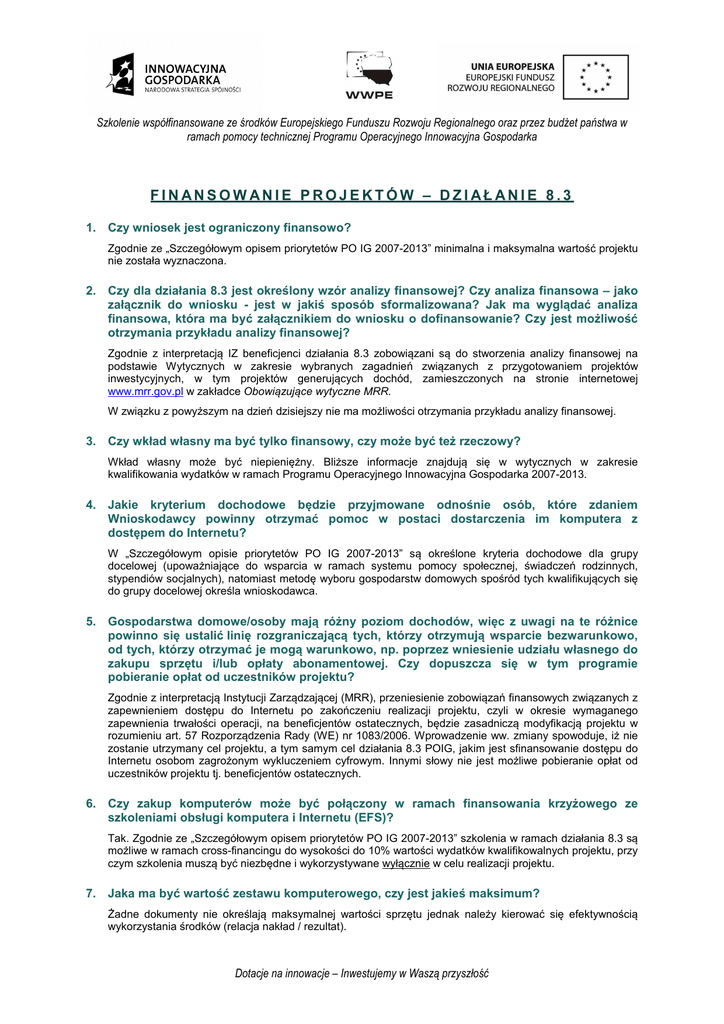 Szkolenie współfinansowane ze środków Europejskiego Funduszu Rozwoju Regionalnego oraz przez budŜet państwa w ramach pomocy technicznej Programu Operacyjnego Innowacyjna Gospodarka FINANSOW ANIE PROJEKTÓW – DZI AŁ ANIE 8.3 1. Czy wniosek jest ograniczony finansowo? Zgodnie ze „Szczegółowym opisem priorytetów PO IG 2007-2013” minimalna i maksymalna wartość projektu nie została wyznaczona. 2. Czy dla działania 8.3 jest określony wzór analizy finansowej? Czy analiza finansowa – jako załącznik do wniosku - jest w jakiś sposób sformalizowana? Jak ma wyglądać analiza finansowa, która ma być załącznikiem do wniosku o dofinansowanie? Czy jest możliwość otrzymania przykładu analizy finansowej? Zgodnie z interpretacją IZ beneficjenci działania 8.3 zobowiązani są do stworzenia analizy finansowej na podstawie Wytycznych w zakresie wybranych zagadnień związanych z przygotowaniem projektów inwestycyjnych, w tym projektów generujących dochód, zamieszczonych na stronie internetowej www.mrr.gov.pl w zakładce Obowiązujące wytyczne MRR. W związku z powyższym na dzień dzisiejszy nie ma możliwości otrzymania przykładu analizy finansowej. 3. Czy wkład własny ma być tylko finansowy, czy może być też rzeczowy? Wkład własny może być niepieniężny. Bliższe informacje znajdują się w wytycznych w zakresie kwalifikowania wydatków w ramach Programu Operacyjnego Innowacyjna Gospodarka 2007-2013. 4. Jakie kryterium dochodowe będzie przyjmowane odnośnie osób, które zdaniem Wnioskodawcy powinny otrzymać pomoc w postaci dostarczenia im komputera z dostępem do Internetu? W „Szczegółowym opisie priorytetów PO IG 2007-2013” są określone kryteria dochodowe dla grupy docelowej (upoważniające do wsparcia w ramach systemu pomocy społecznej, świadczeń rodzinnych, stypendiów socjalnych), natomiast metodę wyboru gospodarstw domowych spośród tych kwalifikujących się do grupy docelowej określa wnioskodawca. 5. Gospodarstwa domowe/osoby mają różny poziom dochodów, więc z uwagi na te różnice powinno się ustalić linię rozgraniczającą tych, którzy otrzymują wsparcie bezwarunkowo, od tych, którzy otrzymać je mogą warunkowo, np. poprzez wniesienie udziału własnego do zakupu sprzętu i/lub opłaty abonamentowej. Czy dopuszcza się w tym programie pobieranie opłat od uczestników projektu? Zgodnie z interpretacją Instytucji Zarządzającej (MRR), przeniesienie zobowiązań finansowych związanych z zapewnieniem dostępu do Internetu po zakończeniu realizacji projektu, czyli w okresie wymaganego zapewnienia trwałości operacji, na beneficjentów ostatecznych, będzie zasadniczą modyfikacją projektu w rozumieniu art. 57 Rozporządzenia Rady (WE) nr 1083/2006. Wprowadzenie ww. zmiany spowoduje, iż nie zostanie utrzymany cel projektu, a tym samym cel działania 8.3 POIG, jakim jest sfinansowanie dostępu do Internetu osobom zagrożonym wykluczeniem cyfrowym. Innymi słowy nie jest możliwe pobieranie opłat od uczestników projektu tj. beneficjentów ostatecznych. 6. Czy zakup komputerów może być połączony w ramach finansowania krzyżowego ze szkoleniami obsługi komputera i Internetu (EFS)? Tak. Zgodnie ze „Szczegółowym opisem priorytetów PO IG 2007-2013” szkolenia w ramach działania 8.3 są możliwe w ramach cross-financingu do wysokości do 10% wartości wydatków kwalifikowalnych projektu, przy czym szkolenia muszą być niezbędne i wykorzystywane wyłącznie w celu realizacji projektu. 7. Jaka ma być wartość zestawu komputerowego, czy jest jakieś maksimum? Żadne dokumenty nie określają maksymalnej wartości sprzętu jednak należy kierować się efektywnością wykorzystania środków (relacja nakład / rezultat). Dotacje na innowacje – Inwestujemy w Waszą przyszłość Szkolenie współfinansowane ze środków Europejskiego Funduszu Rozwoju Regionalnego oraz przez budŜet państwa w ramach pomocy technicznej Programu Operacyjnego Innowacyjna Gospodarka 8. Kto w przypadku projektu realizowanego przez powiat w porozumieniu z gminami musi zapewnić wkład własny 15%? Czyim majątkiem będzie zakupiony w ramach projektu sprzęt? Za zapewnienie wkładu własnego odpowiedzialny jest wnioskodawca. Właścicielem sprzętu jest podmiot, który go kupił. 9. W przypadku kiedy projekt nie generuje żadnych przychodów czy konieczne jest przeprowadzenie analizy finansowej, czy nie wystarczy wtedy załączyć oświadczenia, że projekt nie generuje żadnych dochodów? Analiza finansowa jest wymagana w przypadku każdego projektu. 10. Na etapie składania wniosku i podpisywania umowy o dofinansowanie projektu ile w Budżecie Miasta musi być zagwarantowanych środków własnych – czy np. 15 % wkładu własnego czy 100 % wartości inwestycji? Zgodnie ze Szczegółowym opisem priorytetów PO IG, 2007-2013, w ramach tego Programu dla działania 8.3 minimalny wkład własny beneficjenta wynosi 15%. W związku z tym Wnioskodawca zabezpiecza środki w części dotyczącej udziału własnego. 11. Czy Uchwała Rady Miasta - budżet – może być dokumentem uwierzytelniającym oświadczenie o posiadanych środkach finansowych na realizację zadania? Dokumentem uwierzytelniającym oświadczenie o posiadanych środkach finansowych na realizację projektu może być: uchwała budżetowa, uchwała intencyjna lub wieloletni plan inwestycyjny. 12. Czy w Uchwale musi być wymienione zadanie z nazwy ? Tak. W Uchwale Rady Miasta musi być uwzględniona pozycja o takiej nazwie, która określałaby wysokość środków przeznaczoną na ten projekt. 13. Co to są koszty ogólne? Koszty ogólne to koszty, które nie mogą zostać bezpośrednio przyporządkowane do konkretnego produktu lub usługi. Do kategorii kosztów ogólnych należą m.in. opłaty czynszowe, koszty administracyjne, koszty zarządzania projektem, opłaty za energię, ogrzewanie. Koszty ogólne nie mogą przekroczyć 20% całkowitych kosztów / wydatków