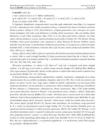 Słownik polszczyzny XVI wieku - wersja elektroniczna hasło: CAŁOŚĆ (stan na dzień: 11-10-2015) www.spxvi.edu.pl strona 1/4 CAŁOŚĆ (187) sb f a oraz o jasne (w tym w a 5 r. błędne znakowanie). sg N całość (10). ◊ G całości (10). ◊ D całości (2). ◊ A całość (23). ◊ L całości (142). Sł stp, Cn notuje, Linde XVII – XIX w. 1. Zupełność, kompletność, nieograniczoność, wszystko, ogół, całokształt; totum Mącz, Cn; integritas Cn (24) : roſkazalyſczye tho wſzitko naczaloſczi zebracz y zebrawſzi tho themv Czavſſowi naſchemv Wrancze podacz. LibLeg 11/141v; Synechdoche [...] Figura grammatica cum a toto pars vel a parte totum intelligitur, Gdy tylko część kłádziemy á wſziſtkę cáłość rozumiemy/ álbo záś wſziſtkę cáłość kłádziemy á część tylko rozumiemy. Mącz 437a; A w tym iáko wędá boſtwo zátáione/ nie tylko cáłość cżłowiecżeńſtwá [...] przez zmartwychwſtánie przywroćiło CzechEp 149, 150; ábyſmy Ziemię Podláſką/ która przed przeſzlémi czáſy zupełnym á cáłym Práwem do Korony Polſkiéy záwſze należáłá/ téyże Koronie/ to ieſt Króleſtwu Polſkiému przywróćili/ á w iéy piérwość y cáłość wſczépili. SarnStat 1037; y śiebie Króleſtwu y Koronie iáko część do ſwéy cáłośći ziednoczyli SarnStat 1053, 1037, 1057 [2 r.], 1186 [2 r]. Szereg: »(tak) w całości albo (i, jako) w części(ach)« (8): któryby przećiwko náſzému poſtánowieniu w cáłośći/ álbo w częśći wyſtąpił SarnStat 52; który przerzeczony ſkarb Zup ták w cáłośći/ iáko w częśćiách [in capite et in membris JanStat 33]/ y wſzyſtkich dochodách porządnie roſpráwił SarnStat 369, 163, 382, 948, 979, 1040, 1042. Wyrażenie przyimkowe: »w całości« (12): Iakoż tego znak ieſt w kropiach wodi ktore okrągłe widamy, á to dla tego iż też woda w czałoſci ſwego żywiołu okrągła ieſt GlabGad B8v; BielKron 254v; tego nawięćey [!] pilnowáli/ iákoby woyſko głowne w cáłośći iáko máćicá stało w ſpráwie ſwey nie poruſzone BielSpr 14v, 15v. Cf Szereg. 2. Nieuszkodzenie, nienaruszalność, niepodzielność, trwałość, zachowanie, znajdowanie się w stanie nienaruszonym, bez uszczerbku; incolumitas, integritas, salus Cn (159) : Bo w ćyele ine myeyſce ma głowá/ ine plecy/ żywot/ ręce/ nogi/ pálce/ inákſſy też ſpoſob/ inſſą ſpráwę/ nye ku ſwemu tylko właſnemu pożytkowi/ ále ku potrzebye y záchowányu cáłoſci wſſyſtkyego ćyáłá ſlużącą. KromRozm III F6v; Instauro [...] Nápráwiam/ odnawiam/ku cáłośćy prziwrácam. Mącz 171b; [ciała ludzkie] yuż w proch obrocone/ ſłowem w ſkrześić/ y do prawdźiwey mocy/ władzey/ cáłośći/ doſkonáłey przywieść/ ták iákie teras ſą. BiałKaz E2v; á záśie/ ieſli która rzecż z onych trzech ma w ſobie iákie vbliżenie/ tedy też Rzecżypoſpolitey ná iey zacnośći y cáłosći wiele ſchodzić muśi. ModrzBaz 4v; gdy ich [artykułów wiary] cáłość/ pewność/ dawność/ vſtáwicżność/ wedla ſwey káżdy dumy kierowáć/ álbo rácżey ſzpoćić pocżęli ReszPrz 91; abysmy iako nairządniey, do wszytkiego czego potrzebui R. P: y całosc iey przystepowac zawsze mogli ActReg 137, 75; żeby kárność Zołnirſka przez cię zgwałcona thwoim karániem w cáłość ſwą byłá wpráwiona. Phil E, N4; LatHar 38; Wáruiąc w tych wſzyſtkich ártykułách cáłość y ważność Conſtituciiéy wysſzéy miánowánéy SarnStat 437; Y teraz gdy ſzło o poſpolitą wolność/ o práwá/ y o cáłość Rzeczypo. SarnStat 1051, 1068, 1086; GrabPospR K2; A iákoż tu cáłość poſpolitego dobrá długo ſie zoſtáć może PowodPr 74, 63, 77, 81 [2 r.]; VotSzl A2, B3v; áby ſię w ſpráwiedliwośći/ y w pożytkách poſpolitych/ y w dochowániu całośći Rzeczypoſp: nie pochybiło. SkarKazSej 699b. Słownik polszczyzny XVI wieku - wersja elektroniczna hasło: CAŁOŚĆ (stan na dzień: 11-10-2015) www.spxvi.edu.pl strona 2/4 W charakterystycznych połączeniach: całość korony, kościoła (2), ojczyzny, pokoju (2), rzeczypospolitej (6); całość kościelna. Zwroty: »w całości, całość (za-, do-)chow(yw)ać; w całości (za-,do-)chowan(y); zachowanie« [szyk zmienny] (36 : 2; 16 : 4): a ych odzyenye przeſz czterdzyeſzczy lath wczaloſzczy zachouacz mógł PatKaz I 14; LibLeg 7/9v; á nádzieiá moiá o wybáwieniu twoiem wcáłoſći myſl moię záchowa. RejPs 101v; tám ſnadź lepyey w cáłoſći y doſtoyeńſtwye ſwym záchowaná yeſt ewángelia/ to yeſt/ náuká Kryſtuſowá. KromRozm I E3v, E4, N; MurzNT 21; KromRozm II v2; Diar 53; LubPs I2; KrowObr 23; LeszczRzecz A3v; ále Rzeczpoſpolita y poſpolſtwo iey/ ktożkolwiek iey dobrze cżyni y w cáłośći záchowywa ią/ tego ſobie godnym być zowie OrzRozm P2v; áby ich role álbo zboża w całośći były záchowany. BielKron 57; wſzákże Sáráceni grob Páńſki w cáłośći chowáli dla pielgrzymow BielKron 178, 57, 227v, 377, 401; RejAp CC2, 89; RejPos 355; ieſliby ludźie wierni Swiątośc [!] Małżeńſką poználi/ y w cáłości ią chowáli KuczbKat 250, 325, 435; á wolnośći y práwá ich w cáłośći záchowáć RejZwierc 44v, 195; dochowáli by nam ieſzcże byli do tego cżáſu w cáłośći Monárchiey ſwoiey Rzymſkiey bes wątpienia BielSpr 11, b4v; CzechRozm 82v; Abowiem Rzecżpoſpolita niemoże inſzym ſpoſobem wcáłośći być záchowána [conservari]/ iedno záchowániem wiáry nietylko obywátelom ábo prziiaćiołom/ ále y nieprzyiaćiołom. ModrzBaz 21v, 4 [2 r.], 5, [16], 22v, [41]v (16); CzechEp 27; A ktorem ſpoſobem Rzeczpoſpolita rośćie/ tym że też záchowywá cáłość ſwoię. GórnRozm Mv; Phil B2, L, P; Powtóré, w cáłośći Rzeczypoſpolitéy corpus dochowáć. SarnStat 2, 1180; SkarKaz )(2v [2 r.], 116a; VotSzl A2v; SkarKazSej 688a. »w całości stać« [szyk zmienny] (6): A kto mię ma ná bácżnośći/ Sto