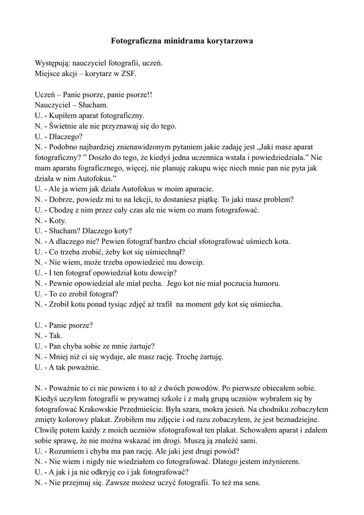 Fotograficzna minidrama korytarzowa Występują: nauczyciel fotografii, uczeń. Miejsce akcji – korytarz w ZSF. Uczeń – Panie psorze, panie psorze!! Nauczyciel – Słucham. U. - Kupiłem aparat fotograficzny. N. - Świetnie ale nie przyznawaj się do tego. U. - Dlaczego? N. - Podobno najbardziej znienawidzonym pytaniem jakie zadaję jest „Jaki masz aparat fotograficzny? ” Doszło do tego, że kiedyś jedna uczennica wstała i powiedziedziała.” Nie mam aparatu fograficznego, więcej, nie planuję zakupu więc niech mnie pan nie pyta jak działa w nim Autofokus.” U. - Ale ja wiem jak działa Autofokus w moim aparacie. N. - Dobrze, powiedz mi to na lekcji, to dostaniesz piątkę. To jaki masz problem? U. - Chodzę z nim przez cały czas ale nie wiem co mam fotografować. N. - Koty. U. - Słucham? Dlaczego koty? N. - A dlaczego nie? Pewien fotograf bardzo chciał sfotografować uśmiech kota. U. - Co trzeba zrobić, żeby kot się uśmiechnął? N. - Nie wiem, może trzeba opowiedzieć mu dowcip. U. - I ten fotograf opowiedział kotu dowcip? N. - Pewnie opowiedział ale miał pecha. Jego kot nie miał poczucia humoru. U. - To co zrobił fotograf? N. - Zrobił kotu ponad tysiąc zdjęć aż trafił na moment gdy kot się uśmiecha. U. - Panie psorze? N. - Tak. U. - Pan chyba sobie ze mnie żartuje? N. - Mniej niż ci się wydaje, ale masz rację. Trochę żartuję. U. - A tak poważnie. N. - Poważnie to ci nie powiem i to aż z dwóch powodów. Po pierwsze obiecałem sobie. Kiedyś uczyłem fotografii w prywatnej szkole i z małą grupą uczniów wybrałem się by fotografować Krakowskie Przedmieście. Była szara, mokra jesień. Na chodniku zobaczyłem zmięty kolorowy plakat. Zrobiłem mu zdjęcie i od razu zobaczyłem, że jest beznadziejne. Chwilę potem każdy z moich uczniów sfotografował ten plakat. Schowałem aparat i zdałem sobie sprawę, że nie można wskazać im drogi. Muszą ją znaleźć sami. U. - Rozumiem i chyba ma pan rację. Ale jaki jest drugi powód? N. - Nie wiem i nigdy nie wiedziałem co fotografować. Dlatego jestem inżynierem. U. - A jak i ja nie odkryję co i jak fotografować? N. - Nie przejmuj się. Zawsze możesz uczyć fotografii. To też ma sens.