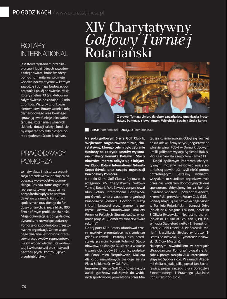 PO GODZINACH / www.expressbiznesu.pl Rotary International jest stowarzyszeniem przedsiębiorców i ludzi różnych zawodów z całego świata, które świadczy pomoc humanitarną, promuje wysokie normy etyczne w każdym zawodzie i pomaga budować dobrą wolę i pokój na świecie. Misję Rotary spełnia 33 tys. klubów na całym świecie, posiadając 1.2 mln członków. Wszyscy członkowie kierownictwa Rotary szczebla międzynarodowego oraz lokalnego sprawują swe funkcje jako wolontariusze. Rotarianie z własnych składek i dotacji założyli fundację, by wspierać projekty niosące pomoc społecznościom lokalnym. Pracodawcy Pomorza to największa i najstarsza organizacja pracodawców, działająca na obszarze województwa pomorskiego. Posiada status organizacji reprezentatywnej, przez co ma bezpośredni wpływ na ustawodawstwo w ramach konsultacji społecznych oraz dostęp do funduszy unijnych. Zrzesza blisko 800 firm o różnym profilu działalności. Misją organizacji jest długofalowy, dynamiczny rozwój gospodarczy Pomorza oraz podmiotów zrzeszonych w organizacji. Celem wspólnego działania jest obrona interesów pracodawców, reprezentowanie ich wobec władzy ustawodawczej i wykonawczej oraz instytucji nadzorujących i kontrolujących przedsiębiorstwa. 76 Z prawej Tomasz Limon, dyrektor zarządzający organizacją Pracodawcy Pomorza, z lewej Antoni Wierciński, Strażnik Godła Roraty TEKST: Piotr Smoliński| ZDJĘCIE: Piotr Smoliński Na polu golfowym Sierra Golf Club k. Wejherowa zorganizowano turniej charytatywny, którego celem było zebranie funduszy na pokrycie kosztów wykonania makiety Pomnika Poległych Stoczniowców. Impreza odbyła się z inicjatywy Klubu Rotary International GdańskSopot-Gdynia oraz zarządu organizacji Pracodawcy Pomorza. Na polu Sierra Golf Club w Pętkowicach rozegrano XIV Charytatywny Golfowy Turniej Rotariański. Zawody zorganizował Klub Rotary International Gdańsk-Sopot-Gdynia wraz z zarządem organizacji Pracodawcy Pomorza. Dochód z aukcji i loterii fantowej przeznaczono na pokrycie kosztów ufundowania makiety Pomnika Poległych Stoczniowców, w ramach projektu „Pomóżmy zobaczyć świat rękoma”. Do tej pory Klub Rotary ufundował cztery makiety prezentujące najsłynniejsze gdańskie zabytki. Ostatnią z nich, przedstawiającą m.in. Pomnik Poległych Stoczniowców, odsłonięto 31 sierpnia w czasie trwania obchodów 35. rocznicy podpisania Porozumień Sierpniowych. Makieta dla osób niewidomych znajduje się na Placu Solidarności w Gdańsku. Imprezie w Sierra Golf Club towarzyszyła aukcja gadżetów należących do wybitnych sportowców, prowadzona przez Ma- teusza Kusznierewicza. Odbył się również pokaz kolekcji firmy Batycki, degustowano włoskie wina. Pobyt w Domu Klubowym umilił golfistom występ Agnieszki Babicz, która zaśpiewała z zespołem Rama 111. – Dzięki cyklicznym imprezom charytatywnym możemy realizować naszą rotariańską powinność, czyli nieść pomoc potrzebującym. Jesteśmy wdzięczni wszystkim uczestnikom organizowanych przez nas wydarzeń dobroczynnych oraz sponsorom, dziękujemy im za hojność i okazane wsparcie – powiedział Andrzej Krzemiński, prezydent Rotary Club GSG. Poniżej znajdują się nazwiska najlepszych w Turnieju Rotariańskim: Longest Drive (dołek nr 6 Magnus Eriksson, dołek nr 3 Oliwia Ryszewska), Nearest to the pin (dołek nr 12 Karl af Schulten 2,39), klasyfikacja Stableford netto (1. Bengstrom Peter, 2. Pohl Leszek, 3. Pieńczewski Marian), klasyfikacja Strokeplay brutto (1. Leszek Sokołowski, 2. Tymoteusz Jankowski, 3. Cicek Mustafa). Najlepszym zawodnikiem w szeregach „Pracodawców Pomorza” okazał się Jan Łabas, prezes zarządu ALU International Shipyard Spółka z o.o. W ramach Akademii Golfa najdalej piłkę posłał Jan Zacharewicz, prezes zarządu Biura Doradztwa Ekonomicznego i Prawnego „Business Consultans” Sp. z o.o.