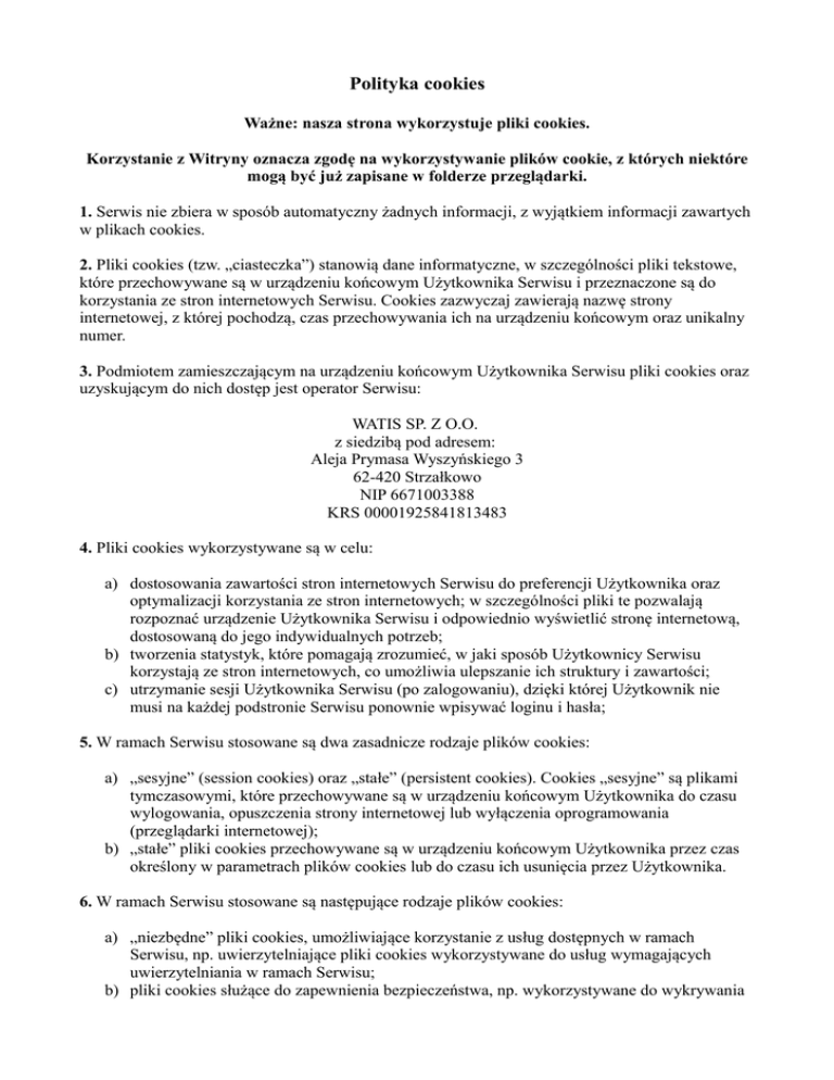 Polityka cookies Ważne: nasza strona wykorzystuje pliki cookies. Korzystanie z Witryny oznacza zgodę na wykorzystywanie plików cookie, z których niektóre mogą być już zapisane w folderze przeglądarki. 1. Serwis nie zbiera w sposób automatyczny żadnych informacji, z wyjątkiem informacji zawartych w plikach cookies. 2. Pliki cookies (tzw. „ciasteczka”) stanowią dane informatyczne, w szczególności pliki tekstowe, które przechowywane są w urządzeniu końcowym Użytkownika Serwisu i przeznaczone są do korzystania ze stron internetowych Serwisu. Cookies zazwyczaj zawierają nazwę strony internetowej, z której pochodzą, czas przechowywania ich na urządzeniu końcowym oraz unikalny numer. 3. Podmiotem zamieszczającym na urządzeniu końcowym Użytkownika Serwisu pliki cookies oraz uzyskującym do nich dostęp jest operator Serwisu: WATIS SP. Z O.O. z siedzibą pod adresem: Aleja Prymasa Wyszyńskiego 3 62-420 Strzałkowo NIP 6671003388 KRS 00001925841813483 4. Pliki cookies wykorzystywane są w celu: a) dostosowania zawartości stron internetowych Serwisu do preferencji Użytkownika oraz optymalizacji korzystania ze stron internetowych; w szczególności pliki te pozwalają rozpoznać urządzenie Użytkownika Serwisu i odpowiednio wyświetlić stronę internetową, dostosowaną do jego indywidualnych potrzeb; b) tworzenia statystyk, które pomagają zrozumieć, w jaki sposób Użytkownicy Serwisu korzystają ze stron internetowych, co umożliwia ulepszanie ich struktury i zawartości; c) utrzymanie sesji Użytkownika Serwisu (po zalogowaniu), dzięki której Użytkownik nie musi na każdej podstronie Serwisu ponownie wpisywać loginu i hasła; 5. W ramach Serwisu stosowane są dwa zasadnicze rodzaje plików cookies: a) „sesyjne” (session cookies) oraz „stałe” (persistent cookies). Cookies „sesyjne” są plikami tymczasowymi, które przechowywane są w urządzeniu końcowym Użytkownika do czasu wylogowania, opuszczenia strony internetowej lub wyłączenia oprogramowania (przeglądarki internetowej); b) „stałe” pliki cookies przechowywane są w urządzeniu końcowym Użytkownika przez czas określony w parametrach plików cookies lub do czasu ich usunięcia przez Użytkownika. 6. W ramach Serwisu stosowane są następujące rodzaje plików cookies: a) „niezbędne” pliki cookies, umożliwiające korzystanie z usług dostępnych w ramach Serwisu, np. uwierzytelniające pliki cookies wykorzystywane do usług wymagających uwierzytelniania w ramach Serwisu; b) pliki cookies służące do zapewnienia bezpieczeństwa, np. wykorzystywane do wykrywania nadużyć w zakresie uwierzytelniania w ramach Serwisu; c) „wydajnościowe” pliki cookies, umożliwiające zbieranie informacji o sposobie korzystania ze stron internetowych Serwisu; d) „funkcjonalne” pliki cookies, umożliwiające „zapamiętanie” wybranych przez Użytkownika ustawień i personalizację interfejsu Użytkownika, np. w zakresie wybranego języka lub regionu, z którego pochodzi Użytkownik, rozmiaru czcionki, wyglądu strony internetowej itp.; e) „reklamowe” pliki cookies, umożliwiające dostarczanie Użytkownikom treści reklamowych bardziej dostosowanych do ich zainteresowań. 7. W wielu przypadkach oprogramowanie służące do przeglądania stron internetowych (przeglądarka internetowa) domyślnie dopuszcza przechowywanie plików cookies w urządzeniu końcowym Użytkownika. Użytkownicy Serwisu mogą dokonać w każdym czasie zmiany ustawień dotyczących plików cookies. Ustawienia te mogą zostać zmienione w szczególności w taki sposób, aby blokować automatyczną obsługę plików cookies w ustawieniach przeglądarki internetowej bądź informować o ich każdorazowym zamieszczeniu w urządzeniu Użytkownika Serwisu. Szczegółowe informacje o możliwości i sposobach obsługi plików cookies dostępne są w ustawieniach oprogramowania (przeglądarki internetowej). 8. Operator Serwisu informuje, że ograniczenia stosowania plików cookies mogą wpłynąć na niektóre funkcjonalności dostępne na stronach internetowych Serwisu. 9. Pliki cookies zamieszczane w urządzeniu końcowym Użytkownika Serwisu i wykorzystywane mogą być również przez współpracujących z operatorem Serwisu reklamodawców oraz partnerów. 10. Więcej informacji na temat plików cookies dostępnych jest pod adresem http://www.wszystkoociasteczkach.pl lub w sekcji „Pomoc” w menu przeglądarki internetowej.