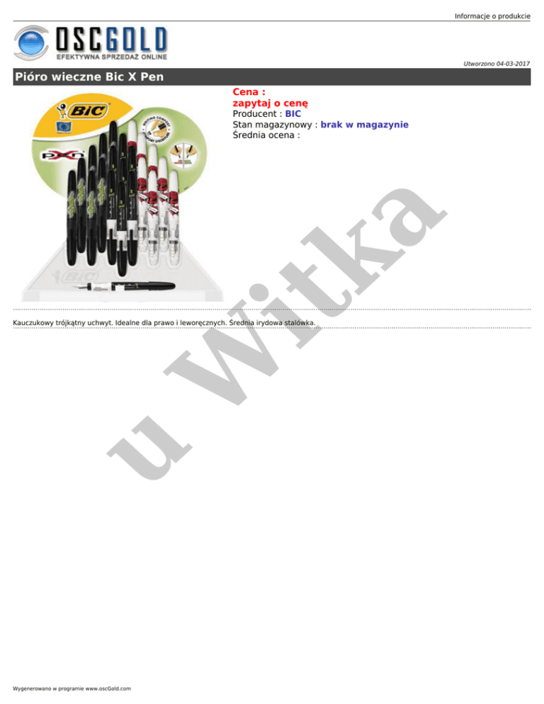 Informacje o produkcie Utworzono 04-03-2017 Pióro wieczne Bic X Pen Cena : zapytaj o cenę it ka Producent : BIC Stan magazynowy : brak w magazynie Średnia ocena : u W Kauczukowy trójkątny uchwyt. Idealne dla prawo i leworęcznych. Średnia irydowa stalówka. Wygenerowano w programie www.oscGold.com