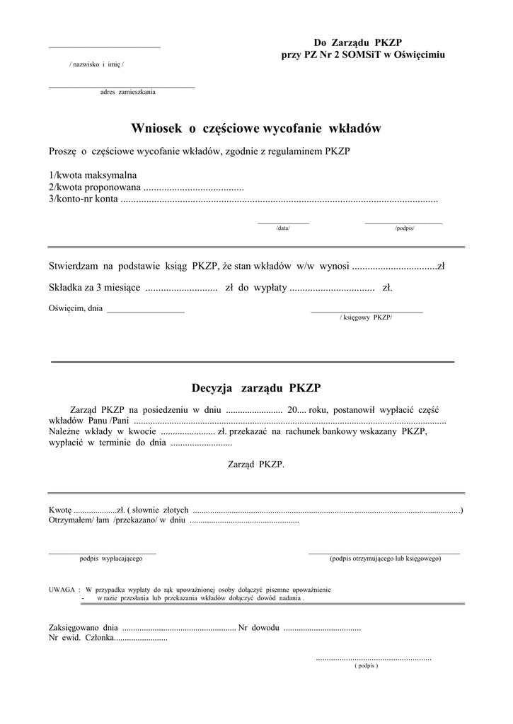 Do Zarządu PKZP przy PZ Nr 2 SOMSiT w Oświęcimiu __________________________ / nazwisko i imię / __________________________________ adres zamieszkania Wniosek o częściowe wycofanie wkładów Proszę o częściowe wycofanie wkładów, zgodnie z regulaminem PKZP 1/kwota maksymalna 2/kwota proponowana ....................................... 3/konto-nr konta ........................................................................................................................... ____________ __________________ /data/ /podpis/ Stwierdzam na podstawie ksiąg PKZP, że stan wkładów w/w wynosi .................................zł Składka za 3 miesiące ............................ zł do wypłaty ................................. zł. Oświęcim, dnia __________________ __________________________ / księgowy PKZP/ Decyzja zarządu PKZP Zarząd PKZP na posiedzeniu w dniu ........................ 20.... roku, postanowił wypłacić część wkładów Panu /Pani .................................................................................................................................... Należne wkłady w kwocie ....................... zł. przekazać na rachunek bankowy wskazany PKZP, wypłacić w terminie do dnia .......................... Zarząd PKZP. Kwotę ....................zł. ( słownie złotych ............................................................................................................................) Otrzymałem/ łam /przekazano/ w dniu ................................................... _________________________ podpis wypłacającego _____________________________ ______ (podpis otrzymującego lub księgowego) UWAGA : W przypadku wypłaty do rąk upoważnionej osoby dołączyć pisemne upoważnienie w razie przesłania lub przekazania wkładów dołączyć dowód nadania . Zaksięgowano dnia ..................................................... Nr dowodu .................................... Nr ewid. Członka......................... ...................................................... ( podpis )