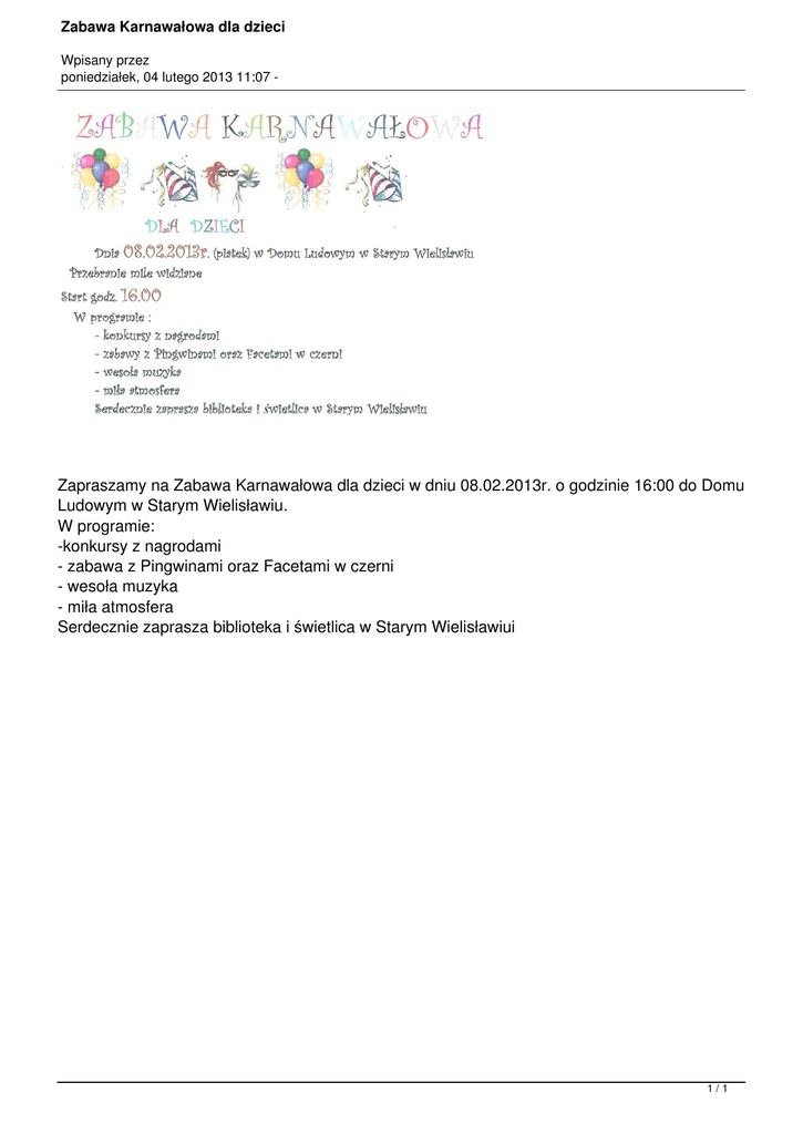 Zabawa Karnawałowa dla dzieci Wpisany przez poniedziałek, 04 lutego 2013 11:07 - Zapraszamy na Zabawa Karnawałowa dla dzieci w dniu 08.02.2013r. o godzinie 16:00 do Domu Ludowym w Starym Wielisławiu. W programie: -konkursy z nagrodami - zabawa z Pingwinami oraz Facetami w czerni - wesoła muzyka - miła atmosfera Serdecznie zaprasza biblioteka i świetlica w Starym Wielisławiui 1/1