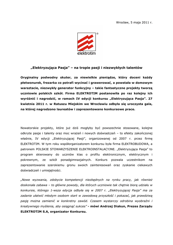 Wrocław, 5 maja 2011 r. „Elektryzująca Pasja” – na tropie pasji i niezwykłych talentów Oryginalny podwodny skuter, za niewielkie pieniądze, który doceni każdy płetwonurek, frezarka co potrafi wycinać i grawerować, a powstała w domowym warsztacie, niezwykły generator funkcyjny – takie fantastyczne projekty tworzą uczniowie polskich szkół. Firma ELEKTROTIM postanowiła po raz kolejny ich wyróżnić i nagrodzić, w ramach IV edycji konkursu „Elektryzująca Pasja”. 27 kwietnia 2011 r. w Ratuszu Miejskim we Wrocławiu odbyła się uroczysta gala, na której nagrodzono laureatów i zaprezentowano konkursowe prace. Nowatorskie projekty, które już dziś mogłyby być powszechnie stosowane, kolejne odkryte pasje i talenty oraz moc wrażeń i nowych doświadczeń – to efekty zakończonej właśnie, IV edycji „Elektryzującej Pasji”, organizowanej od 2007 r. przez firmę ELEKTROTIM. W tym roku współorganizatorem konkursu była firma ELEKTROBUDOWA, a patronem POLSKIE STOWARZYSZENIE ELEKTROINSTALACYJNE. „Elektryzująca Pasja” to program skierowany pokrewnym, ze do szkół uczniów klas o profilu ponadgimnazjalnych. elektronicznym, Konkurs pozwala elektrycznym uczestnikom i na zaprezentowanie szerokiemu gronu swoich zainteresowań oraz zyskanie ciekawych doświadczeń i umiejętności. „Nowe wyzwania, zdobycie kompetencji niezbędnych na rynku pracy, jak również doskonała zabawa – to główne powody, dla których uczniowie tak chętnie biorą udziału w konkursie, którego 1-wsza edycja odbyła się w 2007 r. „Elektryzującej Pasja” ma za zadanie ułatwić młodym osobom start w zawodową przyszłość i pokazać, jak prawdziwą pasję można zamienić w konkretny zawód. Czasem wystarczy odrobina wyobraźni i kreatywnego myślenia, aby osiągnąć sukces” - mówi Andrzej Diakun, Prezes Zarządu ELEKTROTIM S.A, organizator Konkursu. Podobnie jak w poprzednich edycjach, zadaniem uczniów było zaprezentowanie swojej pasji, związanej z elektryką i/lub elektroniką, na slajdach prezentacji, przygotowanej w programie Power Point. Razem z projektem uczestnicy dostarczali Jury Konkursowemu także przeróżne zdjęcia, filmy i materiały graficzne. W tym roku do udziału w programie przystąpiło 12 szkół z 6 polskich miast: Wrocławia, Warszawy, Katowic, Legnicy, Wałbrzycha i Kędzierzyna-Koźla. Pomimo bardzo wysokiego poziomu prac, komisja pod przewodnictwem dr hab. inż. Jana Zawilaka z Politechniki Wrocławskiej, jednogłośnie wytypowała największych Pasjonatów 2011 roku. Laureatem I miejsca został Grzegorz Opała z Technikum Elektronicznego w Zespole Szkół Elektryczno-Mechanicznych w Legnicy, który skonstruował oryginalny, podwodny skuter. Zdobywca II miejsca – Rafał Grochowski z Dolnośląskiego Zakładu Doskonalenia Zawodowego we Wrocławiu – zaprezentował samodzielnie skonstruowaną frezarkę. III nagrodą uhonorowano Macieja Kasprzaka z Zespołu Szkół Elektronicznych i Licealnych w Warszawie, za wykonanie generatora funkcyjnego. Oprócz nagród głównych przyznano również wyróżnienia. Jedno z nich otrzymał Mateusz Majdanik z Zespołu Szkół Elektryczno-Telekomunikacyjnych z Kędzierzyna-Koźla. Drugie wyróżnienie trafiło do rąk Piotra Wysockiego z Zespołu Szkół nr 18 we Wrocławiu. Trzecim wyróżnionym Pasjonatą został Sebastian Nykiel z Zespołu Szkół nr 4 z Wrocławia. Podczas uroczystej gali w Ratuszu Miejskim, która odbyła się 27 kwietnia 2011 r., młodzi wynalazcy zaprezentowali nagrodzone projekty w „Galerii Pasjontów”. Laureaci oraz zdobywcy wyróżnień otrzymali atrakcyjne nagrody – sprzęt elektroniczny m.in. laptop oraz sprzęt sportowy. Oprócz uczniów, w spotkaniu wzięli udział dyrektorzy szkół, kadra pedagogiczna, przedstawiciele Wydziału Edukacji UM, Politechniki Wrocławskiej oraz patron tegorocznej edycji konkursu - Polskie Stowarzyszenie Elektroinstalacyjne. Najważniejsze statystyki, dotyczące IV edycji konkursu 37 młodych i zdolnych Pasjonatów wzięło udział w IV edycji konkursu • 28 uczniów samodzielnie przygotowało projekty • 6 uczestników pracowało w parach • 3 młodych wynalazców stworzyło trzyosobową grupę 32 prace, ukazujące wyjątkowe pasje i zainteresowania uczestników, nadesłano łącznie w ramach II edycji konkursu 12 szkół – z Wrocławia, Katowic, Legnicy, Warszawy, Wałbrzycha i Kędzierzyna-Koźla – przystąpiło do udziału w IV edycji „Elektryzującej Pasji”: • Zespół Szkół nr 4 we Wrocławiu • Zespół Szkół Teleinformatycznych i Elektronicznych we Wrocławiu • Dolnośląski Zakład Doskonalenia Zawodowego we Wrocław • Zespół Szkół nr 18 we Wrocławiu • Elektroniczne Zakłady Naukowe we Wrocławiu • Zespół Szkół nr 8 w Wałbrzychu • Zespół Szkół Elektryczno-Mechanicznych im. Mikołaja Kopernika w Legnicy • Zespół Szkół Licealnych i Technicznych nr 1 z Warszawy • Zespół Szkół Elektronicznych i Licealnych z Warszawy • Zespół Szkół Technicznych i Ogólnokształcących nr 4 z Kędzierzyna-Koźla • Zespól Szkół Elektryczno-Telekomunikacyjnych nr 5 z Kędzierzyna-Koźla • Zespół Szkół Technicznych i Ogólnokształcących nr 3 w Katowicach 7 członków Jury oceniało konkursowe prace i wybrało zwycięzców: • dr hab. inż. Jan Zawilak – prof. PWr, Prodziekan ds. studenckich Wydziału Elektrycznego Politechniki Wrocławskiej • Tadeusz Olichwer – Wiceprezes Oddziału Wrocławskiego Stowarzyszenia Elektryków Polskich • Jan Bryndza – Wicedyrektor Centrum Kształcenia Praktycznego • Piotr Gondek – Sekretarz Polskiego Stowarzyszenia Elektroinstalacyjnego, • Andrzej Bos – Dyrektor ds. Rozwoju Produktów firmy Elektrotim S.A. • Marzena Cząstkiewicz – Kierownik Działu Personalnego firmy Elektrotim S.A. • Agnieszka Majewska-Kunat – Dyrektor PR agencji Ego Public Relations 6 miast – Wrocław, Katowice, Legnica, Warszawa, Wałbrzych i Kędzierzyn