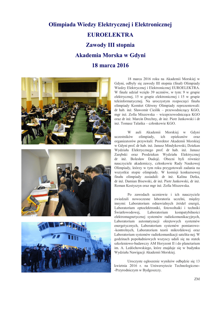 Olimpiada Wiedzy Elektrycznej i Elektronicznej EUROELEKTRA Zawody III stopnia Akademia Morska w Gdyni 18 marca 2016 18 marca 2016 roku na Akademii Morskiej w Gdyni, odbyły się zawody III stopnia (finał) Olimpiady Wiedzy Elektrycznej i Elektronicznej EUROELEKTRA. W finale udział wzięło 39 uczniów, w tym: 9 w grupie elektrycznej, 15 w grupie elektronicznej i 15 w grupie teleinformatycznej. Na uroczystym rozpoczęci finału olimpiady Komitet Główny Olimpiady reprezentowali: dr hab. inż. Sławomir Cieślik – przewodniczący KGO, mgr inż. Zofia Miszewska – wiceprzewodnicząca KGO oraz dr inż. Marcin Drechny, dr inż. Piotr Jankowski i dr inż. Tomasz Talaśka – członkowie KGO. W auli Akademii Morskiej w Gdyni uczestników olimpiady, ich opiekunów oraz organizatorów przywitali: Prorektor Akademii Morskiej w Gdyni prof. dr hab. inż. Janusz Mindykowski, Dziekan Wydziału Elektrycznego prof. dr hab. inż. Janusz Zarębski oraz Prodziekan Wydziału Elektrycznej dr inż. Bolesław Dudojć. Obecni byli również nauczyciele akademiccy, członkowie Rady Naukowej Olimpiady, którzy w tym roku przygotowali zadania na wszystkie stopie olimpiady. W komisji konkursowej finału olimpiady zasiadali: dr inż. Kalina Detka, dr inż. Damian Bisewski, dr inż. Piotr Jankowski, dr inż. Roman Kostyszyn oraz mgr inż. Zofia Miszewska. Po zawodach uczniowie i ich nauczyciele zwiedzali nowoczesne laboratoria uczelni, między innymi: Laboratorium odnawialnych źródeł energii, Laboratorium optoelektroniki, fotowoltaiki i techniki Światłowodowej, Laboratorium kompatybilności elektromagnetycznej systemów radiokomunikacyjnych, Laboratorium automatyzacji okrętowych systemów energetycznych, Laboratorium systemów pomiarowo-kontrolnych, Laboratorium teorii mikrofalowej oraz Laboratorium systemów radiokomunikacji satelita-nej. W godzinach popołudniowych wszyscy udali się na statek szkoleniowo-badawczy AM Horyzont II i do planetarium im. A. Ledóchowskiego, które znajduje się w budynku Wydziału Nawigacji Akademii Morskiej. Uroczyste ogłoszenie wyników odbędzie się 13 kwietnia 2016 r. na Uniwersytecie Technologiczno-Przyrodniczym w Bydgoszczy. ZM