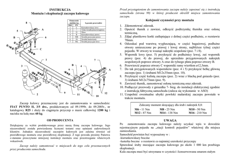 Przed przystąpieniem do zamontowania zaczepu należy zapoznać się z instrukcją samochodu (strona 99) w której producent określił miejsca zamontowania zaczepu. INSTRUKCJA Montażu i eksploatacji zaczepu kulowego Oznaczenie zacisku wg ISO PN 1 L 2 + 3 31 4 R 5 58R 6 54 7 58L 8 A 5 6 B Kolejność czynności przy montażu Łączenie przewodów Kierunkowskazy lewe Tylne światła przeciwmgłowe Masa Kierunkowskazy prawe Światła pozycyjne prawe Światła hamowania Światła pozycyjne lewe C 1 7 B 3 4 6 A C 2 9 11 12 10 Zaczep kulowy przeznaczony jest do zamontowania w samochodzie: FIAT PUNTO II, 3/5 drz., produkowanym od 09.1999r. do 09.2005r., nr katalogowy R25 i służy do ciągnięcia przyczep o masie całkowitej 1200 kg i nacisku na kulę max 60 kg. OD PRODUCENTA Dziękujemy za wybór produkowanego przez naszą firmę zaczepu kulowego. Jego niezawodność została potwierdzona licznymi testami oraz opiniami zadowolonych klientów. Jednakże niezawodność zaczepów kulowych jest zależna również od prawidłowego montażu oraz prawidłowej eksploatacji. Z tego powodu prosimy Państwa o staranne przeczytanie niniejszej instrukcji montażu oraz przestrzeganie właściwych wskazówek. Zaczep należy zamontować w miejscach do tego celu przeznaczonych przez producenta samochodu. 1. Zdemontować zderzak. 2. Opuścić tłumik z zawiesi, odkręcić podtrzymkę tłumika oraz osłonę termiczną. 3. Zdjąć plastikowe korki zaślepiające z dolnej części podłużnic, o rozstawie 70mm. 4. Odszukać pod warstwą wygłuszającą, w części bagażowej, podłużne otwory umieszczone po prawej i lewej strony, najbliższe tylnej części pojazdu. W otwory te wsunąć nakrętki zespolone (poz. 7 i 8). 5. Wspornik lewy (poz. 5) przykręcić do podłużnicy lewej, zaś wspornik prawy (poz. 4) do prawej, do uprzednio przygotowanych nakrętek zespolonych poprzez otwory A oraz do tylnego płata poprzez otwory B. 6. Przewiercić poprzez otwory C wsporniki ramy wiertłem ø12,5mm. 7. Do tak przygotowanych wsporników (poz. 4 i 5) przykręcić belkę główną zaczepu (poz. 1) śrubami M12x35mm (poz. 10). 8. Przykręcić część kulistą zaczepu (poz. 2) wraz z blachą pod gniazdo (poz. 3) śrubami M12x75mm (poz. 9). 9. Zawiesić tłumik, zamontować osłonę termiczną oraz zderzak. 10. Podłączyć przewody z gniazdka 7- bieg. do instalacji elektrycznej zgodnie z instrukcją fabryczną samochodu (zaleca się wykonanie w ASO) 11. Uzupełnić ewentualne ubytki powłoki malarskiej zaczepu powstałe w trakcie montażu. Zalecany moment skręcający dla śrub i nakrętek 8,8: M6 - 11 Nm M8 - 25 Nm M10 - 50 Nm M12 - 87 Nm M14 - 138 Nm M16 - 210 Nm UWAGA Po zamontowaniu zaczepu kulowego należy uzyskać wpis w dowodzie rejestracyjnym pojazdu na „stacji kontroli pojazdów” właściwej dla miejsca zamieszkania. Samochód powinien być wyposażony w : -kierunkowskazy boczne -lusterka boczne o rozstawie co najmniej szerokości przyczepy Sprawdzać śruby mocujące zaczepu kulowego po około 1 000 km przebiegu eksploatacji. Kula zaczepu musi być utrzymana w czystości i konserwowana smarem stałym PPUH AUTO-HAK Sp.J. Wyposażenie zaczepu: Produkcja Zaczepów Kulowych Henryk & Zbigniew Nejman 76-200 SŁUPSK ul. Słoneczna 16K tel/fax (059) 8-414-414; 8-414-413 E-mail: [email protected] www.autohak.com.pl Zaczep kulowy bez wyposażenia elektrycznego R25 Klasa: A50-X Nr kat. Przeznaczony do zamontowania w samochodzie: Producent: FIAT Model: PUNTO II Typ: 3/5 drz. produkowanym od 09.1999r. do 09.2005r. Dane techniczne: wartość siły D: 6,65 kN maksymalna masa przyczepy: 1200 kg maksymalny nacisk na kulę: 60 kg Numer homologacji zgodnie z wytycznymi regulaminu EKG/ONZ 55.01: E20-55R-01 0839 KARTA GWARANCYJNA Producent udziela gwarancji niniejszą kartą gwarancyjną na okres 24 miesięcy licząc od dnia zakupu zaczepu kulowego do samochodu: FIAT PUNTO II 3/5 drz. produkowanego od 09.1999r. do 09.2005r. Data produkcji .............................. Data zakupu............................................. Zakres gwarancji obejmuje wyłącznie wady jakościowe wynikające z winy producenta. Gwarancja nie obejmuje natomiast uszkodzeń zawinionych przez nabywcę, wynikających z niewłaściwego montażu, użytkowania lub konserwacji, uszkodzeń mechanicznych, normalnego zużycia podczas eksploatacji itp. Gwarancja udzielona na zakupiony towar nie wyłącza, nie ogranicza ani nie zawiesza uprawnień kupującego wynikających z niezgodności towaru z umową. Reklamacje należy zgłaszać w punkcie sprzedaży, składając jednocześnie kartę gwarancyjną. Usunięcie "wady" następuje po stwierdzeniu przez punkt sprzedaży wspólnie z producentem słuszności złożonej reklamacji. Reklamacja powinna być załatwiona w ciągu 14 dni od dnia uznania reklamacji. Karta gwarancyjna jest nieważna jeżeli nie jest wypełniona i podpisana. Data zgłoszenia reklamacji: ................................................................... INFORMACJA WSTĘPNA Zaczep kulowy jest skonstruowany zgodnie z zasadami bezpieczeństwa ruchu drogowego. Zaczep kulowy jest elementem wpływającym na bezpieczeństwo jazdy i może zostać zainstalowany wyłącznie przez personel wyspecjalizowany. Niedopuszczalne jest dokonywanie jakichkolwiek zmian w konstrukcji zaczepu. Powoduje to wygaśniecie dopuszczenia do stosowania. W przypadku obecności masy izolacyjnej lub osłony podwozia w miejscu przylegania zaczepu, należy ją usunąć. Nieosłonięte miejsca karoserii oraz wywiercone otwory należy pomalować farbą antykorozyjną. Informacjami wiążącymi odnośnie wartości obciążeń są dane podawane przez producenta samochodu, względnie wartości maksymalnej masy przyczepy oraz maksymalnego nacisku na kulę, przy czym wartości parametrów zaczepu kulowego nie mogą być przekroczone. Wzór do obliczania wartości siły D: Maks. masa przyczepy [kg] x Maks. masa samochodu [kg] Maks. masa przyczepy [kg] + Maks. masa samochodu [kg] X 9