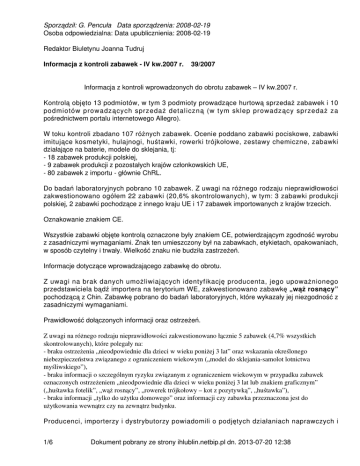 Sporządził: G. Pencuła Data sporządzenia: 2008-02-19 Osoba odpowiedzialna: Data upublicznienia: 2008-02-19 Redaktor Biuletynu Joanna Tudruj Informacja z kontroli zabawek - IV kw.2007 r. 39/2007 Informacja z kontroli wprowadzonych do obrotu zabawek – IV kw.2007 r. Kontrolą objęto 13 podmiotów, w tym 3 podmioty prowadzące hurtową sprzedaż zabawek i 10 podmiotów prowadzących sprzedaż detaliczną (w tym sklep prowadzący sprzedaż za pośrednictwem portalu internetowego Allegro). W toku kontroli zbadano 107 różnych zabawek. Ocenie poddano zabawki pociskowe, zabawki imitujące kosmetyki, hulajnogi, huśtawki, rowerki trójkołowe, zestawy chemiczne, zabawki działające na baterie, modele do sklejania, tj: - 18 zabawek produkcji polskiej, - 9 zabawek produkcji z pozostałych krajów członkowskich UE, - 80 zabawek z importu - głównie ChRL. Do badań laboratoryjnych pobrano 10 zabawek. Z uwagi na różnego rodzaju nieprawidłowości zakwestionowano ogółem 22 zabawki (20,6% skontrolowanych), w tym: 3 zabawki produkcji polskiej, 2 zabawki pochodzące z innego kraju UE i 17 zabawek importowanych z krajów trzecich. Oznakowanie znakiem CE. Wszystkie zabawki objęte kontrolą oznaczone były znakiem CE, potwierdzającym zgodność wyrobu z zasadniczymi wymaganiami. Znak ten umieszczony był na zabawkach, etykietach, opakowaniach, w sposób czytelny i trwały. Wielkość znaku nie budziła zastrzeżeń. Informacje dotyczące wprowadzającego zabawkę do obrotu. Z uwagi na brak danych umożliwiających identyfikację producenta, jego upoważnionego przedstawiciela bądź importera na terytorium WE, zakwestionowano zabawkę „wąż rosnący” pochodzącą z Chin. Zabawkę pobrano do badań laboratoryjnych, które wykazały jej niezgodność z zasadniczymi wymaganiami. Prawidłowość dołączonych informacji oraz ostrzeżeń. Z uwagi na różnego rodzaju nieprawidłowości zakwestionowano łącznie 5 zabawek (4,7% wszystkich skontrolowanych), które polegały na: - braku ostrzeżenia „nieodpowiednie dla dzieci w wieku poniżej 3 lat” oraz wskazania określonego niebezpieczeństwa związanego z ograniczeniem wiekowym („model do sklejania-samolot lotnictwa myśliwskiego”), - braku informacji o szczególnym ryzyku związanym z ograniczeniem wiekowym w przypadku zabawek oznaczonych ostrzeżeniem „nieodpowiednie dla dzieci w wieku poniżej 3 lat lub znakiem graficznym” („huśtawka fotelik”, „wąż rosnący”, „rowerek trójkołowy – kot z pozytywką”, „huśtawka”), - braku informacji „tylko do użytku domowego” oraz informacji czy zabawka przeznaczona jest do użytkowania wewnątrz czy na zewnątrz budynku. Producenci, importerzy i dystrybutorzy powiadomili o podjętych działaniach naprawczych i 1/6 Dokument pobrany ze strony ihlublin.netbip.pl dn. 2013-07-20 12:38 zobowiązali się do dołożenia starań, aby wprowadzane do obrotu zabawki posiadały wszystkie wymagane informacje i ostrzeżenia. Zgodność zabawek z zasadniczymi wymaganiami Informacje warunkujące bezpieczne użytkowanie zabawek. W powyższym zakresie zakwestionowano 13 zabawek, co stanowi 12,2% wszystkich skontrolowanych. Stwierdzone niezgodności polegały na: 1) braku instrukcji używania zabawek bateryjnych Całkowity brak instrukcji w języku polskim, w której powinny być zawarte informacje mające wpływ na bezpieczeństwo używania zabawek na baterie stwierdzono w przypadku: - zabawki „rowerek trójkołowy – Piesek” z zamontowaną w układzie kierowniczym pozytywką działającą na baterie, - 4 zabawek produkcji chińskiej (2 zabawek edukacyjnych „komputer”, zabawki muzycznej „pianino”, zestawu do zabawy „pralka”). Importerzy dosłali brakujące instrukcje, które zawierały wszystkie wymagane informacje i poinformowali, że niezgodność została wyeliminowana we wszystkich wyrobach wprowadzonych do obrotu. Do organu ścigania skierowano zawiadomienie o podejrzeniu popełnienia przestępstwa z art. 45 ustawy o systemie oceny zgodności w sprawie wprowadzenia do obrotu zabawek niezgodnych z zasadniczymi wymaganiami 2) braku instrukcji używania niezbędnej ze względów bezpieczeństwa W powyższym zakresie zakwestionowano: - zabawkę „huśtawka fotelik” produkcji węgierskiej z uwagi na brak w języku polskim instrukcji używania, zaleceń dotyczących przeprowadzania okresowych kontroli oraz ostrzeżenia o następstwach nieprzestrzegania tego wymogu (na spodzie huśtawki zamieszczona była etykieta, która zawierała informacje wyłącznie w języku węgierskim). Wstrzymano sprzedaż 6 szt. Huśtawek, do czasu dołączenia do nich wymaganej instrukcji. Do kontrolowanej jednostki przesłano sporządzoną w języku polskim instrukcję. Ponadto instrukcje montażu wraz z zaleceniami regularnej konserwacji przesłane zostały do wszystkich dotychczasowych odbiorców przedmiotowej zabawki. - zabawkę „huśtawka bezpieczna”, przy sprawdzeniu której stwierdzono brak ostrzeżeń oraz instrukcji montażu i konserwacji huśtawki. Zabawka, z uwagi na stwierdzenie jej niezgodności z zasadniczymi wymaganiami i prowadzone przez GIIH postępowanie administracyjne, wycofywana jest z rynku. 3) braku instrukcji użytkowania zwracającej uwagę na niebezpieczeństwo używania innych pocisków niż dostarczone z zabawką lub zalecone przez producenta W powyższym zakresie zakwestionowano zabawkę „zestaw broni” oraz zabawkę „zestaw wojskowy”. 2/6 Dokument pobrany ze strony ihlublin.netbip.pl dn. 2013-07-20 12:38 Przedsiębiorcom umożliwiono podjęcie działań naprawczych zobowiązując ich jednocześnie do usunięcia niezgodności we wszystkich wyrobach znajdujących się w obrocie handlowym. Importerzy dosłali kontrahentom naklejki z tekstem „Uwaga! Używać do wystrzeliwania tylko załączone pociski, nie używać do wystrzeliwania innych pocisków, niż załączone.” Brak instrukcji zwracającej uwagę na niebezpieczeństwo używania innych poci