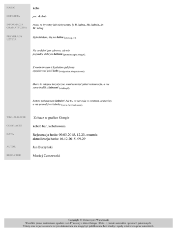 HASŁO kebs DEFINICJA pot. «kebab» INFORMACJA GRAMATYCZNA rzecz. m żywotny lub nieżywotny, lp D. kebsa, Ms. kebsie, lm M. kebsy PRZYKŁADY UŻYCIA Zgłodniałem, idę na kebsa (showup.tv). Na co dzień jem zdrowo, ale nie pogardzę dobrym kebsem (proteincouple.blog.pl). Z moim bratem i Szakalem jedziemy opędzlować jakiś kebs (widgetcior.blogspot.com). Skoro to miejsce turystyczne, musi tam być jakaś restauracja, a nie same budki z kebsami (vitalia.pl). Jestem pożeraczem kebsów! Ale to, co serwują w centrum, to trociny, a nie prawdziwe kebaby (www.facebook.com). WIZUALIZACJE Zobacz w grafice Google ODSYŁACZE kebab bar, kebabownia DATA Rejestracja hasła: 09.03.2015, 12.23, ostatnia aktualizacja hasła: 16.12.2015, 09.29 AUTOR Jan Burzyński REDAKTOR Maciej Czeszewski Copyright © Uniwersytet Warszawski Wszelkie prawa zastrzeżone zgodnie z art.17 ustawy z dnia 4 lutego 1994 r. o prawie autorskim i prawach pokrewnych. Teksty oraz zdjęcia zawarte w tym dokumencie nie mogą być publikowane bez wiedzy i zgody właściciela praw autorskich. Powered by TCPDF (www.tcpdf.org)