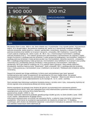 DOM na SPRZEDAŻ 1 900 000 Łomianki Dolne 300 m2 1541/2145/ODS 2000 280 2004 6 Detached Asphalt Opis Murowany Dom o pow. 300 m. kw. Dom składa się z 3 poziomów: I-szy wysoki parter, II-gi pierwsze piętro, III-ci drugie piętro. Na parterze znajdują się: garaż na 2 samochody osobowe (podłoga pokryta terakotą), pokój dzienny z oknem, garderoba z okienkiem, łazienka z oknem z podłogą pokrytą terakotą oraz kafelki na ścianach (prysznic, umywalka, WC) kotłownia i suszarnia. Na I-szym piętrze znajdują się: salon o pow. ok. 38 m. kw. z marmurowym kominkiem z podłogą pokrytą terakotą oraz 2 - ma matami grzewczymi pod terakotą z termostatami do regulacji ciepła, wnęka kuchenna z podłogą pokrytą terakotą z matą grzewczą podłogową z termostatem, jadalnia z podłogą pokrytą terakotą z matą grzewczą pod nią z termostatem, łazienka (prysznic, umywalka, WC) z podłogą podgrzewaną matą grzewczą z termostatem oraz kafelkami na ścianach oraz pralką automatyczną, przedpokój pokryty terakotą z matą grzewczą z termostatem, wiatrołap z garderobą. Na II-gim piętrze znajdują się: 4-ry pokoje (dwie sypialnie i dwa pokoje dzienne), przedpokój, łazienka (wanna duża "basenowa", dwie umywalki, WC) z podłogą pokrytą terakotą oraz z matą grzewczą z termostatem oraz z kafelkami na ścianach. Poddasze jest ocieplone wełną mineralną. Dojazd do posesji jest drogą asfaltową, w domu jest zainstalowany gaz (piec gazowy kondensacyjny jest nadal na gwarancji) do ogrzewania CO oraz ciepłej wody, do posesji doprowadzona jest końcówka do zainstalowania wody "miejskiej". Obecnie jest własna studnia (pompa, hydrofor), ścieki odprowadzane są do dużego ok. 12 m. sześć. szamba. Dom posiada dwa betonowe wyłożone terakotą tarasy z przodu oraz z tyłu, rozsuwaną markizę od strony ogrodu oraz przeszkloną altanę od strony ogrodu. Brama wjazdowa na posesję oraz brama do garażu są automatycznie sterowane pilotem (urządzenia firmy Nice). Dom jest zabezpieczony anty-włamaniowo systemem elektronicznym wewnętrznym oraz ochroną firmy Solid Security. powierzchna działki i 2000 m. kw. Istnieje możliwość dokonania podziału geodezyjnego działki gruntu na dwie działki o pow. 1000 m.kw. każda i dobudowanie drugiego domu. Informacje zamieszczone na stronie nie stanowią oferty, a jedynie mają charakter reklamowy i poglądowy. Informacje te są jedynie zaproszeniem do zawarcia umowy (art. 71 Kodeksu cywilnego). Jeśli chcesz się dokładnie zapoznać z warunkami transakcji to zadzwoń 725 333 233 lub odwiedź nasze biuro www.liderhaus.pl Lider Haus Sp. z o.o. Mateusz Barcz tel. 884600266 tel. 226200366 email: [email protected] Lider Haus Sp. z o.o. Powered by TCPDF (www.tcpdf.org)