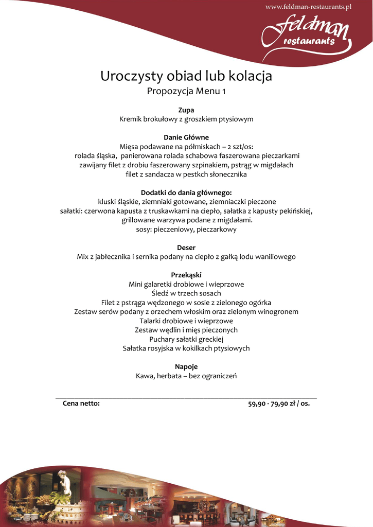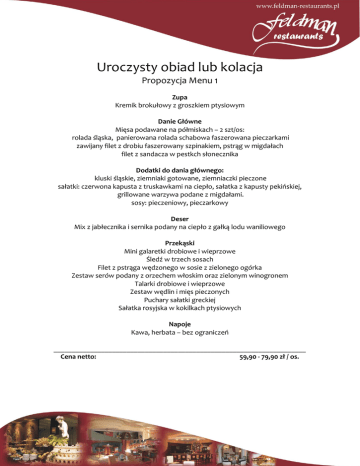 Uroczysty obiad lub kolacja Propozycja Menu 1 Zupa Kremik brokułowy z groszkiem ptysiowym Danie Główne Mięsa podawane na półmiskach – 2 szt/os: rolada śląska, panierowana rolada schabowa faszerowana pieczarkami zawijany filet z drobiu faszerowany szpinakiem, pstrąg w migdałach filet z sandacza w pestkch słonecznika Dodatki do dania głównego: kluski śląskie, ziemniaki gotowane, ziemniaczki pieczone sałatki: czerwona kapusta z truskawkami na ciepło, sałatka z kapusty pekińskiej, grillowane warzywa podane z migdałami. sosy: pieczeniowy, pieczarkowy Deser Mix z jabłecznika i sernika podany na ciepło z gałką lodu waniliowego Przekąski Mini galaretki drobiowe i wieprzowe Śledź w trzech sosach Filet z pstrąga wędzonego w sosie z zielonego ogórka Zestaw serów podany z orzechem włoskim oraz zielonym winogronem Talarki drobiowe i wieprzowe Zestaw wędlin i mięs pieczonych Puchary sałatki greckiej Sałatka rosyjska w kokilkach ptysiowych Napoje Kawa, herbata – bez ograniczeń _____________________________________________________________________ Cena netto: 59,90 - 79,90 zł / os. Uroczysty obiad lub kolacja Propozycja Menu 2 Przystawka Polędwiczki wieprzowe BBQ w cieście cygaretkowym podane z sosem salsa Zupa Zupa grzybowa z mini łazankami Danie Główne Mięsa podawane na półmiskach – 2 szt/os: drobiowe kieszonki z nadzieniem z suszonych pomidorów i serem mozzarella, chrupiący sznycel wieprzowy, roladki z mięciutkiej wołowiny po śląsku, pierś z dzikiej kaczki w sosie amerykańskiej jagody, delikatne żeberka z młodego wieprza w papilotach, filet z sandacza w pestkach słonecznika Dodatki do dania głównego: kluski śląskie, ziemniaki opiekane, ryż po tajsku surówki: czerwona kapusta z truskawkami na ciepło, sałatka grecka, grillowane warzywa podane z migdałami. sosy: pieczeniowy, z zielonego pieprzu. Deser Jabłka w cynamonowym cieście podane z gałką lodu waniliowego i bitą śmietaną Przekąski Aromatyczne pieczenie podane na zimno Wędliny po staropolsku wedzone i parzone Wybór serów twardych i pleśniowych Tatar z łososia na chrupiących grzankach podany Śledzie w czerwonym winie i przyprawach korzennych Talarki wieprzowe i drobiowe faszerowane Babeczki z kruchego ciasta ze smakowitymi pastami Kuleczki sera mozarella w formie koreczków z pomidorem i listkami świeżej bazylii Sałatka kartoflana z sosem ogrodowym Coctail z krewetek na rzymskiej sałacie Roladki z pieca z szynki ze szparagami Tortilla z farszem warzywnym Pieczywo coctailowe Kolacja Filet drobiowy Dijon z placuszkami ziemniaczanymi i fasolką szparagową skropioną klarownym masłem z tartą bułką Napoje Kawa, herbata – bez ograniczeń Coca, Cola, Sprite, Fanta – bez ograniczeń Soki owocowe, woda mineralna – bez ograniczeń _____________________________________________________________________ Cena netto: 99,90 - 139,90 zł / os.