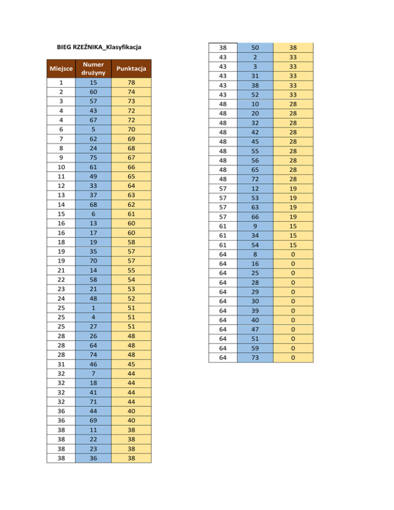 BIEG RZEŹNIKA_Klasyfikacja Miejsce 1 2 3 4 4 6 7 8 9 10 11 12 13 14 15 16 16 18 19 19 21 22 23 24 25 25 25 28 28 28 31 32 32 32 32 36 36 38 38 38 38 Numer drużyny 15 60 57 43 67 5 62 24 75 61 49 33 37 68 6 13 17 19 35 70 14 58 21 48 1 4 27 26 64 74 46 7 18 41 71 44 69 11 22 23 36 Punktacja 78 74 73 72 72 70 69 68 67 66 65 64 63 62 61 60 60 58 57 57 55 54 53 52 51 51 51 48 48 48 45 44 44 44 44 40 40 38 38 38 38 38 43 43 43 43 43 48 48 48 48 48 48 48 48 48 57 57 57 57 61 61 61 64 64 64 64 64 64 64 64 64 64 64 64 50 2 3 31 38 52 10 20 32 42 45 55 56 65 72 12 53 63 66 9 34 54 8 16 25 28 29 30 39 40 47 51 59 73 38 33 33 33 33 33 28 28 28 28 28 28 28 28 28 19 19 19 19 15 15 15 0 0 0 0 0 0 0 0 0 0 0 0