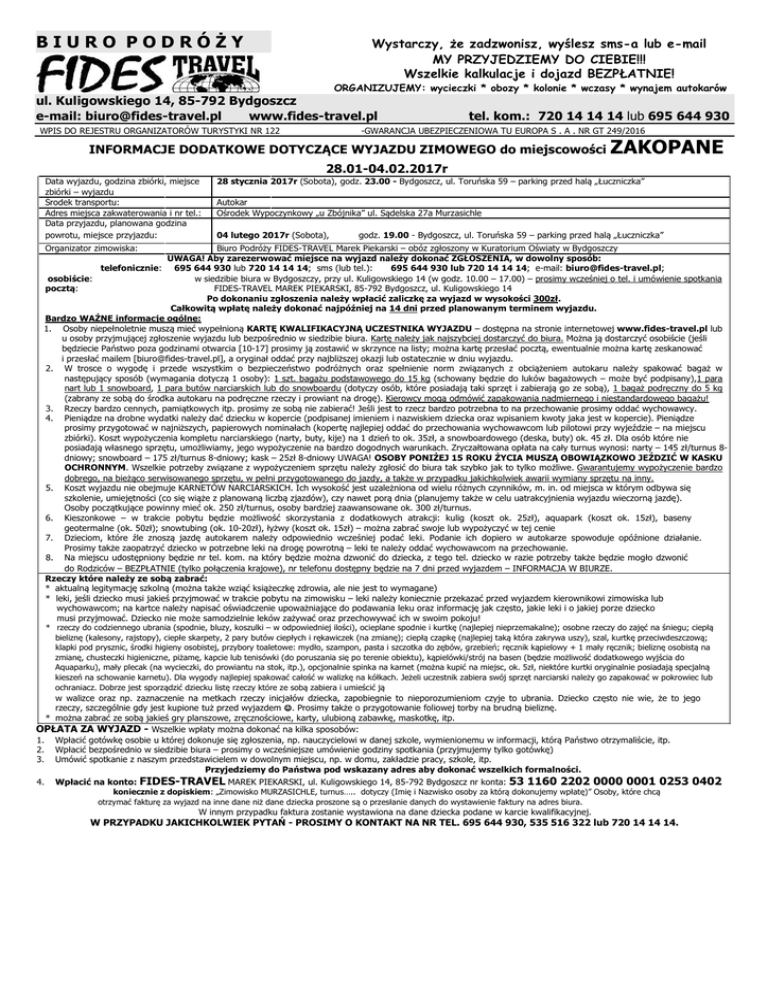 BIURO PODRÓŻY Wystarczy, że zadzwonisz, wyślesz sms-a lub e-mail MY PRZYJEDZIEMY DO CIEBIE!!! Wszelkie kalkulacje i dojazd BEZPŁATNIE! ORGANIZUJEMY: wycieczki * obozy * kolonie * wczasy * wynajem autokarów ul. Kuligowskiego 14, 85-792 Bydgoszcz e-mail: [email protected] www.fides-travel.pl WPIS DO REJESTRU ORGANIZATORÓW TURYSTYKI NR 122 tel. kom.: 720 14 14 14 lub 695 644 930 -GWARANCJA UBEZPIECZENIOWA TU EUROPA S . A . NR GT 249/2016 INFORMACJE DODATKOWE DOTYCZĄCE WYJAZDU ZIMOWEGO do miejscowości Data wyjazdu, godzina zbiórki, miejsce zbiórki – wyjazdu Środek transportu: Adres miejsca zakwaterowania i nr tel.: Data przyjazdu, planowana godzina powrotu, miejsce przyjazdu: 28.01-04.02.2017r ZAKOPANE 28 stycznia 2017r (Sobota), godz. 23.00 - Bydgoszcz, ul. Toruńska 59 – parking przed halą „Łuczniczka” Autokar Ośrodek Wypoczynkowy „u Zbójnika” ul. Sądelska 27a Murzasichle 04 lutego 2017r (Sobota), godz. 19.00 - Bydgoszcz, ul. Toruńska 59 – parking przed halą „Łuczniczka” Organizator zimowiska: Biuro Podróży FIDES-TRAVEL Marek Piekarski – obóz zgłoszony w Kuratorium Oświaty w Bydgoszczy UWAGA! Aby zarezerwować miejsce na wyjazd należy dokonać ZGŁOSZENIA, w dowolny sposób: telefonicznie: 695 644 930 lub 720 14 14 14; sms (lub tel.): 695 644 930 lub 720 14 14 14; e-mail: [email protected]; osobiście: w siedzibie biura w Bydgoszczy, przy ul. Kuligowskiego 14 (w godz. 10.00 – 17.00) – prosimy wcześniej o tel. i umówienie spotkania pocztą: FIDES-TRAVEL MAREK PIEKARSKI, 85-792 Bydgoszcz, ul. Kuligowskiego 14 Po dokonaniu zgłoszenia należy wpłacić zaliczkę za wyjazd w wysokości 300zł. Całkowitą wpłatę należy dokonać najpóźniej na 14 dni przed planowanym terminem wyjazdu. Bardzo WAŻNE informacje ogólne: 1. Osoby niepełnoletnie muszą mieć wypełnioną KARTĘ KWALIFIKACYJNĄ UCZESTNIKA WYJAZDU – dostępna na stronie internetowej www.fides-travel.pl lub u osoby przyjmującej zgłoszenie wyjazdu lub bezpośrednio w siedzibie biura. Kartę należy jak najszybciej dostarczyć do biura. Można ją dostarczyć osobiście (jeśli będziecie Państwo poza godzinami otwarcia [10-17] prosimy ją zostawić w skrzynce na listy; można kartę przesłać pocztą, ewentualnie można kartę zeskanować i przesłać mailem [[email protected]], a oryginał oddać przy najbliższej okazji lub ostatecznie w dniu wyjazdu. 2. W trosce o wygodę i przede wszystkim o bezpieczeństwo podróżnych oraz spełnienie norm związanych z obciążeniem autokaru należy spakować bagaż w następujący sposób (wymagania dotyczą 1 osoby): 1 szt. bagażu podstawowego do 15 kg (schowany będzie do luków bagażowych – może być podpisany),1 para nart lub 1 snowboard, 1 para butów narciarskich lub do snowboardu (dotyczy osób, które posiadają taki sprzęt i zabierają go ze sobą), 1 bagaż podręczny do 5 kg (zabrany ze sobą do środka autokaru na podręczne rzeczy i prowiant na drogę). Kierowcy mogą odmówić zapakowania nadmiernego i niestandardowego bagażu! 3. Rzeczy bardzo cennych, pamiątkowych itp. prosimy ze sobą nie zabierać! Jeśli jest to rzecz bardzo potrzebna to na przechowanie prosimy oddać wychowawcy. 4. Pieniądze na drobne wydatki należy dać dziecku w kopercie (podpisanej imieniem i nazwiskiem dziecka oraz wpisaniem kwoty jaka jest w kopercie). Pieniądze prosimy przygotować w najniższych, papierowych nominałach (kopertę najlepiej oddać do przechowania wychowawcom lub pilotowi przy wyjeździe – na miejscu zbiórki). Koszt wypożyczenia kompletu narciarskiego (narty, buty, kije) na 1 dzień to ok. 35zł, a snowboardowego (deska, buty) ok. 45 zł. Dla osób które nie posiadają własnego sprzętu, umożliwiamy, jego wypożyczenie na bardzo dogodnych warunkach. Zryczałtowana opłata na cały turnus wynosi: narty – 145 zł/turnus 8dniowy; snowboard – 175 zł/turnus 8-dniowy; kask – 25zł 8-dniowy UWAGA! OSOBY PONIŻEJ 15 ROKU ŻYCIA MUSZĄ OBOWIĄZKOWO JEŹDZIĆ W KASKU OCHRONNYM. Wszelkie potrzeby związane z wypożyczeniem sprzętu należy zgłosić do biura tak szybko jak to tylko możliwe. Gwarantujemy wypożyczenie bardzo dobrego, na bieżąco serwisowanego sprzętu, w pełni przygotowanego do jazdy, a także w przypadku jakichkolwiek awarii wymiany sprzętu na inny. 5. Koszt wyjazdu nie obejmuje KARNETÓW NARCIARSKICH. Ich wysokość jest uzależniona od wielu różnych czynników, m. in. od miejsca w którym odbywa się szkolenie, umiejętności (co się wiąże z planowaną liczbą zjazdów), czy nawet porą dnia (planujemy także w celu uatrakcyjnienia wyjazdu wieczorną jazdę). Osoby początkujące powinny mieć ok. 250 zł/turnus, osoby bardziej zaawansowane ok. 300 zł/turnus. 6. Kieszonkowe – w trakcie pobytu będzie możliwość skorzystania z dodatkowych atrakcji: kulig (koszt ok. 25zł), aquapark (koszt ok. 15zł), baseny geotermalne (ok. 50zł); snowtubing (ok. 10-20zł), łyżwy (koszt ok. 15zł) – można zabrać swoje lub wypożyczyć w tej cenie 7. Dzieciom, które źle znoszą jazdę autokarem należy odpowiednio wcześniej podać leki. Podanie ich dopiero w autokarze spowoduje opóźnione działanie. Prosimy także zaopatrzyć dziecko w potrzebne leki na drogę powrotną – leki te należy oddać wychowawcom na przechowanie. 8. Na miejscu udostępniony będzie nr tel. kom. na który będzie można dzwonić do dziecka, z tego tel. dziecko w razie potrzeby także będzie mogło dzwonić do Rodziców – BEZPŁATNIE (tylko połączenia krajowe), nr telefonu dostępny będzie na 7 dni przed wyjazdem – INFORMACJA W BIURZE. Rzeczy które należy ze sobą zabrać: * aktualną legitymację szkolną (można także wziąć książeczkę zdrowia, ale nie jest to wymagane) * leki, jeśli dziecko musi jakieś przyjmować w trakcie pobytu na zimowisku – leki należy koniecznie przekazać przed wyjazdem kierownikowi zimowiska lub wychowawcom; na kartce należy napisać oświadczenie upoważniając