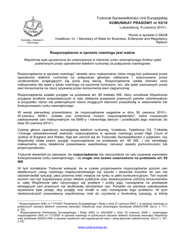 Trybunał Sprawiedliwości Unii Europejskiej KOMUNIKAT PRASOWY nr 53/10 Luksemburg, 8 czerwca 2010 r. Kontakty z Mediami i Informacja Wyrok w sprawie C-58/08 Vodafone i in. / Secretary of State for Business, Enterprise and Regulatory Reform Rozporządzenie w sprawie roamingu jest ważne Wspólnota była uprawniona do ustanowienia w interesie rynku wewnętrznego limitów opłat pobieranych przez operatorów telefonii ruchomej za połączenia roamingowe Rozporządzenie w sprawie roamingu1 określa ceny maksymalne, które mogą być pobierane operatorów telefonii ruchomej za połączenia głosowe odbierane i wykonywane użytkowników znajdujących się poza swą siecią. Rozporządzenie ustala również maksymalne dla opłat z tytułu roamingu na poziomie hurtowym, tzn. dla opłat uiszczanych sieć konsumenta na rzecz używanej przez konsumenta sieci zagranicznej. przez przez ceny przez Rozporządzenie zostało przyjęte na podstawie art. 95 traktatu WE, który umożliwia Wspólnocie przyjęcie środków prawodawczych w celu zbliżenia przepisów prawnych państw członkowskich w przypadku różnic lub potencjalnych różnic mogących stanowić przeszkodę w ustanowieniu lub funkcjonowaniu rynku wewnętrznego. W wersji pierwotnej przewidziano, że rozporządzenie wygaśnie w dniu 30 czerwca 2010 r. W czerwcu 2009 r. zostało ono zmienione nowym rozporządzeniem2, które rozszerzyło zastosowanie cen maksymalnych na SMS-y i transmisję danych i przedłużyło jego ważność do dnia 30 czerwca 2012 r. Czterej główni operatorzy europejskiej telefonii ruchomej, Vodafone, Telefónica O2, T-Mobile i Orange zakwestionowali ważność rozporządzenia w sprawie roamingu przed High Court of Justice of England and Wales. Sąd ten zwrócił się do Trybunału Sprawiedliwości z pytaniem, czy Wspólnota miała prawo przyjąć rozporządzenie na podstawie art. 95 WE, i czy określając maksymalne ceny detaliczne prawodawca wspólnotowy naruszył zasady pomocniczości lub proporcjonalności. Trybunał stwierdził po pierwsze, że rozporządzenie ma rzeczywiście na celu poprawę warunków funkcjonowania rynku wewnętrznego, i że mogło ono zostać ustanowione na podstawie art. 95 WE. W tym kontekście Trybunał wskazał, że w czasie przyjmowania rozporządzenia poziom cen detalicznych usług roamingu międzynarodowego był wysoki i stosunek kosztów do cen nie odzwierciedlał sytuacji, jaka powinna mieć miejsce na rynku w pełni konkurencyjnym. Ten wysoki poziom cen był rozpatrywany przez władze publiczne oraz stowarzyszenia ochrony konsumentów w całej Wspólnocie jako utrzymujący się problem i próby jego rozwiązania na podstawie istniejących ram prawnych nie skutkowały obniżeniem cen. Ponadto na państwa członkowskie wywierana była presja, aby podjęły one środki w celu rozwiązania tego problemu. W tych okolicznościach prawodawca wspólnotowy miał do czynienia z konkretną sytuacją, w której 1 Rozporządzenie (WE) nr 717/2007 Parlamentu Europejskiego i Rady z dnia 27 czerwca 2007 r. w sprawie roamingu w publicznych sieciach telefonii ruchomej wewnątrz Wspólnoty oraz zmieniające dyrektywę 2002/21/WE (Dz.U. L 171, s. 32). 2 Rozporządzenie Parlamentu Europejskiego i Rady (WE) nr 544/2009 z dnia 18 czerwca 2009 r. zmieniające rozporządzenie (WE) nr 717/2007 w sprawie roamingu w publicznych sieciach telefonii ruchomej wewnątrz Wspólnoty oraz dyrektywę 2002/21/WE w sprawie wspólnych ram regulacyjnych sieci i usług łączności elektronicznej (Dz.U. L 167, s.12). www.curia.europa.eu prawdopodobne było przyjęcie rozbieżnych środków krajowych zmierzających do obniżenia cen detalicznych bez wpłynięcia na ceny hurtowe. Jednakże taki rozwój mógł spowodować znaczne zakłócenia konkurencji i zaburzenia właściwego funkcjonowania rynku roamingu wspólnotowego, co uzasadniało ustanowienie rozporządzenia na podstawie art. 95 WE dobrego celu ochrony prawidłowego funkcjonowania rynku wewnętrznego. Po drugie, odnośnie do proporcjonalności rozporządzenia – w zakresie, w jakim określa ono nie tylko ceny maksymalne dla opłat hurtowych, lecz również dla opłat detalicznych – Trybunał stwierdził, że maksymalne ceny detaliczne mogą być uznane za właściwe i konieczne dla ochrony konsumentów przed wysokim poziomem cen. Trybunał przypomniał, że przed opracowaniem projektu rozporządzenia Komisja przeprowadziła wyczerpującą analizę rozwiązań i dokonała oceny wpływu gospodarczego różnych rodzajów regulacji. W okresie przyjmowania rozporządzenia poziom średniej opłaty za połączenie w ramach roamingu we Wspólnocie był wysoki (1,15 EUR za minutę, czyli ponad pięć razy więcej niż rzeczywisty koszt hurtowego świadczenia usługi) i stosunek kosztów do cen nie odzwierciedlał sytuacji, jaka powinna mieć miejsce na rynku w pełni konkurencyjnym. Taryfa przewidziana w rozporządzeniu jest znacznie niższa od tej średniej opłaty i orientuje się według hurtowych cen maksymalnych, tak aby opłaty detaliczne bardziej precyzyjnie odzwierciedlały koszty ponoszone przez operatorów. Ponadto prawodawca wspólnotowy mógł zasadnie stwierdzić, że uregulowanie jedynie rynków hurtowych nie doprowadziłoby do tego samego rezultatu, co sporne rozporządzenie. Obniżka opłat hurtowych niekoniecznie gwarantowałaby obniżenie opłat detalicznych, mając na uwadze, że operatorzy nie są poddani jakiejkolwiek presji konkurencyjnej, bowiem dla większości konsumentów roaming nie odgrywa decydującej roli przy wyborze operatora. Poza tym uregulowanie wyłącznie opłat hurtowych nie odniosłoby bezpośrednich i natychmiastowych skutków dla konsumentów. Wreszcie Trybunał stwierdził, że przyjęte środki mają charakter wyjątkowy, co jest uzasadnione specyficzną charakterystyką, jaką odznaczają się rynki roamingu. W tych okolicznościach interwencja dokonana na rynku podlegającym konkurencji, ograniczona w czasie i pozwalająca na naty