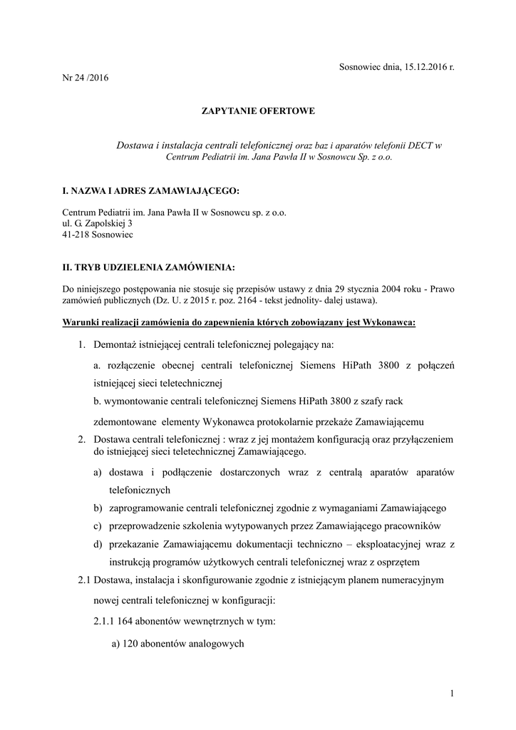 Sosnowiec dnia, 15.12.2016 r. Nr 24 /2016 ZAPYTANIE OFERTOWE Dostawa i instalacja centrali telefonicznej oraz baz i aparatów telefonii DECT w Centrum Pediatrii im. Jana Pawła II w Sosnowcu Sp. z o.o. I. NAZWA I ADRES ZAMAWIAJĄCEGO: Centrum Pediatrii im. Jana Pawła II w Sosnowcu sp. z o.o. ul. G. Zapolskiej 3 41-218 Sosnowiec II. TRYB UDZIELENIA ZAMÓWIENIA: Do niniejszego postępowania nie stosuje się przepisów ustawy z dnia 29 stycznia 2004 roku - Prawo zamówień publicznych (Dz. U. z 2015 r. poz. 2164 - tekst jednolity- dalej ustawa). Warunki realizacji zamówienia do zapewnienia których zobowiązany jest Wykonawca: 1. Demontaż istniejącej centrali telefonicznej polegający na: a. rozłączenie obecnej centrali telefonicznej Siemens HiPath 3800 z połączeń istniejącej sieci teletechnicznej b. wymontowanie centrali telefonicznej Siemens HiPath 3800 z szafy rack zdemontowane elementy Wykonawca protokolarnie przekaże Zamawiającemu 2. Dostawa centrali telefonicznej : wraz z jej montażem konfiguracją oraz przyłączeniem do istniejącej sieci teletechnicznej Zamawiającego. a) dostawa i podłączenie dostarczonych wraz z centralą aparatów aparatów telefonicznych b) zaprogramowanie centrali telefonicznej zgodnie z wymaganiami Zamawiającego c) przeprowadzenie szkolenia wytypowanych przez Zamawiającego pracowników d) przekazanie Zamawiającemu dokumentacji techniczno – eksploatacyjnej wraz z instrukcją programów użytkowych centrali telefonicznej wraz z osprzętem 2.1 Dostawa, instalacja i skonfigurowanie zgodnie z istniejącym planem numeracyjnym nowej centrali telefonicznej w konfiguracji: 2.1.1 164 abonentów wewnętrznych w tym: a) 120 abonentów analogowych 1 b) 40 abonentów VoIP c) 4 abonentów systemowych 2.2 1 port łącza miejskiego ISDN PRA 30B+D 2.3 system zapowiedzi słownej IVR 2.4 system nagrywania rozmów 2.5 zarządzanie przez przeglądarkę www 2.6 system taryfikacyjny zawierający oprogramowanie i bufor 2.7 Dwa aparaty systemowe awizo w tym: a) 1 aparat systemowy awizo z kolorowym wyświetlaczem i co najmniej 19 przyciskami programowalnymi z możliwością rozszerzenia do co najmniej 40 przycisków programowalnych b) 1 dodatkowa konsola do aparatu systemowego awizo z co najmniej 38 przyciskami programowalnymi c) 1 aparat systemowy awizo z czteroliniowym wyświetlaczem i co najmniej 8 przyciskami programowalnymi 3. Dostawa, instalacja i skonfigurowanie zgodnie z istniejącym planem numeracyjnym w nowej centrali telefonicznej telefonii DECT IP w konfiguracji: 3.1 12 stacji bazowych 3.2 20 aparatów telefonicznych 3.3 zalogowanie aparatów telefonicznych do systemu 4. Warunki wykonania demontażu istniejącej centrali telefonicznej i instalacji nowej 4.1 Przełączenie centrali, po uprzednim uzgodnieniu z Zamawiającym zostanie wykonane w dniach od ................................... tj od dnia .......... 2016r. od godz.: .................. do dnia ................................. 2016r. do godz. ...................., w sposób , który nie spowoduje przerw w pracy Centrum Pediatrii. im. Jana Pawła II w Sosnowcu sp. z.o.o 4.2 na czas trwania przełączenia zapewnienie podłączenia numerów na liniach 2 analogowych w następujących punktach: a) Portiernia b) Sekretariat c) Oddział Anestezjologii i Intensywnej Terapii d) Izba Przyjęć 4.3 Przerwa w braku łączności nie może trwać dłużej niż 30 minut 5. Wymagania techniczne dotyczące centrali: 5.1 Możliwość wynoszenia modułu przy pomocy sieci IP. Tworzenie systemu o architekturze rozproszonej 5.2 Możliwość rozbudowy: a) rozbudowa nie może powodować konieczności wymiany już zainstalowanych modułów b) możliwość rozbudowy do 1000 użytkowników (abonentów) obsługiwanych w ramach jednego systemu 5.3 Wszystkie elementy systemu powinny być przystosowane do montażu w szafie w standardzie 19” 5.4 System powinien być wyposażony w zasilanie awaryjne 5.5 W przypadku awarii wentylatorów system powinien zapewniać dużą tolerancję temperaturową (wentylacja grawitacyjna) 5.6 Wymiana modułów abonenckich bez potrzeby wyłączenia jednostki głównej 5.7 Moduły telefonii IP powinny umożliwiać obsługę konwersji mediów (w ramach wspólnych zasobów IP) dla: a) połączeń między modułami, b) linii abonenckich IP (SIP), c) linii zewnętrznych IP (SIP) 5.8 Możliwość podłączenia terminali IP innych producentów w oparciu o otwarte protokoły: 3 a) H.323 (zdefiniowany przez ITU-T), b) SIP (zdefiniowany przez IETF) 5.9 System powinien umożliwiać szyfrowanie rozmów i sygnalizacji w przypadku telefonii IP przy pomocy standardowych protokołów szyfrujących: TLS i SRTP 5.9.1 System powinien generować rekordy taryfikacyjne przez różne typy interfejsów: np. V.24, TCP/IP, w postaci pliku przechowywanego w pamięci masowej systemu. W przypadku przechowywania rekordów taryfikacyjnych w postaci plików system powinien umożliwiać pobranie ich przez oprogramowanie taryfikacyjne w oparciu o standardowe protokoły sieciowe: FTP, TFTP, SFTP, SCP 5.9.2 System powinien wspierać otwarte standardy współpracy z systemami innych producentów i siecią publiczną SIP i DSS1 5.9.3 Możliwość podłączenia linie abonenckich analogowych i systemowych do systemu za pomocą jednej pary przewodów 5.9.4 System powinien umożliwiać zestawianie konferencji przez każdego abonenta systemu dla minimalnie 8 użytkowników 5.9.5 Wybór najtańszej drogi połączenia (Least Cost Routing) – system automatycznie może wybrać najbardziej opłacalną drogę połączenia na podstawie wprowadzonego numeru w powiązaniu z porą dnia lub dniem tygodnia 5.9.6 System powinien umożliwiać kierowanie wywołań przychodzących po godzinach pracy szpitala na określone numery wewnętrzne, np. pocztę głosową lub system zgłoszeniowy. Tryb nocny uruchamiany jest gdy: a) z konsoli operatora uruchomiona została procedura trybu nocnego b) nadszedł czas (zdefiniowany w systemie) trybu nocnego 5.9.7 