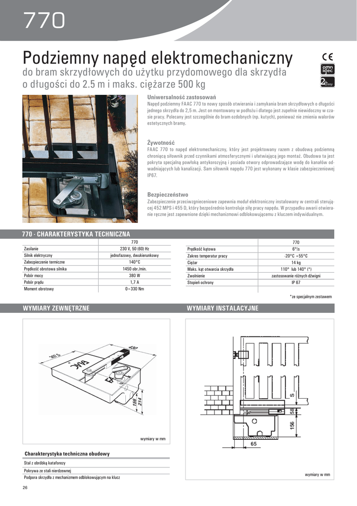 770 Podziemny napd elektromechaniczny do bram skrzydowych do uytku przydomowego dla skrzyda o dugoci do 2.5 m i maks. ciarze 500 kg Uniwersalno zastosowa Napd podziemny FAAC 770 to nowy sposób otwierania i zamykania bram skrzydowych o dugoci jednego skrzyda do 2,5 m. Jest on montowany w podou i dlatego jest zupenie niewidoczny w czasie pracy. Polecany jest szczególnie do bram ozdobnych (np. kutych), poniewa nie zmienia walorów estetycznych bramy. ywotno FAAC 770 to napd elektromechaniczny, który jest projektowany razem z obudow podziemn chronic siownik przed czynnikami atmosferycznymi i uatwiajc jego monta. Obudowa ta jest pokryta specjaln powok antykorozyjn i posiada otwory odprowadzajce wod do kanaów odwadniajcych lub kanalizacji. Sam siownik napdu 770 jest wykonany w klasie zabezpieczeniowej IP67. Bezpieczestwo Zabezpieczenie przeciwzgnieceniowe zapewnia modu elektroniczny instalowany w centrali sterujcej 452 MPS i 455 D, który bezporednio kontroluje si pracy napdu. W przypadku awarii otwieranie rczne jest zapewnione dziki mechanizmowi odblokowujcemu z kluczem indywidualnym. 770 - CHARAKTERYSTYKA TECHNICZNA Zasilanie Silnik elektryczny Zabezpieczenie termiczne Prdko obrotowa silnika Pobór mocy Pobór prdu Moment obrotowy 770 230 V, 50 (60) Hz jednofazowy, dwukierunkowy 140°C 1450 obr./min. 380 W 1,7 A 0÷330 Nm Prdko ktowa Zakres temperatur pracy Ciar Maks. kt otwarcia skrzyda Zwolnienie Stopie ochrony 770 6°/s -20°C +55°C 14 kg 110° lub 140° (*) zastosowanie rónych dwigni IP 67 *ze specjalnym zestawem WYMIARY ZEWNTRZNE WYMIARY INSTALACYJNE wymiary w mm Charakterystyka techniczna obudowy Stal z obróbk kataforezy Pokrywa ze stali nierdzewnej Podpora skrzyda z mechanizmem odblokowujcym na klucz 26 wymiary w mm Rami mocowania bramy Dzwignia napdowa Obudowa Pokrywa obudowy podziemnej Siownik 770 Mechanizm odblokowujcy na klucz 770 - Wyposaenie i cennik Model Maks. dugo skrzyda (m) Zastosowanie Maks. ciear Czstotliwo uytkowania skrzyda (kg) (cykle/godz.) Kod artykuu Cena netto (z) Cena brutto (z) 770 2,50 500 20 106752 1.025,00 1.260,75 770 24V 2,50 400 50 106753 1.016,00 1.249,68 790283 669,00 822,87 Cena netto (z) Cena brutto (z) Centrala sterujca E 024 dla modelu 770 24V Wyposaenie dodatkowe do modelu 770 Kod artykuu 598,00 38,00 272,00 204,00 74,00 patrz strony od 88 do 99 patrz strony od 102 do 113 Obudowa z zamkiem patentowym Zamek odblokowujcy z kluczem indywidualnym od nr°1 do nr°25 Zestaw zwikszajcy kt otwarcia skrzyda do 140° Wewntrzny mechaniczny wycznik zamknicia Wewntrzny mechaniczny wycznik otwarcia Elektroniczne centrale sterujce Urzdzenia zdalnego sterowania, bezpieczestwa i sygnalizacji 490065 712104001 – 712104025 390612 722122 722121 735,54 46,74 334,56 250,92 91,02 Ilo Opis wyposaenia 2 2 1 Siowniki 770 Obudowy podziemne do siownika 770 Centrala sterujca 452 MPS Kod artykuu Cena netto (z) Cena brutto (z) 106752 490065 7909167 2.050,00 1.196,00 461,00 2.521,50 1.471,08 567,03 1 Obudowa mod. E do centrali 452 720119 63,00 77,49 1 Odbiornik radiowy RP2 LC 433 MHz, 2-kanaowy 787742 152,00 186,96 1 Pilot 4-przyciskowy XT4 443 RC, z kodem dynamicznie zmiennym 787452 43,00 52,89 1 Fotokomórka SAFEBEAM o zasigu 20 m 785165 159,00 195,57 1 Lampa ostrzegawcza FAACLIGHT 410013 123,00 151,29 RAZEM 4.247,00 5.223,81 Uwagi WA NE! Napd 770 musi by wyposaony w siownik i obudow.Do bram dwuskrzydowych potrzebne s: dwa siowniki, dwie obudowy i centrala sterujca. Dla funkcji zabezpieczenia przeciwzgnieceniowego naley uy central sterujc 452 MPS lub 455 D wyposaon w modu regulacji siy cigu. AKCESORIA Wycznik kluczykowy str. 108 Elektrozamek str. 113 Fotokomórka Safebeam str. 107 Antena str. 103 Lampa FAACLIGHT str. 106 Pilot XT4 433 RC str. 102 27 Napdy do bram skrzydowych Przykadowy zestaw 770 - do bram dwuskrzydowych o d. do 5 m