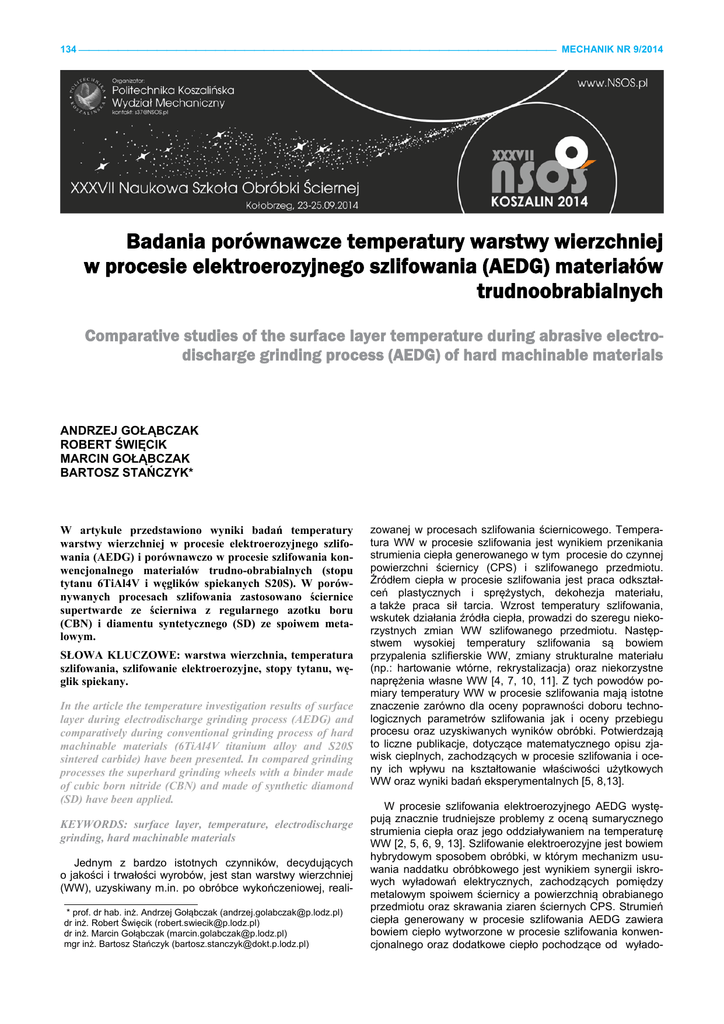 134 MECHANIK NR 9/2014 Badania porównawcze temperatury warstwy wierzchniej w procesie elektroerozyjnego szlifowania (AEDG) materiałów trudnoobrabialnych Comparative studies of the surface layer temperature during abrasive electrodischarge grinding process (AEDG) of hard machinable materials ANDRZEJ GOŁĄBCZAK ROBERT ŚWIĘCIK MARCIN GOŁĄBCZAK BARTOSZ STAŃCZYK* W artykule przedstawiono wyniki badań temperatury warstwy wierzchniej w procesie elektroerozyjnego szlifowania (AEDG) i porównawczo w procesie szlifowania konwencjonalnego materiałów trudno-obrabialnych (stopu tytanu 6TiAl4V i węglików spiekanych S20S). W porównywanych procesach szlifowania zastosowano ściernice supertwarde ze ścierniwa z regularnego azotku boru (CBN) i diamentu syntetycznego (SD) ze spoiwem metalowym. SŁOWA KLUCZOWE: warstwa wierzchnia, temperatura szlifowania, szlifowanie elektroerozyjne, stopy tytanu, węglik spiekany. In the article the temperature investigation results of surface layer during electrodischarge grinding process (AEDG) and comparatively during conventional grinding process of hard machinable materials (6TiAl4V titanium alloy and S20S sintered carbide) have been presented. In compared grinding processes the superhard grinding wheels with a binder made of cubic born nitride (CBN) and made of synthetic diamond (SD) have been applied. KEYWORDS: surface layer, temperature, electrodischarge grinding, hard machinable materials Jednym z bardzo istotnych czynników, decydujących o jakości i trwałości wyrobów, jest stan warstwy wierzchniej (WW), uzyskiwany m.in. po obróbce wykończeniowej, reali* prof. dr hab. inż. Andrzej Gołąbczak ([email protected]) dr inż. Robert Święcik ([email protected]) dr inż. Marcin Gołąbczak ([email protected]) mgr inż. Bartosz Stańczyk ([email protected]) zowanej w procesach szlifowania ściernicowego. Temperatura WW w procesie szlifowania jest wynikiem przenikania strumienia ciepła generowanego w tym procesie do czynnej powierzchni ściernicy (CPS) i szlifowanego przedmiotu. Źródłem ciepła w procesie szlifowania jest praca odkształceń plastycznych i sprężystych, dekohezja materiału, a także praca sił tarcia. Wzrost temperatury szlifowania, wskutek działania źródła ciepła, prowadzi do szeregu niekorzystnych zmian WW szlifowanego przedmiotu. Następstwem wysokiej temperatury szlifowania są bowiem przypalenia szlifierskie WW, zmiany strukturalne materiału (np.: hartowanie wtórne, rekrystalizacja) oraz niekorzystne naprężenia własne WW [4, 7, 10, 11]. Z tych powodów pomiary temperatury WW w procesie szlifowania mają istotne znaczenie zarówno dla oceny poprawności doboru technologicznych parametrów szlifowania jak i oceny przebiegu procesu oraz uzyskiwanych wyników obróbki. Potwierdzają to liczne publikacje, dotyczące matematycznego opisu zjawisk cieplnych, zachodzących w procesie szlifowania i oceny ich wpływu na kształtowanie właściwości użytkowych WW oraz wyniki badań eksperymentalnych [5, 8,13]. W procesie szlifowania elektroerozyjnego AEDG występują znacznie trudniejsze problemy z oceną sumarycznego strumienia ciepła oraz jego oddziaływaniem na temperaturę WW [2, 5, 6, 9, 13]. Szlifowanie elektroerozyjne jest bowiem hybrydowym sposobem obróbki, w którym mechanizm usuwania naddatku obróbkowego jest wynikiem synergii iskrowych wyładowań elektrycznych, zachodzących pomiędzy metalowym spoiwem ściernicy a powierzchnią obrabianego przedmiotu oraz skrawania ziaren ściernych CPS. Strumień ciepła generowany w procesie szlifowania AEDG zawiera bowiem ciepło wytworzone w procesie szlifowania konwencjonalnego oraz dodatkowe ciepło pochodzące od wyłado- MECHANIK NR 9/2014 135 wań elektroiskrowych. Wartość strumienia ciepła w procesie szlifowania AEDG jest więc uzależniona od technologicznych parametrów szlifowania konwencjonalnego oraz elektrycznych parametrów generatora impulsów prądowych. Można oczekiwać, że w tych warunkach szlifowania wystąpi istotne zwiększenie gęstości strumienia ciepła, powodując wzrost temperatury WW, skutkujący niekorzystnymi zmianami fizycznych właściwości technologicznej WW [1, 3, 5, 8, 12]. Należy podkreślić, że w procesie szlifowania AEDG wykorzystywane są ściernice supertwarde ze spoiwem metalowym. Większa przewodność cieplna tego typu ścierniw może więc korzystnie wpływa na intensywność odprowadzenia ciepła ze strefy obróbki, skutkując obniżeniem temperatury. Celowym jest zbadanie rozkładu temperatury w strefie kontaktu ściernicy z materiałem obrabianym, które może mieć znaczenie poznawcze oraz istotne znaczenie aplikacyjne, zwłaszcza przy projektowaniu operacji szlifierskich trudno- skrawalnych materiałów konstrukcyjnych, w warunkach przemysłowego zastosowania procesu AEDG. Autorzy pracy skoncentrowali uwagę na badaniach eksperymentalnych rozkładu temperatury WW trudnoskrawalnych materiałów konstrukcyjnych (stopu tytanu i węglika spiekanego) w procesie szlifowania AEDG oraz porównawczo w procesie szlifowania konwencjonalnego. Do pomiarów i rejestracji temperatury wykorzystuje się różne metody pomiarowe, które polegają na zastosowaniu, np.: pirometrów radiacyjnych, termopar i termoelementów obcych, pomiarów temperatury wiórów, termokolorów naniesionych na powierzchni ściernicy oraz obrazów termowizyjnych w podczerwieni rejestrowanych kamerą termowizyjną [6, 10, 11]. W realizowanych badaniach zastosowano metodę pomiaru za pomocą układu termopar, umieszczonych w szlifowanych próbkach wzdłuż posuwu stołu szlifierki. Próby szlifowania realizowano ściernicami supertwardymi ze ścierniwem z regularnego azotku boru (CBN) i diamentu syntetycznego (SD), spojonych spoiwem metalowym. Metodyka i warunki badań tytanu Ti6Al4V oraz węglika spiekanego S20S (o wymiarach 40x20x10) ściernicą z regularnego azotku boru ze spoiwem metalowym (CBN 125/100 M75) oraz ściernicą diamentową (SD 125/100 M