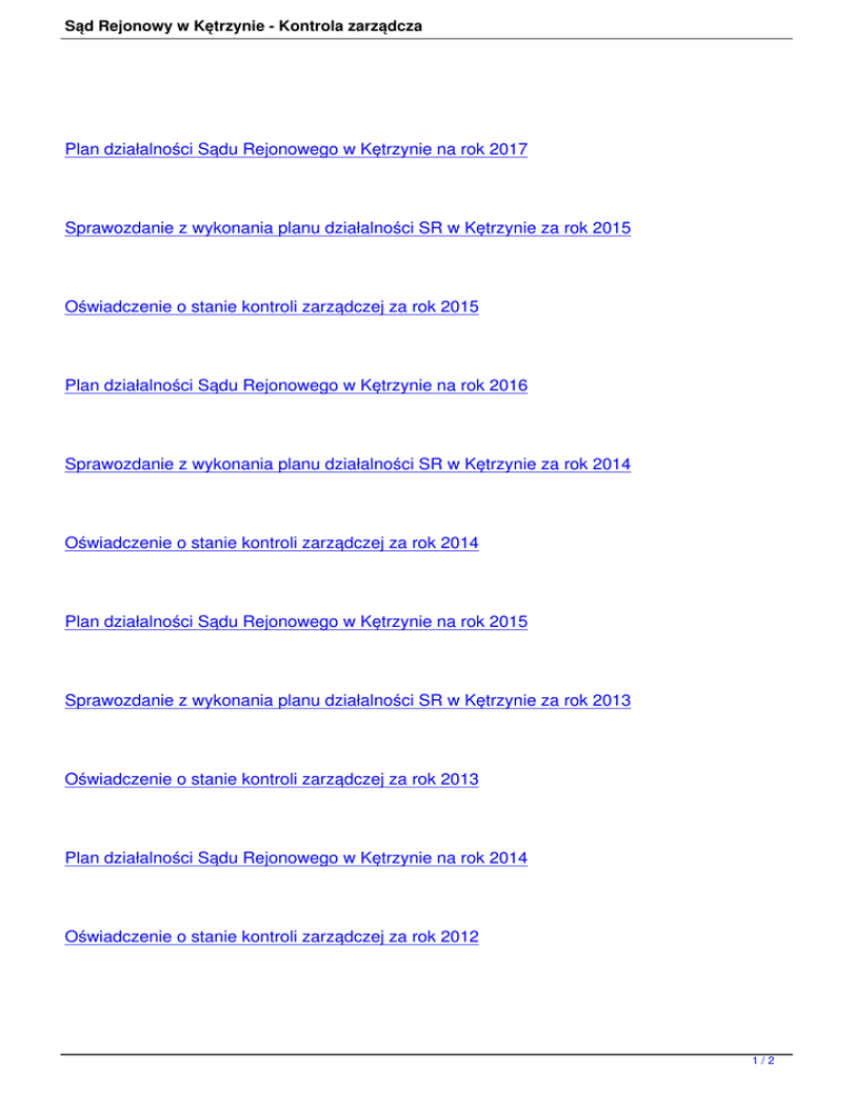 Sąd Rejonowy w Kętrzynie - Kontrola zarządcza Plan działalności Sądu Rejonowego w Kętrzynie na rok 2017 Sprawozdanie z wykonania planu działalności SR w Kętrzynie za rok 2015 Oświadczenie o stanie kontroli zarządczej za rok 2015 Plan działalności Sądu Rejonowego w Kętrzynie na rok 2016 Sprawozdanie z wykonania planu działalności SR w Kętrzynie za rok 2014 Oświadczenie o stanie kontroli zarządczej za rok 2014 Plan działalności Sądu Rejonowego w Kętrzynie na rok 2015 Sprawozdanie z wykonania planu działalności SR w Kętrzynie za rok 2013 Oświadczenie o stanie kontroli zarządczej za rok 2013 Plan działalności Sądu Rejonowego w Kętrzynie na rok 2014 Oświadczenie o stanie kontroli zarządczej za rok 2012 1/2 Sąd Rejonowy w Kętrzynie - Kontrola zarządcza Sprawozdanie z wykonania planu działalności SR w Kętrzynie za rok 2012 Plan działalności Sądu Rejonowego w Kętrzynie na rok 2013 Plan działalności Sądu Rejonowego w Kętrzynie na rok 2012 Oświadczenie o stanie kontroli zarządczej za rok 2011 Sprawozdanie z wykonania planu działalności SR w Kętrzynie za rok 2011 Plan działalności Sądu Rejonowego w Kętrzynie na rok 2011 Oświadczenie o stanie kontroli zarządczej za rok 2010 2/2