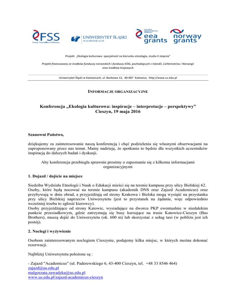 Projekt „Ekologia kulturowa- specjalność na kierunku etnologia, studia II stopnia” Projekt finansowany ze środków funduszy norweskich i funduszy EOG, pochodzących z Islandii, Lichtensteinu i Norwegii oraz środków krajowych. Uniwersytet Śląski w Katowicach, ul. Bankowa 12, 40-007 Katowice, http://www.us.edu.pl INFORMACJE ORGANIZACYJNE Konferencja „Ekologia kulturowa: inspiracje – interpretacje – perspektywy” Cieszyn, 19 maja 2016 Szanowni Państwo, dziękujemy za zainteresowanie naszą konferencją i chęć podzielenia się własnymi obserwacjami na zaproponowany przez nas temat. Mamy nadzieję, że spotkanie to będzie dla wszystkich uczestników inspiracją do dalszych badań i dyskusji. Aby konferencja przebiegła sprawnie prosimy o zapoznanie się z kilkoma informacjami organizacyjnymi 1. Dojazd / dojście na miejsce Siedziba Wydziału Etnologii i Nauk o Edukacji mieści się na terenie kampusu przy ulicy Bielskiej 62. Osoby, które będą nocować na terenie kampusu (akademik DNS oraz Zajazd Academicus) oraz przybywają w dniu obrad, a przyjeżdżają od strony Krakowa i Bielska mogą wysiąść na przystanku przy ulicy Bielskiej naprzeciw Uniwersytetu (jest to przystanek na żądanie, więc odpowiednio wcześniej trzeba to zgłosić kierowcy). Osoby przyjeżdżające od strony Katowic, wysiadające na dworcu PKP ewentualnie w niedalekim punkcie przesiadkowym, gdzie zatrzymują się busy kursujące na trasie Katowice-Cieszyn (Bus Brothers), muszą dojść do Uniwersytetu (ok. 600 m) lub skorzystać z usług taxi (w pobliżu jest ich postój). 2. Noclegi i wyżywienie Osobom zainteresowanym noclegiem Cieszynie, podajemy kilka miejsc, w których można dokonać rezerwacji. Najbliżej Uniwersytetu położone są : - Zajazd "Academicus" (ul. Paderewskiego 6, 43-400 Cieszyn, tel. +48 33 8546 464) [email protected] [email protected] www.us.edu.pl/zajazd-academicus-cieszyn Projekt „Ekologia kulturowa- specjalność na kierunku etnologia, studia II stopnia” Projekt finansowany ze środków funduszy norweskich i funduszy EOG, pochodzących z Islandii, Lichtensteinu i Norwegii oraz środków krajowych. Uniwersytet Śląski w Katowicach, ul. Bankowa 12, 40-007 Katowice, http://www.us.edu.pl Zajazd „Academicus" zlokalizowany jest na terenie kampusu Uniwersytetu Śląskiego w Cieszynie i dysponuje 65 miejscami w pokojach 1-osobowych z możliwością dostawki oraz 3 apartamentami 2osobowymi z możliwością dostawki. Ceny: - 55 zł pokój 1-osobowy - 90 zł pokój 2-osobowy - Akademik „DSN” (43-400 Cieszyn, ul. Niemcewicza 8, tel. +48 33 8546 120) www.student.us.edu.pl/akademiki-us-cieszyn Akademik DSN jest budynkiem 4-piętrowym, posiadającym 331 miejsc w zestawach studenckich oraz pokoje gościnne z łazienką (2 pokoje 2-osobowych połączonych przedpokojem, ze wspólną wnęką z umywalką, aneksem kuchennym oraz częścią sanitarną, tj. WC i natryskiem). Ceny: - 30 zł za dobę dla studentów innych uczelni - 40 zł za dobę dla osób niebędących studentami Hotele i hostele usytuowane w centrum miasta: Hotel Wyższa Brama (ul. Wyższa Brama 19, 43-400 Cieszyn, tel. +48 33 851 2299) www.wyzszabrama.pl [email protected] Hotel Wyższa Brama znajduje się w centrum Cieszyna, 300 metrów od polsko-czeskiej granicy. Dworzec autobusowy oddalony jest od obiektu o 200 metrów, a rynek – o 300 metrów. Na miejscu Goście mają do dyspozycji pokoje z bezpłatnym bezprzewodowym dostępem do Internetu. Cena: - od 90 zł Hotel 8 Pokoi (ul. Zamkowa 3C, 43-400 Cieszyn, tel.+ 48 732 994 451) www.8pokoi.pl [email protected] OFKA to przytulne pokoje butikowe, letnia kawiarenka, wypożyczalnia rowerów oraz biuro eventowe. Wszystko to mieści się w malowniczej scenerii Pałacu Myśliwskiego mieszczącego się na Wzgórzu Zamkowym w Cieszynie. Ceny: - 70 zł – pokój 1-osobowy - 120 zł – pokój 2-osobowy - 160 zł – pokój 3-osobowy 3 Bros’ Hostel Cieszyn (ul. Mennicza 14, 43-400 Cieszyn tel. +48 539 064 539 [email protected] www.3broshostel.com Projekt „Ekologia kulturowa- specjalność na kierunku etnologia, studia II stopnia” Projekt finansowany ze środków funduszy norweskich i funduszy EOG, pochodzących z Islandii, Lichtensteinu i Norwegii oraz środków krajowych. Uniwersytet Śląski w Katowicach, ul. Bankowa 12, 40-007 Katowice, http://www.us.edu.pl Hostel dysponuje 29 miejscami noclegowymi w pokojach nawiązujących swoim charakterem do bogatej historii miasta. Cena: - od 50 zł ze śniadaniem Ze względu na bardzo napięty program, proponujemy skorzystanie z oferty obiadowej naszej stołówki położonej na terenie Kampusu. Pełny obiad (zupa + drugie danie) kosztuje 9,50 zł. Jeżeli zdecydują się Państwo na tę propozycję, proszę o przesłanie mi informacji do 20 kwietnia, czy będą Państwo chcieli obiad mięsny, czy wegetariański. Dzięki temu złożymy zamówienie odpowiednio wcześniej, co w znacznym stopniu oszczędzi czas i uwolni nas od stania w kolejce. Opłatę za obiad zbierzemy podczas rejestracji. 3. Wytyczne dotyczące publikacji tekstów Teksty do publikacji proszę przygotować według wytycznych zamieszczonych na stronie http://www.seia.us.edu.pl/informacje-dla-autorow/wskazowki-redakcyjne i przesłać w wersji elektronicznej nie później niż do 30 czerwca 2016 r. na adres: [email protected] W kolejnym numerze czasopisma zostaną umieszczone wyłącznie te artykuły, które otrzymają pozytywne recenzje.