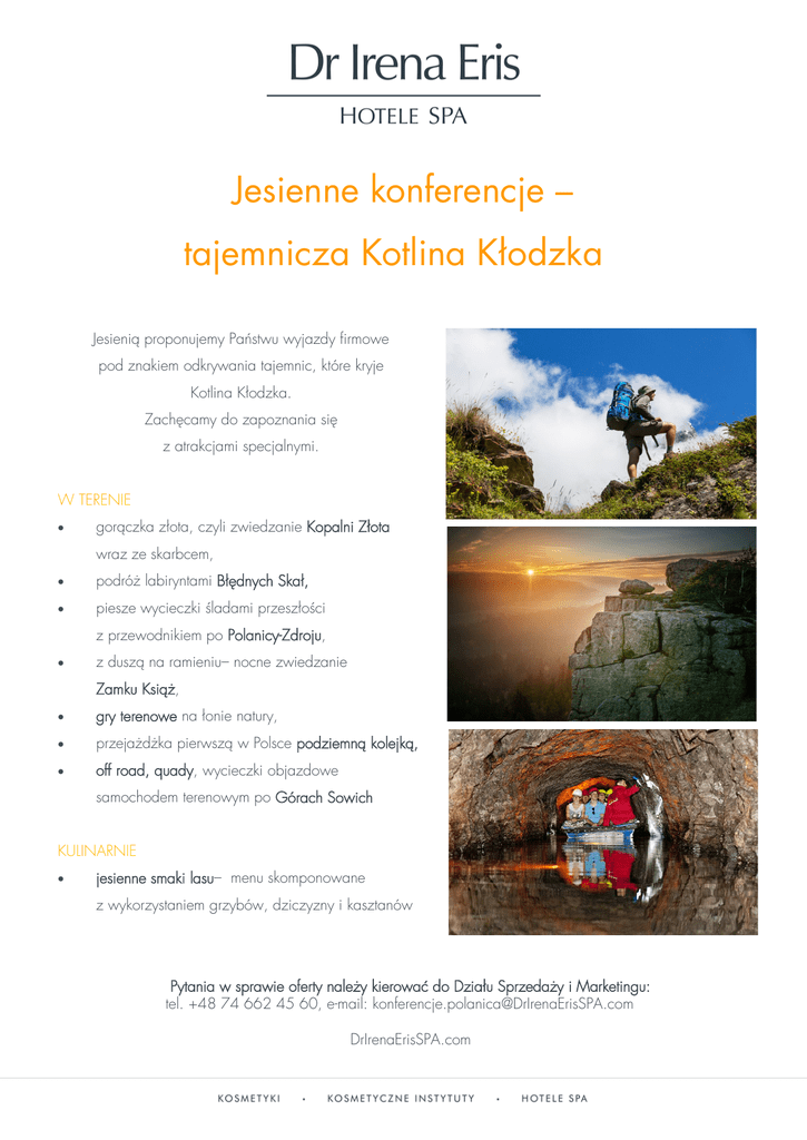 Jesienne konferencje – tajemnicza Kotlina Kłodzka Jesienią proponujemy Państwu wyjazdy firmowe pod znakiem odkrywania tajemnic, które kryje Kotlina Kłodzka. Zachęcamy do zapoznania się z atrakcjami specjalnymi. W TERENIE gorączka złota, czyli zwiedzanie Kopalni Złota wraz ze skarbcem, podróż labiryntami Błędnych Skał, piesze wycieczki śladami przeszłości z przewodnikiem po Polanicy-Zdroju, z duszą na ramieniu– nocne zwiedzanie Zamku Książ, gry terenowe na łonie natury, przejażdżka pierwszą w Polsce podziemną kolejką, off road, quady, wycieczki objazdowe samochodem terenowym po Górach Sowich KULINARNIE jesienne smaki lasu– menu skomponowane z wykorzystaniem grzybów, dziczyzny i kasztanów Pytania w sprawie oferty należy kierować do Działu Sprzedaży i Marketingu: tel. +48 74 662 45 60, e-mail: [email protected] DrIrenaErisSPA.com