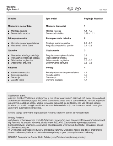 Vsebina Spis treści SLO PL 5201-4-00/1 Vsebina Spis treści Poglavje Rozdział Montaža in demontaža Montaż / demontaż 1 Montaż fotelika Demontaż fotelika 1.1 - 1.9 1.10 - 1.11 Zabezpieczenie dziecka 2 Obsługa systemu pasów Regulacja wysokości pasów 2.1 - 2.6 2.7 - 2.8 Użytkowanie 3 Regulacja nachylenia fotelika Przenoszenie fotelika Zdejmowanie zagłówka Zdejmowanie pokrycia 3.1 3.2 3.3 - 3.5 3.6 - 3.8 Porady 4 Porady odnośnie bezpieczeństwa Porady ogólne Gwarancja Ochrona pojazdu 4.1 4.2 4.3 4.4 Montaža sedeža Demontaža sedeža Pripenjanje otroka Uporaba pasovnega sistema Nastavitev višine pasu Uporaba Nastavitev ležečega položaja Prenašanje otroškega sedeža Odstranitev vzglavnika Odstranitev prevleke Navodila Varnostna navodila Splošna navodila Garancija Zaščita vozila Spoštovani starši, prisrčne čestitke! V skladu z geslom ˝Ker je moj otrok tega vreden!˝, ki je tudi naš moto, ste se odločili za kakovostni izdelek podjetja RECARO. Za naše dolžnosti smo si postavili dobro varnost, najboljšo ergonomijo, sodobno obliko, udobje in najvišjo kakovost. Le pri Recaru npr. vse otroške sedeže izdelamo po enakih strogih merilih kot avtomobilske sedeže in jih preizkusimo v skladu s strogimi zahtevami avtomobilske industrije. Srečno vožnjo vam vedno in povsod želi Recarov strokovni center za varnost otrok! Drodzy Rodzice, gratulujemy wyboru naszego produktu! Zgodnie z dewizą ˝bo moje dziecko jest tego warte˝ zdecydowali się Państwo na produkt wysokiej jakości marki RECARO. Zachowanie wysokiego poziomu bezpieczeństwa i ergonomii, oferowanie nowoczesnego wzornictwa, komfortu i najwyższej jakości to dla nas obowiązek. W wyniku tego przykładowo tylko w przypadku RECARO wszystkie foteliki dla dzieci oraz foteliki samochodowe są badane na postawie surowych wymogów przemysłu samochodowego. RECARO Competence Center Child Safety życzy Państwu bezpiecznej podróży! Poglavje 1 - Montaža in demontaža Rozdział 1 - Montaż / demontaż SLO PL 5202-4-01/1 Avtomobilski otroški sedež Polaric za otroke starostne skupine I s telesno težo od 9 do 18 kg, ki se pritrdi s sistemom Isofix. Preizku en in atestiran pri čelnem trčenju s hitrostjo 50 k m/h v skladu z uredbo ECE 44/04. Vgradnja je dovoljena le v smeri, nasprotni smeri vožnje. Fotelik samochodowy dla dzieci grupy wiekowej I, masa ciała 9-18 kg, do mocowania systemem Isofix. Badany i certyfikowany według ECE 44/04 przy uderzeniu frontowym z prędkością 50 km/h. Dopuszczalny montaż tylko w kierunku przeciwnym do kierunku jazdy. 1 5084F-4-01/1 1.1 - 1.9 Montaža sedeža Kvadratna nastavka skozi luknjo med naslonjalom in vodoravno ploskvijo sedeža nataknite na Isofixovo streme (kovinsko zanko). Tega ni potrebno narediti tam, kjer so kvadratni nastavki že fiksno vgrajeni, npr. pri avtomobilih BMW. Kvadratni nastavek obrnite tako, da bo odprta stran obrnjena navzgor. 1.1 - 1.9 Montaż fotelika Przełożyć elementy pomocnicze wprowadzania przez szczelinę tapicerki oparcia i siedziska na pałąk Isofix, nie jest to konieczne przy zamontowanych na stałe elementach pomocniczych, np. w BMW. Należy zwrócić uwagę na to, aby otwarta powierzchnia boczna była u góry. 1.1 5092F-4-00/1 Navpično oporo potisnite do konca navzdol. Rozłożyć nóżkę podpierającą do oporu na dół. 1.2 5090F-4-00/1 Poglavje 1 - Montaža in demontaža Rozdział 1 - Montaż / demontaż SLO PL 5203-4-01/1 Pritisnite na gumb na zaskočnem vzvodu in vzvod potis nite navzdol, da se lok ˝reboard˝ premakne k otroškemu sedežu. Wcisnąć przycisk na d wigni zapadkowej i przesunąć ją na dół. W ten sposób pałąk mocowania odwrotnego (reboard) zostanie nachylony w stronę fotelika. 1.3 5091F-4-00/1 Isofixove konektorje vtaknite v kvadratne nastavke, da z askočijo. Preverite pritrjenost, tako da na obeh straneh primete in potegnete za Isofixova nosilca. Nałożyć łączniki Isofix w elementy pomocnicze wprowadzania tak, by zaskoczyły. Sprawdzić zablokowanie przez obustronne pociągnięcie za trzonki Isofix. A 1.4 Nastavitev navpične opore: Izvlecite zaskočni gumb in navpično oporo spustite na d no oz. tla avtomobila. Nato zaskočni gumb izpustite in preverite, ali je premičn i del navpične opore zaskočen oz. zablokiran. 5093F-4-00/1 Klick Ustawianie nóżki podpierającej. Wyciągnąć przycisk zapadki i ustawić nóżkę w taki sposób, aby opierała się na podłodze pojazdu. Przycisk zapadki puścić i zwrócić uwagę na to, aby zaskoczyła ruchoma część nóżki. 1.5 5094F-4-00/1 Poglavje 1 - Montaža in demontaža Rozdział 1 - Montaż / demontaż SLO PL 5204-4-01/1 Zaskočni vzvod sedaj toliko potisnite navzgor, da bo navpična opora trdno prislonjena na nasl onjalo avtomobilskega sede a. Wcisnąć teraz d wignię zapadkową do góry na tyle, aby pałąk podpierający opierał się sztywno na oparciu siedzenia pojazdu. 1.6 5112F-4-00/1 Spodnje dele napenjalnih pasov speljite okrog cevi okvirja prednjega avtomobilskega sede a in to čim bli je tlom o z. dnu vozila. Polovici ključavnice oz. zapirala pasu speljite skozi zanki in zanki trdno zategnite. Dolne części pasa napinającego założyć teraz na rurę mocującą przedniego siedzenia jak najbliżej podłogi pojazdu. Nawlec połówki zamka pasa przez pętlę i je mocno dociągnąć. 1.7 5115F-4-02/1 Sestavite polovici ključavnice oz. zapirala varnostnega pasu, tako da pri zapiranju zaskočita z jasno sli nim ˝klik om˝. Złożyć połówki zamka pasa razem. Muszą one zaskoczyć słyszalnym kliknięciem. Klick 1.8 5113F-4-02/1 Poglavje 1 - Montaža in demontaža Rozdział 1 - Montaż / demontaż SLO PL 5205-4-01/1 Prosta konca napenjalnih pasov močno potegnite navzdol, da ju s tem dobro napnete. Njuno napetost preverite po vsakem premiku prednjega sedeža. Pociągnąć mocno na dół za swobodne końce pasa napinającego aż do sztywnego ich naprężenia i to naprężenie kontrolować po każdym przestawieniu przedniego siedzenia. 1.9
