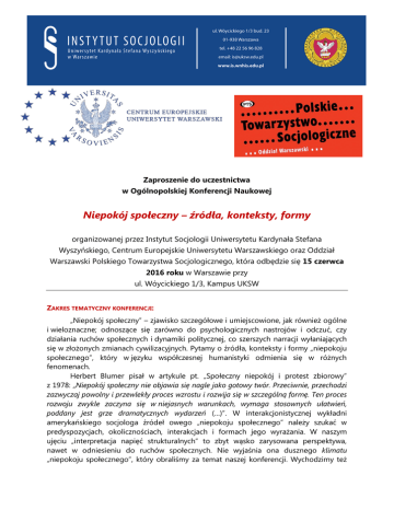 Zaproszenie do uczestnictwa w Ogólnopolskiej Konferencji Naukowej Niepokój społeczny – źródła, konteksty, formy organizowanej przez Instytut Socjologii Uniwersytetu Kardynała Stefana Wyszyńskiego, Centrum Europejskie Uniwersytetu Warszawskiego oraz Oddział Warszawski Polskiego Towarzystwa Socjologicznego, która odbędzie się 15 czerwca 2016 roku w Warszawie przy ul. Wóycickiego 1/3, Kampus UKSW ZAKRES TEMATYCZNY KONFERENCJI: „Niepokój społeczny” – zjawisko szczegółowe i umiejscowione, jak również ogólne i wieloznaczne; odnoszące się zarówno do psychologicznych nastrojów i odczuć, czy działania ruchów społecznych i dynamiki politycznej, co szerszych narracji wyłaniających się w złożonych zmianach cywilizacyjnych. Pytamy o źródła, konteksty i formy „niepokoju społecznego”, który w języku współczesnej humanistyki odmienia się w różnych fenomenach. Herbert Blumer pisał w artykule pt. „Społeczny niepokój i protest zbiorowy” z 1978: „Niepokój społeczny nie objawia się nagle jako gotowy twór. Przeciwnie, przechodzi zazwyczaj powolny i przewlekły proces wzrostu i rozwija się w szczególną formę. Ten proces rozwoju zwykle zaczyna się w niejasnych warunkach, wymaga stosownych ułatwień, poddany jest grze dramatycznych wydarzeń (…)”. W interakcjonistycznej wykładni amerykańskiego socjologa źródeł owego „niepokoju społecznego” należy szukać w predyspozycjach, okolicznościach, interakcjach i formach jego wyrażania. W naszym ujęciu „interpretacja napięć strukturalnych” to zbyt wąsko zarysowana perspektywa, nawet w odniesieniu do ruchów społecznych. Nie wyjaśnia ona dusznego klimatu „niepokoju społecznego”, który obraliśmy za temat naszej konferencji. Wychodzimy też poza zastosowane na przykład w badaniach Eurobarometru analogiczne pojęcie, które sprowadza kategorię „niepokoju społecznego” do zbioru subiektywnych opinii wyrażających satysfakcję z własnego losu i biegu wydarzeń. Dostrzegamy konieczność szerszego ujęcia problematyki „niepokoju społecznego”, które będzie uwzględniać zarówno zmiany cywilizacyjne związane z „radykalizacją nowoczesności” jak ujął to prominentny socjolog (Giddens 1990), szeroko rozumianą globalizacją i rozwojem kapitalizmu, sekularyzacją, rozwojem społeczeństwa masowego czy procesami demokratycznymi związanymi zarówno z umacnianiem się indywidualizmu i filozofii praw człowieka, co komunitariańską i narodową nostalgią, która niejednokrotnie przyjmuje formę wspólnotowego ekstremizmu i ortodoksji. W tych potężnych procesach upatrujemy tytułowych źródeł niepokoju społecznego i popularnego dziś pojęcia „ryzyka”. Niemal symbolicznie problemy te kumulują się dziś w zjawisku, które opinia publiczna określiła mianem „kryzysu imigracyjnego”, choć dla wielu jasne pozostaje, że istota rozgrywającego się dramatu uchodźców jest dużo bardziej zawiła i leży w wymienionych tu zagadnieniach, prowokując do fundamentalnych pytań o tożsamość, nierówności społeczne, sprawiedliwość, zmiany klimatyczne, porządek prawa, itd. Przejawy niepokoju społecznego urzeczywistniają się przy tym w różnorodnych kontekstach ideologicznych, kulturowych, narodowych oraz politycznych. Ich identyfikacja pozwala na jego umiejscowienie i zobrazowanie w dynamice konkretnych zjawisk i procesów społecznych, decyzji politycznych i rozwiązań. Nie rozstrzygamy czy „niepokój społeczny” jest wyłącznie zjawiskiem negatywnym i destrukcyjnym. Radykalizacja nastrojów, która stanowi jedną tylko z manifestacji niepokoju, przynosi spór o kształt sfery publicznej, jest wyrazem reakcyjnych tęsknot za utraconym porządkiem, ale także przejawem wzniosłych predylekcji, awangardowych wizji i utopijnych nadziei. W obu przypadkach dostrzegamy proces, w którym istniejące status quo staje pod znakiem zapytania, a wraz z nim podstawowe kategorie naszego samo-rozumienia. Spory polityczne, które dzielą polską opinię publiczną z rzadko spotykaną intensywnością i temperaturą dotykają często rozumienia podstawowych dóbr. Niestety, dyskusje te niezwykle rzadko zarazem osiągają meritum, a dyskusja zatrzymuje się pod wpływem emocji, wzajemnej niechęci i uprzedzeń w fazie embrionalnej. Zablokowane procesy komunikacyjne, tak jak i polityka informacyjna wzmagają jedynie niepokój społeczny. Obok różnych postaci radykalizmu, formy niepokoju społecznego zaczynają się multiplikować: alienacja społeczna, lęk, podniecenie, zatroskanie, agresja, przemoc, obojętność, niepewność, anomia czy anarchizacja idą w parze ze wzrostem obywatelskich inicjatyw, mobilizacją społeczną, akcjami protestacyjnymi, wzmożoną aktywnością alternatywnych ruchów społecznych i miejskich. „Niepokój społeczny” w różnych postaciach urasta do jednej z podstawowych kategorii przebijających w socjologii, filozofii polityki i innych dyscyplinach. Zapraszamy do jej analizy. SŁOWA KLUCZOWE: niepokój społeczny, ryzyko, lęk, radykalizacja, przemoc, ruchy społeczne, Polska, Świat, anomia, niepewność, anarchizacja, nowoczesność, imigracja RADA NAUKOWA KONFERENCJI: Ks. prof. dr hab. Sławomir H. Zaręba Prof. dr hab. Andrzej Wójtowicz Dr Rafał Wiśniewski Dr Mikołaj Rakusa-Suszczewski CZŁONKOWIE KOMITETU ORGANIZACYJNEGO: Mgr Katarzyna Durmaj Mgr Agata Rozalska Mgr Bartosz H. Olszewski INFORMACJE ORGANIZACYJNE: Serdecznie zapraszamy wszystkich chętnych do aktywnego udziału w konferencji naukowej. Osoby zainteresowane uczestnictwem prosimy o przesłanie wypełnionego formularza zgłoszeniowego na adres e-mail: [email protected] Organizatorzy planują wydanie recenzowanej monografii naukowej składającej się z nadesłanych artykułów. Warunkiem opublikowania artykułu w monografii jest przesłanie go w terminie do 30 lipca 2016 roku oraz uzyskanie pozytywnej recenzji. Wymogi redakcyjne zostaną przesła