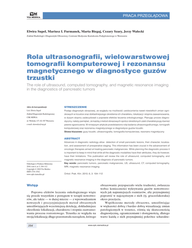 PRACA PRZEGLĄDOWA Elwira Supeł, Mariusz I. Furmanek, Marta Biegaj, Cezary Szary, Jerzy Walecki Zakład Radiologii i Diagnostyki Obrazowej, Centrum Medyczne Kształcenia Podyplomowego w Warszawie Rola ultrasonografii, wielowarstwowej tomografii komputerowej i rezonansu magnetycznego w diagnostyce guzów trzustki The role of ultrasound, computed tomography, and magnetic resonance imaging in the diagnostics of pancreatic tumors Adres do korespondencji: STRESZCZENIE Lek. Elwira Supeł Postęp diagnostyki obrazowej, ze względu na możliwość uwidocznienia nawet niewielkich zmian ogni- Zakład Diagnostyki Radiologicznej skowych w trzustce oraz dokładniejszego określenia ich charakteru, lokalizacji i stopnia zaawansowania, CSK MSWiA w dużym stopniu zadecydował o poprawie efektów leczenia onkologicznego. Planując proces diagno- ul. Wołoska 137, 02–507 Warszawa styczny, należy pamiętać, że każdą z metod obrazowych oprócz określonych zalet charakteryzują również e-mail: [email protected] pewne ograniczenia. W niniejszym artykule przedstawiono rolę badania ultrasonograficznego, tomografii komputerowej oraz rezonansu magnetycznego w diagnostyce guzów trzustki. Słowa kluczowe: guzy trzustki, ultrasonografia, tomografia komputerowa, rezonans magnetyczny ABSTRACT Advances in diagnostic radiology allow detection of small pancreatic lesions, their character, localization, and assessment of preoperative staging. This information has been crucial in the advancement of oncologic therapies aimed at treating pancreatic malignancies. While planning the diagnostic process it is important to keep in mind that while all the diagnostic modalities have their attributes, they do however, have their limitations. This publication will review the role of ultrasound, computed tomography, and magnetic resonance imaging in the diagnosis of pancreatic tumors. Onkologia w Praktyce Klinicznej 2010, tom 6, nr 3, 104–112 Copyright © 2010 Via Medica ISSN 1734–3542 www.opk.viamedica.pl Key words: pancreatic tumors, pancreatic malignancies, US, ultrasound, CT, computed tomography, MRI, magnetic resonance imaging Onkol. Prak. Klin. 2010; 6, 3: 104–112 Wstęp Poprawa efektów leczenia onkologicznego wiąże się przede wszystkim z postępem w terapii nowotworów, ale także — w dużej mierze — z wprowadzaniem nowszych i precyzyjniejszych metod obrazowych umożliwiających wcześniejszą detekcję, dokładniejsze określenie lokalizacji, charakteru i stopnia zaawansowania procesu rozrostowego. Trzustka ze względu na swoją lokalizację długo pozostawała narządem, którego 104 obrazowanie przysparzało wielu trudności, zwłaszcza wobec konieczności wykrywania guzów nowotworowych jak najmniejszych rozmiarów, aby przynajmniej poprawić w najczęstszym z nich (tj. gruczolakoraku) okres przeżycia. Współczesne metody obrazowe, umożliwiając w większości dobrą i bardzo dobrą wizualizację zmian patologicznych w trzustce, różnią się skutecznością diagnostyczną, ograniczeniami i dostępnością, dlatego warto każdą z nich przynajmniej pokrótce scharakte- www.opk.viamedica.pl Elwira Supeł i wsp., Obrazowanie guzów trzustki ryzować, aby móc zastosować na odpowiednim etapie algorytmu diagnostycznego. Ultrasonografia (USG, ultrasonography) ze względu na dużą dostępność, mały koszt badania oraz brak ekspozycji na promieniowanie rentgenowskie jest zwykle pierwszym badaniem obrazowym u pacjentów z niespecyficznymi bólami w jamie brzusznej czy objawami niedrożności dróg żółciowych. Jednak z powodu rozmiarów trzustki, jej pozaotrzewnowej lokalizacji oraz wstawiania się pętli jelitowych w okno akustyczne badanie USG trzustki bywa trudne technicznie, a w przypadku niewłaściwego przygotowania, braku współpracy i otyłości pacjenta wręcz mało diagnostyczne lub nawet niemożliwe do przeprowadzenia. Należy pamiętać, że o ile głowa i trzon trzustki są zwykle dostępne badaniu, o tyle uwidocznienie ogona trzustki wymaga większego doświadczenia od osoby badającej i odpowiedniego przygotowania pacjenta [1–3]. Badanie USG przez powłoki brzuszne uwidocznia nawet niewielkie zmiany w głowie i trzonie trzustki, poza tym jest metodą z wyboru w przypadku diagnostyki niedrożności dróg żółciowych. Badanie techniką doplerowską z jej modyfikacjami bywa wykorzystywane do oceny zróżnicowanego przepływu krwi zależnego od nasilenia angiogenezy w guzie. Przydatność USG z zastosowaniem dożylnych środków kontrastowych w kontekście diagnostyki guzów trzustki podlega aktualnie wieloośrodkowej ocenie klinicznej, natomiast potwierdzono jego dużą wartość w diagnostyce przerzutów do wątroby. Ultrasonografia endoskopowa (EUS, endoscopic ultrasonography) stanowi bardzo cenną metodę w ośrodkach mających doświadczenie w stosowaniu tej techniki. Ze względu na ograniczoną dostępność oraz możliwość powikłań nie jest badaniem wykonywanym w pierwszej kolejności u chorego z podejrzeniem guza trzustki, ale stanowi metodę weryfikującą. Niewątpliwie odgrywa ważną rolę w diagnostyce guzów niewielkich rozmiarów, zlokalizowanych zwłaszcza w głowie trzustki, czułością zdecydowanie przewyższając USG przezbrzuszne i konkurując z wielowarstwową tomografią komputerową. Zaletą EUS jest także możliwość rozszerzenia jej o celowaną biopsję cienkoigłową [4, 5], co istotnie podnosi specyficzność metody. Ograniczeniem utrasonografii endoskopowej jest natomiast względnie mały obszar podlegający ocenie, zależny od okna akustycznego dostępnego głowicy ultradźwiękowej wprowadzonej do światła dwunastnicy lub żołądka. Stąd też dla oceny stopnia zaawansowania procesu, przede wszystkim cechy M, konieczne jest uzupełnienie EUS o inne badania obrazowe, pozwalające na ocenę całego nadbrzusza i śródbrzusza. Szerokie możliwości diagnostyczne związane z wszechstronnością dają wprowadzone do praktyki klinicznej wielowarst