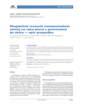 OPIS PRZYPADKU Aneta L. Zygulska1, Krzysztof Krzemieniecki2 1Klinika 2Klinika Onkologii Szpitala Uniwersyteckiego w Krakowie Onkologii Collegium Medicum Uniwersytetu Jagiellońskiego w Krakowie Długoletnie leczenie trastuzumabem chorej na raka piersi z przerzutami do skóry — opis przypadku Long-term treatment with trastuzumab of patient with skin metastatic breast cancer — a case report Adres do korespondencji: STRESZCZENIE Dr med. Aneta L. Zygulska Trastuzumab jest lekiem z wyboru w przypadku uogólnionego procesu nowotworowego w przebiegu raka Klinika Onkologii Szpitala piersi z nadekspresją receptora HER2. Terapia jest dobrze tolerowana. Jednak pomimo powszechnego Uniwersyteckiego stosowania trastuzumabu, dotychczas jednoznacznie nie określono czasu leczenia u chorych z rozsie- ul. Śniadeckich 10, 31–531 Kraków wem nowotworu. W artykule przedstawiono przypadek 46-letniej chorej leczonej nieprzerwanie przez 5 Tel.: +48 (12) 424 89 14 lat trastuzumabem. Faks: +48 (12) 424 89 10 Słowa kluczowe: przerzutowy rak piersi, trastuzumab e-mail: [email protected] ABSTRACT Trastuzmab is the treatment of choice for HER2-overexpressing metastatic breast cancer. The treatment is well tolerated. Despite the fact that trastuzumab is used commonly, duration of the treatment has not Onkologia w Praktyce Klinicznej 2010, tom 6, nr 3, 113–115 Copyright © 2010 Via Medica ISSN 1734–3542 www.opk.viamedica.pl been defined. Case of 46-year old female patient on continuous 5 year trastuzumab was described. Key words: metastatic breast cancer, trastuzumab Onkol. Prak. Klin. 2010; 6, 3: 113–115 Wstęp Nadekspresja receptora HER2 występuje zazwyczaj w 20–25% raków piersi i jest niezależnym niekorzystnym czynnikiem prognostycznym [1]. Trastuzumab (humanizowane przeciwciało monoklonalne) stosuje się jako leczenie uzupełniające u chorych na raka piersi z nadekspresją receptora HER2. Jest również lekiem z wyboru — zarówno w monoterapii, jak i w skojarzeniu z chemioterapią — u chorych na przerzutowego raka piersi z nadekspresją receptora HER2. Leczenie jest dobrze tolerowane [1–3]. Dotychczas dokładnie nie określono czasu podawania trastuzumabu w przypadku choroby przerzutowej. W piśmiennictwie pojawiają się doniesienia o kilkuletnim stosowaniu tego leku [4]. W niniejszej pracy przedstawiono przypadek obecnie 46-letniej chorej na raka piersi z rozległym naciekiem skóry leczonej nieprzerwanie przez 5 lat trastuzumabem. Opis przypadku W listopadzie 2001 roku u 38-letniej pacjentki rozpoznano cytologicznie raka piersi lewej w stadium zaawansowania klinicznego T3 N2 M0. W okresie od listopada 2001 roku do stycznia 2002 roku podano 3 cykle indukcyjnej chemioterapii według schematu FAC (5-fluorouracyl, doksorubicyna, cyklofosfamid), uzyskując częściową remisję guza piersi i pakietu węzłów chłonnych w lewej pasze. W tym samym miesiącu przeprowadzono zabieg operacyjny sposobem Pateya. Na podstawie badania www.opk.viamedica.pl 113 ONKOLOGIA W PRAKTYCE KLINICZNEJ 2010, tom 6, nr 3 histopatologicznego materiału operacyjnego rozpoznano naciekającego raka przewodowego. W naczyniach krwionośnych i limfatycznych stwierdzono liczne zatory z komórek raka. We wszystkich 23 usuniętych węzłach chłonnych były obecne przerzuty. Badanie immunohistochemiczne nie wykazało receptorów hormonalnych przy dodatnim wyniku testu na nadekspresję receptora HER2. Po zabiegu operacyjnym pacjentkę poddano leczeniu systemowemu — otrzymała kolejne 3 cykle chemioterapii według schematu FAC. Następnie przeprowadzono typowe uzupełniające leczenie napromienianiem zakończone w czerwcu 2002 roku. Przez 2 lata u chorej nie występowały objawy i była ona objęta stałymi kontrolami w Poradni Przyklinicznej Kliniki Onkologii CMUJ w Krakowie. W czerwcu 2004 roku stwierdzono naciek nowotworowy skóry klatki piersiowej w rejonie blizny pooperacyjnej i grzbietu po lewej stronie. Weryfikacja mikroskopowa wycinka potwierdziła diagnozę przerzutu do skóry w przebiegu raka piersi. Z tego powodu włączono chemioterapię według schematu AT (docetaksel w skojarzeniu z doksorubicyną), do wyczerpania dawki antracykliny. W okresie od czerwca do października 2004 roku podano łącznie 6 cykli według powyższego schematu, uzyskując częściową remisję zmian skórnych. Od listopada 2004 roku do momentu powstania niniejszego opisu przypadku chora otrzymuje trastuzumab w standardowej dawce. W trakcie terapii uzyskano całkowitą remisję nacieku skórnego (po 5 miesiącach stosowania terapii ukierunkowanej molekularnie). Tolerancja leczenia trastuzumabem jest dobra. Regularnie (tj. co 3–4 miesiące) u chorej przeprowadza się badanie echokardiograficzne potwierdzające prawidłową frakcję wyrzutową. W dotychczasowych kontrolnych badaniach obrazowych nie potwierdzono obecności przerzutów do narządów miąższowych. Dyskusja Stosowanie trastuzumabu w monoterapii jest skutecznym leczeniem zarówno w pierwszej linii w przerzutowym raku piersi, jak i w przypadku chorych uprzednio leczonych z powodu rozsiewu [2, 5]. Odsetek odpowiedzi wynosi średnio 26% [5]. Użycie trastuzumabu w monoterapii jest opcją w przypadku choroby bez przerzutów narządowych [3]. Skojarzenie tego leku z chemioterapią znacząco poprawia medianę czasu do progresji i całkowity czas przeżycia [6]. Leczenie trastuzumabem jest dobrze tolerowane [1–3, 5]. Rzadko stwierdza się gorączkę, dreszcze, duszność i ból, jeśli występują, to głównie w trakcie pierwszego wlewu [1]. Anafilaksja zagrażająca życiu i zgony związane z leczeniem trastuzumabem stanowią zaledwie 0,25% powikłań [6]. Według danych z piśmiennictwa przypadki ciężkiej niewydolności serca rozpoznaje się u 2% leczonych trastuzumabem, 114 a bezobjawowe zmniejszenie frakcji wyrzutowej lewej komory u kolejnych 6–18% pacjentek [7]. Czynnikiem sprzyjającym powstawaniu kardiotoksyczności jest jednoczasowe podanie antracyklin [1, 6, 7]. 