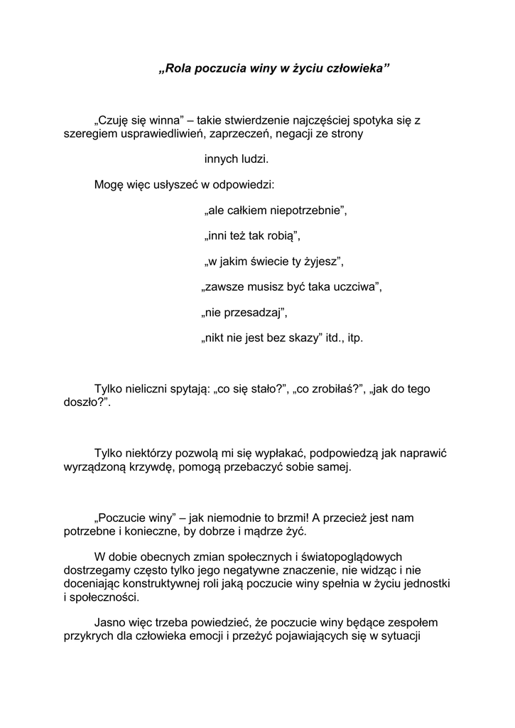 „Rola poczucia winy w życiu człowieka” „Czuję się winna” – takie stwierdzenie najczęściej spotyka się z szeregiem usprawiedliwień, zaprzeczeń, negacji ze strony innych ludzi. Mogę więc usłyszeć w odpowiedzi: „ale całkiem niepotrzebnie”, „inni też tak robią”, „w jakim świecie ty żyjesz”, „zawsze musisz być taka uczciwa”, „nie przesadzaj”, „nikt nie jest bez skazy” itd., itp. Tylko nieliczni spytają: „co się stało?”, „co zrobiłaś?”, „jak do tego doszło?”. Tylko niektórzy pozwolą mi się wypłakać, podpowiedzą jak naprawić wyrządzoną krzywdę, pomogą przebaczyć sobie samej. „Poczucie winy” – jak niemodnie to brzmi! A przecież jest nam potrzebne i konieczne, by dobrze i mądrze żyć. W dobie obecnych zmian społecznych i światopoglądowych dostrzegamy często tylko jego negatywne znaczenie, nie widząc i nie doceniając konstruktywnej roli jaką poczucie winy spełnia w życiu jednostki i społeczności. Jasno więc trzeba powiedzieć, że poczucie winy będące zespołem przykrych dla człowieka emocji i przeżyć pojawiających się w sytuacji postępowania niezgodnego z akceptowanym przez niego systemem wartości może pełnić funkcję konstruktywną bądź destrukcyjną. Zdrowe, racjonalne, adekwatne do popełnionej obiektywnej winy to tylko niektóre z określeń konstruktywnego poczucia winy, które odgrywa pozytywną rolę regulującą nasze postępowanie. Dostrzegając własną winę próbujemy naprawić wyrządzone krzywdy (zadośćuczynić w realnym wymiarze), chcemy przywrócić pierwotny stan relacji z drugim człowiekiem (doprowadzamy do pojednania), pragniemy otrzymać przebaczenie, w końcu staramy się przebaczyć sami sobie. W przypadku chorego, przesadnego, irracjonalnego, często nieświadomego i subiektywnego poczucia winy – słowem niszczącego nas i świat wokół nas, albo zaprzeczamy jego istnieniu czy za pomocą mechanizmów obronnych przerzucamy winę na innych, bądź bez końca: przepraszamy, bijemy się w piersi, rozpamiętujemy to co się stało, stawiamy się w gorszej pozycji (jako przegrani) itp. Podsumowując można stwierdzić, że gdy zdrowo przeżywam własną winę to otwieram się na drugiego człowieka, świat, przyszłość, Boga, mogę iść do przodu, rozwijać się i doskonalić. Natomiast nie daję sobie szansy na życie, radość, udane związki i kontakty z ludźmi trwając i „babrząc” się we własnej winie (często nie mającej obiektywnego odniesienia do rzeczywistości). Oczywiście, to jak przeżywam własną winę będzie zależało od tego, jakim jestem człowiekiem – na ile rozwinąłem się w sferze uczuciowej, moralnej i społecznej. Czy moi opiekunowie pomogli mi ukształtować wrażliwe i dojrzałe sumienie, czy „obudzili” we mnie poczucie odpowiedzialności, a równocześnie czy mnie kochali za to, że jestem, a nie za to jaki jestem, czy stawiali realistyczne wymagania, czy wybaczali mi moje dziecięce i młodzieńcze przewinienia, czy nie kształtowali we mnie postawy skrupulatności, czy wreszcie nie czynili tabu z niektórych sfer życia, czy nie rozbudzili we mnie lękowego nastawienia do świata, ludzi, Boga, ciała itp. Skoro poczucie winy jest związane z rozwojem człowieka, to można mówić o wychowaniu do zdrowego poczucia winy. Należy apelować o takie kształtowanie sumienia dziecka, by potrafiło brać winę na siebie, gdy zawini, a jednocześnie uczyć skutecznych i adekwatnych sposobów niwelowania poczucia winy bez przerzucania tej winy na innych. Patrząc na świat dorosłych młody człowiek często nie znajduje jednak w tym zakresie dobrych wzorców. Nie wchodząc na pole rodzinnych stosunków, skupmy się na chwilę na relacji rodzic – nauczyciel. W trakcie spotkań z nauczycielami na różnych warsztatach, podczas indywidualnych rozmów w szkole, czy na terenie poradni daje się odczuć wiele razy brak zrozumienia i empatii z ich strony w stosunku do rodziców uczniów, a czasem wręcz obwiniania…I odwrotnie, co drugi rodzic odwiedzający poradnię narzeka na nauczycieli uczących w szkole, do której uczęszcza ich dziecko. Obwinia danego nauczyciela za niepowodzenia szkolne swojej pociechy. Myślę, że w wielu przypadkach mamy do czynienia z przerzucaniem własnej winy na drugą stronę, z brakiem lub niedostateczną odpowiedzialnością za młodego czy całkiem małego człowieka. Owocem tej niedostatecznej odpowiedzialności za własne postępowanie, niedostrzegania, w czym zawiniłem, co źle zrobiłem, a widzenia winy w innych jest w wielu relacjach rodzic – nauczyciel brak jakiegokolwiek porozumienia, wzajemne unikanie się, koncentracja na doznanych urazach, a nie skoncentrowanie na dziecku i wypracowanie wspólnego frontu działania oraz pomocy. Skoro więc my – dorośli boimy się „poczuć winnymi” to jaki przykład dajemy naszym dzieciom? My dorośli: rodzice i nauczyciele oskarżamy się wzajemnie, a nasze dzieci – uczniowie patrzą i doświadczają, uczą się jak „umywać ręce”, „nie bić się w piersi”, widzieć zło, niedociągnięcia i zaniedbanie własnych obowiązków w drugim, a nie w sobie. Założeniem tego artykułu nie jest jednak wpędzanie odbiorcy w poczucie winy, a jedynie skłonienie do autorefleksji (zastanowienia się nad tym, jak przeżywam własną winę) oraz zachęta do pogłębienia tematu. Może ktoś wyciągnie z tej lektury własne wnioski i określi własne stanowisko bądź zainspiruje się do podjęcia działań profilaktyczno – edukacyjnych w tym zakresie. Znane jest powiedzenie, że poczucie winy jest złym doradcą, a ja na koniec dopowiem, że brak odczuwania realnej winy też nim być może. Aneta Sikora - psycholog