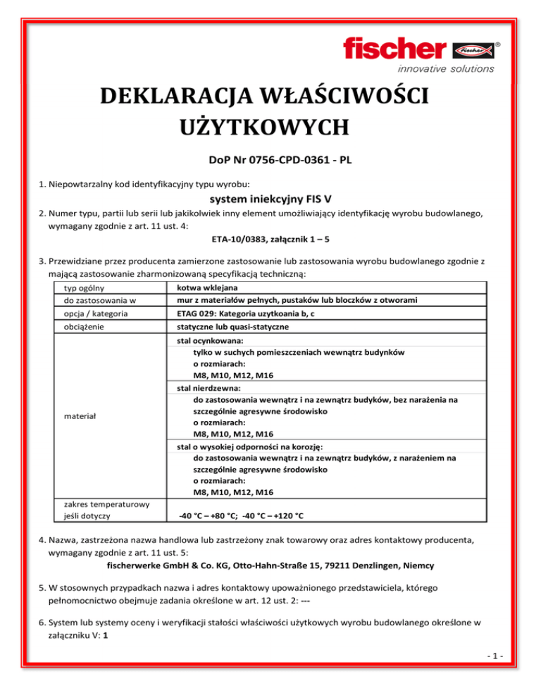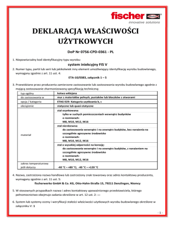 DEKLARACJA WŁAŚCIWOŚCI UŻYTKOWYCH DoP Nr 0756-CPD-0361 - PL 1. Niepowtarzalny kod identyfikacyjny typu wyrobu: system iniekcyjny FIS V 2. Numer typu, partii lub serii lub jakikolwiek inny element umożliwiający identyfikację wyrobu budowlanego, wymagany zgodnie z art. 11 ust. 4: ETA-10/0383, załącznik 1 – 5 3. Przewidziane przez producenta zamierzone zastosowanie lub zastosowania wyrobu budowlanego zgodnie z mającą zastosowanie zharmonizowaną specyfikacją techniczną: typ ogólny do zastosowania w kotwa wklejana mur z materiałów pełnych, pustaków lub bloczków z otworami opcja / kategoria ETAG 029: Kategoria uzytkoania b, c obciążenie statyczne lub quasi-statyczne stal ocynkowana: tylko w suchych pomieszczeniach wewnątrz budynków o rozmiarach: M8, M10, M12, M16 materiał stal nierdzewna: do zastosowania wewnątrz i na zewnątrz budyków, bez narażenia na szczególnie agresywne środowisko o rozmiarach: M8, M10, M12, M16 stal o wysokiej odporności na korozję: do zastosowania wewnątrz i na zewnątrz budyków, z narażeniem na szczególnie agresywne środowisko o rozmiarach: M8, M10, M12, M16 zakres temperaturowy jeśli dotyczy -40 °C – +80 °C; -40 °C – +120 °C 4. Nazwa, zastrzeżona nazwa handlowa lub zastrzeżony znak towarowy oraz adres kontaktowy producenta, wymagany zgodnie z art. 11 ust. 5: fischerwerke GmbH & Co. KG, Otto-Hahn-Straße 15, 79211 Denzlingen, Niemcy 5. W stosownych przypadkach nazwa i adres kontaktowy upoważnionego przedstawiciela, którego pełnomocnictwo obejmuje zadania określone w art. 12 ust. 2: --6. System lub systemy oceny i weryfikacji stałości właściwości użytkowych wyrobu budowlanego określone w załączniku V: 1 -1- 7. W przypadku deklaracji właściwości użytkowych dotyczącej wyrobu budowlanego objętego normą zharmonizowaną: --8. W przypadku deklaracji właściwości użytkowych dotyczącej wyrobu budowlanego, dla którego wydana została europejska ocena techniczna: Deutsches Institut für Bautechnik (DIBt) wydał(-a/-o) ETA-10/0383 na podstawie ETAG 029. ETAG 029 - Kategoria uzytkoania b, c and w/w MPA Darmstadt 0756-CPD o właściwościach (i) ustalenia typu wyrobu na podstawie badań typu (w tym pobierania próbek), obliczeń typu, tabelarycznych wartości lub opisowej dokumentacji wyrobu; (ii) wstępnej inspekcji zakładu produkcyjnego i zakładowej kontroli produkcji; (iii) stałego nadzoru, oceny i ewaluacji zakładowej kontroli produkcji. w systemie 1 i wydał(-a/-o) certyfikat stałości właściwości użytkowych 0756-CPD-0361. 9. Deklarowane właściwości użytkowe Zasadnicze charakterystyki nośność charakterystyczna na wyrywanie metoda projektowa Właściwości użytkowe ETAG 029 Annex C ETA-10/0383, załącznik 12, załącznik 13 próby na budowie, zob. ETA #NV ETAG 029 Annex C ETA-10/0383, załącznik 12, załącznik 13, załącznik 14 Job site tests, see ETA #NV ETAG 029 Annex C ETA-10/0383, załącznik 15 próby na budowie, zob. ETA #NV ETAG 029 Annex C ETA-10/0383, załącznik 14 próby na budowie, zob. ETA #NV nośność charakterystyczna na ścinanie minimalne odległośi osiowe i od krawędzi przemieszczenie w stanie granicznym użytkowania Zharmonizowana specyfikacja techniczna ETAG 029 10. Właściwości użytkowe wyrobu określone w pkt 1 i 2 są zgodne z właściwościami użytkowymi deklarowanymi w pkt 9. Niniejsza deklaracja właściwości użytkowych wydana zostaje na wyłączną odpowiedzialność producenta określonego w pkt 4. W imieniu producenta podpisał(-a): Wolfgang Hengesbach Dipl.-Ing., Dipl.-Wirtsch.-Ing. Zulassungen & Technische Dokumente Andreas Bucher Dipl.-Ing. Forschung & Technologietransfer -2- PL_FIS-V-MAUER_DoP-0756-CPD-0361_ETA-10-0383_2013-07-19.docx ZD_DOP_FIS-V-MAUER_F_#SALL_#AIP_#V1.pdf Waldachtal, 2013-06-18 -3PL_FIS-V-MAUER_DoP-0756-CPD-0361_ETA-10-0383_2013-07-19.docx ZD_DOP_FIS-V-MAUER_F_#SALL_#AIP_#V1.pdf