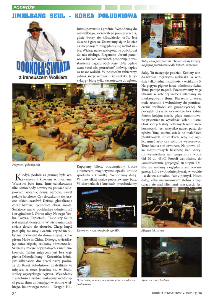 32'5Ïĩ( '&*'&)+$ 0"2) (,/" -,Ù2!+&,4 Brzmi poważnie i groźnie. Wchodzimy do niewielkiego, kiczowatego pomieszczenia, gdzie tłoczy się kilkadziesiąt osób. Jest duszno i gorąco. Ustawiamy się w kolejce i z niepokojem rozglądamy się wokół siebie. Widząc nasze zakłopotanie podchodzi do nas obsługa. Elegancko ubrani panowie w białych koszulach proponują pozostawienie bagażu obok kasy. „Nie będzie wam tutaj nic potrzebne” mówią, łapiąc za nasze walizki. W pospiechu zabieramy jednak swoje ręczniki i kosmetyki. Ja ryzykuję - biorę tylko szczoteczkę do zębów. Fragment głównej sali K iedyś, podróż za granicę była wyzwaniem i krokiem w nieznane. Wszystko było inne. Inne oznakowania ulic, samochody, towary na półkach sklepowych, ubrania, domy, ogródki, nawet pokoje hotelowe. Czy doczekamy się jeszcze takich czasów? Dzisiaj, globalizacja coraz bardziej ujednolica obraz świata. Światowe marki pochłaniają odmienność i oryginalność. Obraz ulicy Nowego Yorku, Paryża, Kapsztadu, Tokio czy Seulu jest niemal identyczny. W wielu miejscach świata doszło do absurdu. Chcąc kupić pamiątkę musimy uważnie czytać metki, by nie przywieźć do domu ciupagi z napisem Made in China. Dlatego, wyjeżdżając coraz częściej szukamy odmienności. Szukamy miejsc oryginalnych i nietuzinkowych. Takim miejscem jest bez wątpienia Dżimdżilbang – Koreańska łaźnia. Już kilkanaście dni przed naszą podróżą do Korei Południowej znaleźliśmy to miejsce. A teraz jesteśmy tu, w Seulu, stolicy azjatyckiego tygrysa. Wysiadamy z autobusu i szybko zostajemy wchłonięci przez tłum zmierzający w stronę wielkiego, kolorowego neonu - Dragon Hill. 24 Tutaj nastepuje podział. Osobne windy kierują na piętra przeznaczone dla kobiet i mężczyzn Kupujemy bilety, otrzymujemy klucze z numerem, magnetyczne opaski, krótkie spodenki i koszulkę. Wchodzimy dalej. W niewielkiej szafce pozostawiamy buty. W skarpetkach i kurtkach przechodzimy dalej. Tu następuje podział. Kobiety winda różowa, mężczyźni niebieska. W windzie tylko jedna możliwość - wciskamy 5. Na piątym piętrze jakże odmienny świat. Tutaj panuje nagość. Pozostawiamy więc ubrania w kolejnej szafce i wtapiamy się nieskrępowany tłum. Bierzemy z kosza małe ręczniki i wchodzimy do pomieszczenia wielkości sali gimnastycznej. Na początek prysznic oczywiście bez kabin. Potem kolejna strefa, gdzie zamontowano prysznice na wysokości kolan i lustra, obok których stały pokaźnych rozmiarów kosmetyki. Jest wszystko nawet pasta do zębów. Tutaj można usiąść na maleńkich plastikowych stołeczkach żeby się ogolić, umyć zęby czy solidnie wyszorować. Teraz łaźnia stoi otworem. Na prawo kilka marmurowych basenów, nad którymi wyświetlana jest temperatura wody. Od 20 do 45oC. Powoli wchodzimy do „umiarkowanie gorącego”, 38 stopni. Delikatnie siadamy i oglądamy zafoliowane gazety, które swobodnie pływają w wodzie - o dziwo aktualne. Fajny pomysł. Nieco dalej, kilka marmurowych stołów i znęcający się nad klientami masażyści. Jest Kolorowy neon, oryginalnego SPA Miejsca luksusowe O pierwszej w nocy, wiekszośc graczy nadal na posterunku. Spocznik na schodach KURIER POWIATOWY Ɣ1/2016 (136) 32'5Ïĩ( i „salon piękności” z lustrami dookoła, w którym suszy i układa się włosy, wciera kremy, czyści uszy i obcina paznokcie. Mam wrażenie, że użytkownicy Dżimdżilbangu czują się tutaj, jak w prywatnej łazience. Obok kilka przyciemnionych sal, gdzie można odpocząć - oczywiście nago. Koreańczycy chętnie przychodzą do łaźni całymi rodzinami i w towarzystwie znajomych. Nie ma ograniczeń wiekowych. Podczas kąpieli wszyscy czują się swobodnie i wydaje się, jakby nie dostrzegali innych. Odziany w firmowy strój, zjeżdżam kilka pięter niżej - tu znajduje się przestrzeń wspólna dla kobiet i mężczyzn. Jest restauracja, bar z przekąskami, salon gier, klub fitness, siłownia, fryzjer i wyjście na zewnętrzny basen. W głębi, ogromna sala otoczona saunami o różnej temperaturze, grota solna, lodowa, łaźnie Recepcja Bar z przekaskami. Rachunek regulujemy za pomocą magnetycznej opaski. parowe, łaźnia z wodą morską i sala wysypana ciepłymi kamieniami. Taki kiczowaty miszmasz, kamieni, szkiełek i świecidełek. Jest coś z zeń-szeniem i z minerałami - ale to wiedzą już tylko kobiety. Najwyższe piętro to widokowy taras z panoramą Seulu i restauracje. W jednej z nich Koreański przysmak. Jajka gotowane na kilka sposobów. W sosie sojowym z dodatkiem cukru trzcinowym, cebuli lub winie ryżowym. łogi. Luksus, to miejsce przy ścianie z widokiem na wielkoformatowy telewizor. Szczęśliwcy zajmują fotele przy maszynach grających albo płatne do masażu. Niestety, Szafki na buty z numeracją od 1 do 5000 z przyjemnością po kilkunastu dniach kulinarnego eksperymentu, zamawiamy koreańskie kurczaki w stylu KFC i zimne piwo. Robi się późno - trzeba iść spać - ale gdzie? Odpowiedź – wszędzie. Wszystkie pomieszczenia w wielopiętrowym budynku posiadają podgrzewane podłogi. Z regału zabieramy twardy, kwadratowy podgłówek. Zajmujemy dowolny kawałek podKURIER POWIATOWY Ɣ1/2016 (136) my wciskamy się pomiędzy przytulonych do siebie Koreańczyków. Po kilku minutach mam wrażenie, że moje ciało składa się wyłącznie z kości. Biodro gniecie, żebra się przemieszczają, łopatki wystają. Na dodatek trzeba precyzyjnie dobrać wygięcie ciała, adekwatnie do sąsiadów. Otwieram oczy, jest pierwsza w nocy chyba trochę spałem - zabieram tablet i delikatnie stąpając pomiędzy „smacznie” śpiącymi rodzinami robię z ukrycia kilka zdjęć. Niestety fotografowanie nie jest mile widziane, a w wielu strefach zakazane. Po nocnym spacerze ponownie próbuję znaleźć miejsce, przesuwając delikatnie nogi sąsiadów. Domyślam się nurtujących Was pytań. Było czysto i pachnąco. W weekendy do Dżimdżilbangu przych