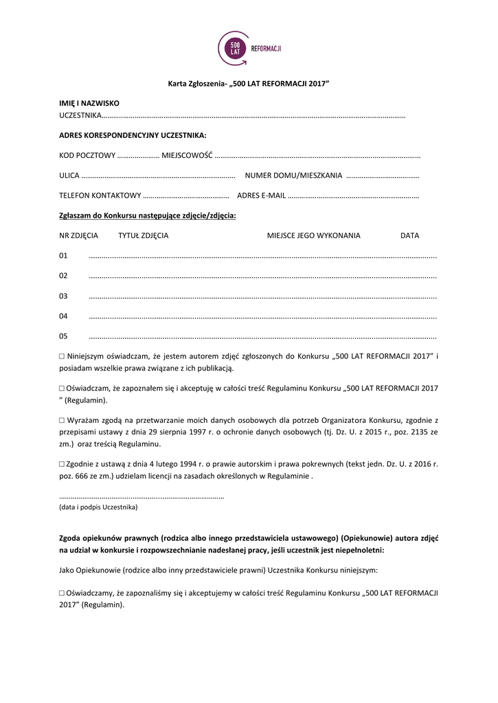 Karta Zgłoszenia- „500 LAT REFORMACJI 2017” IMIĘ I NAZWISKO UCZESTNIKA………..………………………………………………………………………………………………………………………………… ADRES KORESPONDENCYJNY UCZESTNIKA: KOD POCZTOWY ………….……… MIEJSCOWOŚĆ ………………………………………………………………………..…………………… ULICA …………………………………………………………………….. NUMER DOMU/MIESZKANIA ………………..……………… TELEFON KONTAKTOWY ……………………………………… ADRES E-MAIL ……………………………..……………………..……. Zgłaszam do Konkursu następujące zdjęcie/zdjęcia: NR ZDJĘCIA TYTUŁ ZDJĘCIA MIEJSCE JEGO WYKONANIA DATA 01 ..................................................................................................................................................................... 02 ..................................................................................................................................................................... 03 ..................................................................................................................................................................... 04 ..................................................................................................................................................................... 05 ..................................................................................................................................................................... □ Niniejszym oświadczam, że jestem autorem zdjęć zgłoszonych do Konkursu „500 LAT REFORMACJI 2017” i posiadam wszelkie prawa związane z ich publikacją. □ Oświadczam, że zapoznałem się i akceptuję w całości treść Regulaminu Konkursu „500 LAT REFORMACJI 2017 ” (Regulamin). □ Wyrażam zgodą na przetwarzanie moich danych osobowych dla potrzeb Organizatora Konkursu, zgodnie z przepisami ustawy z dnia 29 sierpnia 1997 r. o ochronie danych osobowych (tj. Dz. U. z 2015 r., poz. 2135 ze zm.) oraz treścią Regulaminu. □ Zgodnie z ustawą z dnia 4 lutego 1994 r. o prawie autorskim i prawa pokrewnych (tekst jedn. Dz. U. z 2016 r. poz. 666 ze zm.) udzielam licencji na zasadach określonych w Regulaminie . …………………….............................………………………… (data i podpis Uczestnika) Zgoda opiekunów prawnych (rodzica albo innego przedstawiciela ustawowego) (Opiekunowie) autora zdjęć na udział w konkursie i rozpowszechnianie nadesłanej pracy, jeśli uczestnik jest niepełnoletni: Jako Opiekunowie (rodzice albo inny przedstawiciele prawni) Uczestnika Konkursu niniejszym: □ Oświadczamy, że zapoznaliśmy się i akceptujemy w całości treść Regulaminu Konkursu „500 LAT REFORMACJI 2017” (Regulamin). □ Wyrażamy zgodę na udział wskazanego powyżej Uczestnika w konkursie „500 LAT REFORMACJI 2017” na zasadach określonych w Regulaminie. □ Wyrażamy zgodę na przetwarzanie danych osobowych wskazanego powyżej Uczestnika dla potrzeb Organizatora Konkursu, zgodnie z przepisami ustawy z dnia 29 sierpnia 1997 r. o ochronie danych osobowych (tj. Dz. U. z 2015 r., poz. 2135 ze zm.) oraz treścią Regulaminu. .............................................................................. (data i czytelny podpis Opiekuna Uczestnika) Kartę Zgłoszenia do Konkursu oraz zdjęcia w formie cyfrowej przygotowane zgodnie z Regulaminem należy przesłać mailowo na adres: [email protected]