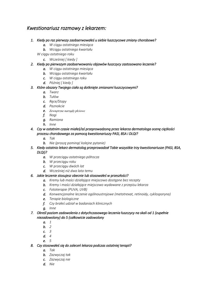 Kwestionariusz rozmowy z lekarzem: 1. Kiedy po raz pierwszy zaobserwowałeś u siebie łuszczycowe zmiany chorobowe? a. W ciągu ostatniego miesiąca b. Wciągu ostatniego kwartału W ciągu ostatniego roku c. Wcześniej [ kiedy ] 2. Kiedy po pierwszym zaobserwowaniu objawów łuszczycy zastosowano leczenie? a. W ciągu ostatniego miesiąca b. Wciągu ostatniego kwartału c. W ciągu ostatniego roku d. Później [ kiedy ] 3. Które obszary Twojego ciała są dotknięte zmianami łuszczycowymi? a. Twarz b. Tułów c. Ręce/Stopy d. Paznokcie e. Zewnętrzne narządy płciowe f. Nogi g. Ramiona h. Inne 4. Czy w ostatnim czasie miałeś/aś przeprowadzoną przez lekarza dermatologa ocenę ciężkości procesu chorobowego za pomocą kwestionariuszy PASI, BSA i DLQI? a. Tak b. Nie (proszę pominąć kolejne pytanie) 5. Kiedy ostatnio lekarz dermatolog przeprowadzał Tobie wszystkie trzy kwestionariusze (PASI, BSA, DLQI)? a. W przeciągu ostatniego półrocza b. W przeciągu roku c. W przeciągu dwóch lat d. Wcześniej niż dwa lata temu 6. Jakie leczenie stosujesz obecnie lub stosowałeś w przeszłości? a. Kremy lub maści działające miejscowo dostępne bez recepty b. Kremy i maści działające miejscowo wydawane z przepisu lekarza c. Fototerapie (PUVA, UVB) d. Konwencjonalne leczenie ogólnoustrojowe (metotrexat, retinoidy, cyklosporyna) e. Terapie biologiczne f. Czy brałeś udział w badaniach klinicznych g. Inne 7. Określ poziom zadowolenia z dotychczasowego leczenia łuszczycy na skali od 1 (zupełnie niezadowolony) do 5 (całkowicie zadowolony a. 1 b. 2 c. 3 d. 4 e. 5 8. Czy stosowałeś się do zaleceń lekarza podczas ostatniej terapii? a. Tak b. Zazwyczaj tak c. Zazwyczaj nie d. Nie 9. Czy ostatnio wystąpiło u Ciebie pogorszenie objawów łuszczycy? a. Tak b. Nie (proszę pominąć kolejne pytanie) 10. Co według Ciebie było przyczyną ewentualnego pogorszenia/nasilenia objawów łuszczycy? a. Infekcja b. Zmiana lub odstawienie leku c. Stres d. Inna przyczyna [ jaka ] 11. Jak określiłbyś najsilniejszy nawrót łuszczycy w swoim życiu? a. Ciężki b. Umiarkowany c. Łagodny 12. Jak silnie zazwyczaj odczuwasz objawy łuszczycy (swędzenie, pieczenie itp.)? a. Bardzo b. Średnio c. Mało 13. Na ile czułeś się zakłopotany bądź zażenowany stanem swojej skóry? a. W ogóle b. Nieco c. Bardzo 14. Czy stan Twojej skóry powodował/powoduje problemy w relacjach z partnerem, przyjaciółmi bądź rodziną? a. Nie b. Niewielkie c. Duże 15. Na ile stan Twojej skóry ma wpływ na Twoje życie towarzyskie lub ulubioną formę spędzania wolnego czasu? a. W ogóle nie ma wpływu b. Ma niewielki wpływ c. Ma bardzo duży wpływ 16. Na ile stan Twojej skóry ma wpływ na Twoją pracę bądź naukę? a. W ogóle b. Ma niewielki wpływ c. Bardzo duży wpływ 17. Jak bardzo stan Twojej skóry i leczenie objawów łuszczycy wpływało na wybór ubrań, w których chodziłeś? a. W ogóle b. Ma niewielki wpływ c. Bardzo duży wpływ