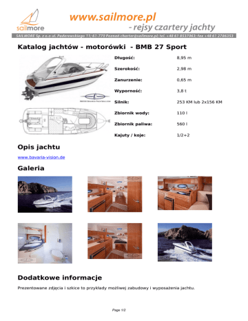 Katalog jachtów - motorówki - BMB 27 Sport Długość: 8,95 m Szerokość: 2,98 m Zanurzenie: 0,65 m Wyporność: 3,8 t Silnik: 253 KM lub 2x156 KM Zbiornik wody: 110 l Zbiornik paliwa: 560 l Kajuty / koje: 1/2+2 Opis jachtu www.bavaria-vision.de Galeria Dodatkowe informacje Prezentowane zdjęcia i szkice to przykłady możliwej zabudowy i wyposażenia jachtu. Page 1/2 Czarterowany jacht może różnić się elementami wykończenia, wyposażenia czy kolorystyką zabudowy gdyż stocznie jachtowe umożliwiają dużą dowolność w doborze poszczególnych elementów wyposażenia wnętrza. W efekcie jachty tego samego typu mogą różnić się ilością kabin, a nawet dopuszczeniem do żeglugi dla różnej ilości osób. Tak więc możliwie dokładne dane na temat czarterowanej jednostki dostarczamy na życzenie dokonując jej ostatecznej rezerwacji. Page 2/2