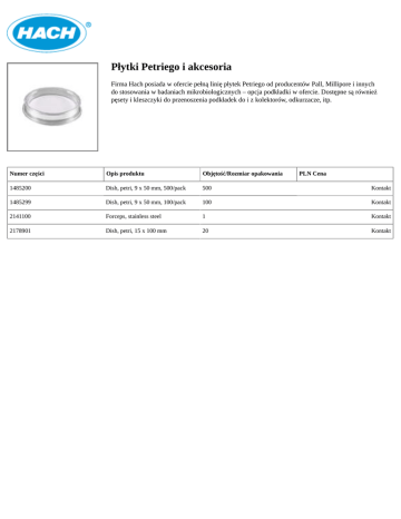 Płytki Petriego i akcesoria Firma Hach posiada w ofercie pełną linię płytek Petriego od producentów Pall, Millipore i innych do stosowania w badaniach mikrobiologicznych – opcja podkładki w ofercie. Dostępne są również pęsety i kleszczyki do przenoszenia podkładek do i z kolektorów, odkurzacze, itp. Numer części Opis produktu Objętość/Rozmiar opakowania PLN Cena 1485200 Dish, petri, 9 x 50 mm, 500/pack 500 Kontakt 1485299 Dish, petri, 9 x 50 mm, 100/pack 100 Kontakt 2141100 Forceps, stainless steel 1 Kontakt 2178901 Dish, petri, 15 x 100 mm 20 Kontakt