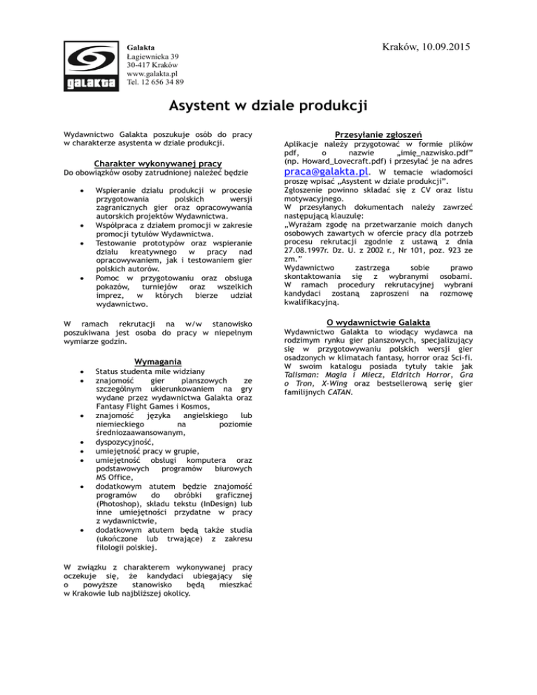 Kraków, 10.09.2015 Galakta Łagiewnicka 39 30-417 Kraków www.galakta.pl Tel. 12 656 34 89 Asystent w dziale produkcji Wydawnictwo Galakta poszukuje osób do pracy w charakterze asystenta w dziale produkcji. Charakter wykonywanej pracy Do obowiązków osoby zatrudnionej należeć będzie Wspieranie działu produkcji w procesie przygotowania polskich wersji zagranicznych gier oraz opracowywania autorskich projektów Wydawnictwa. Współpraca z działem promocji w zakresie promocji tytułów Wydawnictwa. Testowanie prototypów oraz wspieranie działu kreatywnego w pracy nad opracowywaniem, jak i testowaniem gier polskich autorów. Pomoc w przygotowaniu oraz obsługa pokazów, turniejów oraz wszelkich imprez, w których bierze udział wydawnictwo. W ramach rekrutacji na w/w stanowisko poszukiwana jest osoba do pracy w niepełnym wymiarze godzin. Wymagania Status studenta mile widziany znajomość gier planszowych ze szczególnym ukierunkowaniem na gry wydane przez wydawnictwa Galakta oraz Fantasy Flight Games i Kosmos, znajomość języka angielskiego lub niemieckiego na poziomie średniozaawansowanym, dyspozycyjność, umiejętność pracy w grupie, umiejętność obsługi komputera oraz podstawowych programów biurowych MS Office, dodatkowym atutem będzie znajomość programów do obróbki graficznej (Photoshop), składu tekstu (InDesign) lub inne umiejętności przydatne w pracy z wydawnictwie, dodatkowym atutem będą także studia (ukończone lub trwające) z zakresu filologii polskiej. W związku z charakterem wykonywanej pracy oczekuje się, że kandydaci ubiegający się o powyższe stanowisko będą mieszkać w Krakowie lub najbliższej okolicy. Przesyłanie zgłoszeń Aplikacje należy przygotować w formie plików pdf, o nazwie „imię_nazwisko.pdf” (np. Howard_Lovecraft.pdf) i przesyłać je na adres [email protected]. W temacie wiadomości proszę wpisać „Asystent w dziale produkcji”. Zgłoszenie powinno składać się z CV oraz listu motywacyjnego. W przesyłanych dokumentach należy zawrzeć następującą klauzulę: „Wyrażam zgodę na przetwarzanie moich danych osobowych zawartych w ofercie pracy dla potrzeb procesu rekrutacji zgodnie z ustawą z dnia 27.08.1997r. Dz. U. z 2002 r., Nr 101, poz. 923 ze zm.” Wydawnictwo zastrzega sobie prawo skontaktowania się z wybranymi osobami. W ramach procedury rekrutacyjnej wybrani kandydaci zostaną zaproszeni na rozmowę kwalifikacyjną. O wydawnictwie Galakta Wydawnictwo Galakta to wiodący wydawca na rodzimym rynku gier planszowych, specjalizujący się w przygotowywaniu polskich wersji gier osadzonych w klimatach fantasy, horror oraz Sci-fi. W swoim katalogu posiada tytuły takie jak Talisman: Magia i Miecz, Eldritch Horror, Gra o Tron, X-Wing oraz bestsellerową serię gier familijnych CATAN.