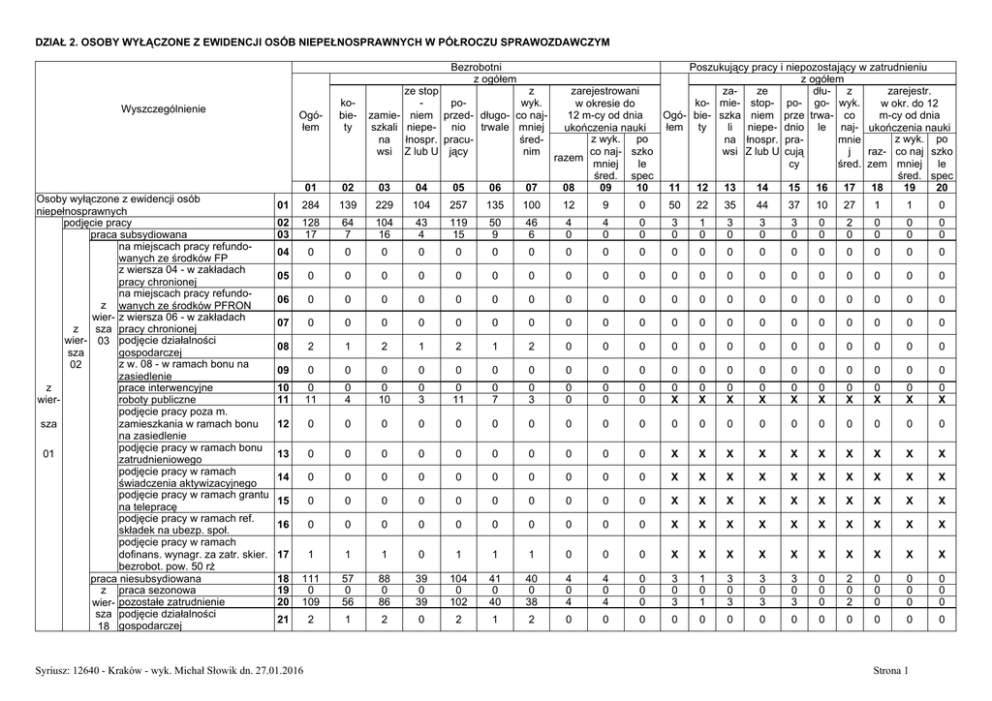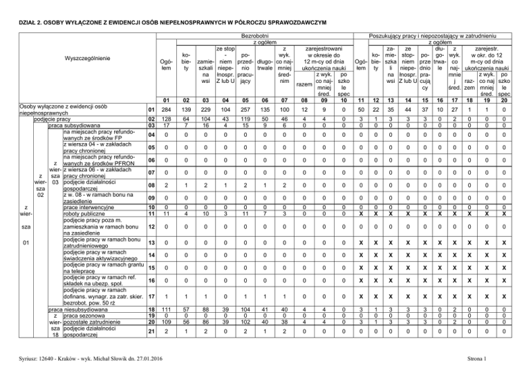 DZIAŁ 2. OSOBY WYŁĄCZONE Z EWIDENCJI OSÓB NIEPEŁNOSPRAWNYCH W PÓŁROCZU SPRAWOZDAWCZYM Bezrobotni z ogółem Ogółem kobiety 01 02 01 284 139 229 104 257 135 100 12 9 0 50 22 35 44 37 10 27 1 1 0 02 03 128 17 64 7 104 16 43 4 119 15 50 9 46 6 4 0 4 0 0 0 3 0 1 0 3 0 3 0 3 0 0 0 2 0 0 0 0 0 0 0 04 0 0 0 0 0 0 0 0 0 0 0 0 0 0 0 0 0 0 0 0 05 0 0 0 0 0 0 0 0 0 0 0 0 0 0 0 0 0 0 0 0 06 0 0 0 0 0 0 0 0 0 0 0 0 0 0 0 0 0 0 0 0 07 0 0 0 0 0 0 0 0 0 0 0 0 0 0 0 0 0 0 0 0 08 2 1 2 1 2 1 2 0 0 0 0 0 0 0 0 0 0 0 0 0 09 0 0 0 0 0 0 0 0 0 0 0 0 0 0 0 0 0 0 0 0 10 11 0 11 0 4 0 10 0 3 0 11 0 7 0 3 0 0 0 0 0 0 0 X 0 X 0 X 0 X 0 X 0 X 0 X 0 X 0 X 0 X 12 0 0 0 0 0 0 0 0 0 0 0 0 0 0 0 0 0 0 0 0 13 0 0 0 0 0 0 0 0 0 0 X X X X X X X X X X 14 0 0 0 0 0 0 0 0 0 0 X X X X X X X X X X 15 0 0 0 0 0 0 0 0 0 0 X X X X X X X X X X 16 0 0 0 0 0 0 0 0 0 0 X X X X X X X X X X 17 1 1 1 0 1 1 1 0 0 0 X X X X X X X X X X 18 19 20 111 0 109 57 0 56 88 0 86 39 0 39 104 0 102 41 0 40 40 0 38 4 0 4 4 0 4 0 0 0 3 0 3 1 0 1 3 0 3 3 0 3 3 0 3 0 0 0 2 0 2 0 0 0 0 0 0 0 0 0 21 2 1 2 0 2 1 2 0 0 0 0 0 0 0 0 0 0 0 0 0 Wyszczególnienie Osoby wyłączone z ewidencji osób niepełnosprawnych podjęcie pracy praca subsydiowana na miejscach pracy refundowanych ze środków FP z wiersza 04 - w zakładach pracy chronionej na miejscach pracy refundoz wanych ze środków PFRON wier- z wiersza 06 - w zakładach z sza pracy chronionej wier- 03 podjęcie działalności sza gospodarczej z w. 08 - w ramach bonu na 02 zasiedlenie z prace interwencyjne wierroboty publiczne podjęcie pracy poza m. sza zamieszkania w ramach bonu na zasiedlenie podjęcie pracy w ramach bonu 01 zatrudnieniowego podjęcie pracy w ramach świadczenia aktywizacyjnego podjęcie pracy w ramach grantu na telepracę podjęcie pracy w ramach ref. składek na ubezp. społ. podjęcie pracy w ramach dofinans. wynagr. za zatr. skier. bezrobot. pow. 50 rż praca niesubsydiowana z praca sezonowa wier- pozostałe zatrudnienie sza podjęcie działalności 18 gospodarczej Poszukujący pracy i niepozostający w zatrudnieniu z ogółem ze stop z zaze dłuz zarejestrowani zarejestr. powyk. ko- mie- stop- po- go- wyk. w okresie do w okr. do 12 zamie- niem przed- długo- co najOgó- bie- szka niem prze trwa- co 12 m-cy od dnia m-cy od dnia szkali niepe- nio trwale mniej łem ty li niepe- dnio le naj- ukończenia nauki ukończenia nauki z wyk. po z wyk. po na łnospr. pracuśredna łnospr. pramnie co naj- szko raz- co naj szko wsi Z lub U jący nim wsi Z lub U cują j razem mniej le cy śred. zem mniej le śred. spec śred. spec 03 04 05 06 07 08 09 10 11 12 13 14 15 16 17 18 19 20 Syriusz: 12640 - Kraków - wyk. Michał Słowik dn. 27.01.2016 Strona 1 DZIAŁ 2. OSOBY WYŁĄCZONE Z EWIDENCJI OSÓB NIEPEŁNOSPRAWNYCH W PÓŁROCZU SPRAWOZDAWCZYM (c.d.) Bezrobotni z ogółem zarejestrowani w okresie do 12 m-cy od dnia ukończenia nauki z wyk. po co naj- szko razem mniej le śred. spec 08 09 10 4 2 0 Ogółem kobiety 22 01 27 02 16 03 25 04 12 05 24 06 16 07 13 23 0 0 0 0 0 0 0 0 0 0 0 0 0 0 0 0 0 0 0 0 24 20 9 14 4 19 16 10 0 0 0 0 0 0 0 0 0 0 0 0 0 25 0 0 0 0 0 0 0 0 0 0 0 0 0 0 0 0 0 0 0 0 26 0 0 0 0 0 0 0 0 0 0 0 0 0 0 0 0 0 0 0 0 27 2 1 2 0 2 0 0 0 0 0 X X X X X X X X X X 28 0 0 0 0 0 0 0 0 0 0 X X X X X X X X X X 29 0 0 0 0 0 0 0 0 0 0 0 0 0 0 0 0 0 0 0 0 30 2 1 2 0 2 2 0 0 0 0 X X X X X X X X X X 31 2 2 0 2 1 0 2 1 1 0 0 0 0 0 0 0 0 0 0 0 32 1 0 1 0 1 0 0 0 0 0 X X X X X X X X X X 33 0 0 0 0 0 0 0 0 0 0 X X X X X X X X X X 34 26 12 18 10 23 14 9 2 2 0 19 7 15 16 14 4 11 1 1 0 35 5 3 4 0 5 5 2 0 0 0 0 0 0 0 0 0 0 0 0 0 36 6 4 5 3 5 4 3 0 0 0 0 0 0 0 0 0 0 0 0 0 37 10 9 8 4 10 0 5 0 0 0 0 0 0 0 0 0 0 0 0 0 38 39 34 21 12 6 27 19 14 12 27 19 11 17 7 3 0 1 0 0 0 0 6 20 2 12 4 12 6 17 5 13 0 5 0 12 0 0 0 0 0 0 Wyszczególnienie rozpoczęcie szkolenia z wiersza 22 - w ramach bonu szkoleniowego rozpoczęcie stażu z wiersza 24 - w ramach bonu stażowego rozpoczęcie przygotowania zawodowego dorosłych rozpoczęcie pracy społecznie użytecznej z wiersza 27 - w ramach PAI rozpoczęcie realizacji indywidualnego programu zatrudnienia socjalnego lub podpisania kontraktu socjalnego skierowanie do agencji zatrudnienia w z ramach zlecania działań aktywizacyjnych wier- podjęcie nauki odmowa bez uzasadnionej przyczyny przyjęcia propozycji odpowiedniej pracy sza lub innej formy pomocy, w tym w ramach PAI 01 odmowa ustalenia profilu pomocy rezygnacja lub niepotwierdzenie gotowości do pracy osiągnięcie wieku emerytalnego nabycie praw emerytalnych lub rentowych nabycie praw do świadczenia przedemerytalnego utrata statusu osoby niepełnosprawnej inne ze stop z powyk. zamie- niem przed- długo- co najszkali niepe- nio trwale mniej na łnospr. pracuśredwsi Z lub U jący nim Poszukujący pracy i niepozostający w zatrudnieniu z ogółem zaze dłuz zarejestr. ko- mie- stop- po- go- wyk. w okr. do 12 Ogóbie- szka niem prze trwa- co m-cy od dnia łem ty li niepe- dnio le naj- ukończenia nauki z wyk. po na łnospr. pramnie raz- co naj szko wsi Z lub U cują j cy śred. zem mniej le śred. spec 11 12 13 14 15 16 17 18 19 20 2 0 1 2 2 1 2 0 0 0 Syriusz: 12640 - Kraków - wyk. Michał Słowik dn. 27.01.2016 Strona 2 DZIAŁ 3. OSOBY BĘDĄCE W EWIDENCJI OSÓB NIEPEŁNOSPRAWNYCH W KOŃCU PÓŁROCZA SPRAWOZDAWCZEGO, CZĘŚĆ 1 Bezrobotni w tym 01 02 03 04 05 Poszukujący pracy i niepozostający w zatrudnieniu w tym według według kowedług według Ogówedług grup wykształce niepełnosp biewykształce niepełnospraw łem wieku nia rawości ty nia ości ze co specj pow co ze stopi najm alny yżej najm stopei specjal specj eń Z 18- 25specj niej mi 50 niej ń Z lub nymi alne lub U 24 29 alne śred scho roku śred U schorz nie rzeni życia nie eniami ami 06 07 08 09 10 11 12 13 14 15 16 17 18 01 386 167 21 17 230 114 3 127 92 81 21 2 6 41 45 0 73 26 02 03 04 05 06 340 172 220 353 132 146 81 80 153 61 14 11 5 10 4 15 10 10 13 4 200 88 144 222 78 93 50 58 102 46 1 1 1 1 0 103 51 67 107 42 83 52 59 83 23 63