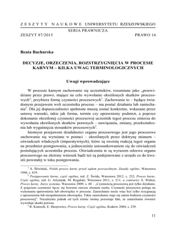 Z E S Z Y T Y N A U K O W E UNIWERSYTETU RZESZOWSKIEGO SERIA PRAWNICZA ZESZYT 87/2015 PRAWO 16 Beata Bachurska DECYZJE, ORZECZENIA, ROZSTRZYGNIĘCIA W PROCESIE KARNYM – KILKA UWAG TERMINOLOGICZNYCH Uwagi wprowadzające W procesie karnym zachowanie się uczestników, rozumiane jako „przewidziane przez prawo, mające na celu wywołanie określonych skutków procesowych”, przybiera formę czynności procesowych1. Zachowanie to – będące świadomym przejawem woli uczestnika procesu – ma postać działania lub zaniechania2. Dla jej dopuszczalności spełnione muszą zostać konkretne, wskazane przez ustawę warunki, takie jak forma, termin czy uprawniony podmiot, a poprzez dokonanie określonej czynności procesowej uczestnik tegoż procesu zmierza do wywołania określonych skutków prawnych – nawiązania, zmiany, przekształcenia lub wygaśnięcia stosunków procesowych3. Istotnym przejawem działalności organu procesowego jest jego procesowe zachowanie się wyrażane w postaci – określanych przez doktrynę mianem – oświadczeń władczych (imperatywnych), które są swoistą reakcją tegoż organu na przedmiot postępowania, a jednocześnie ustosunkowaniem się do oświadczeń postulujących uczestnika procesu. Oświadczenia te są wyrazem odzewu organu procesowego na złożony wniosek bądź też są podejmowane z urzędu co do kwestii powstałej w toku postępowania. 1 S. Śliwiński, Polski proces karny przed sądem powszechnym. Zasady ogólne, Warszawa 1948, s. 419. 2 Postępowanie karne, część ogólna, red. Z. Świda, Warszawa 2012, s. 232; Proces karny. Część ogólna, red. G. Artymiak, M. Rogalski, Warszawa 2011, s. 211; a contrario: S. Waltoś, Proces karny. Zarys systemu, Warszawa 2009, s. 48 – „Czynnością procesową jest tylko działanie. Z pojęciem czynności łączy się bowiem zawsze element ruchu. Czynność procesowa polega na wykonaniu uprawnienia lub obowiązku w procesie. Zaniechanie może więc być tylko rezygnacją z uprawnienia lub niespełnieniem obowiązku. Takie zaniechanie staje się zatem brakiem czynności procesowej”. Niezależnie jednak od tych różnic istotny pozostaje fakt, że zaniechanie również wywołuje skutki prawne. 3 R. Kmiecik, E. Skrętowicz, Proces karny. Część ogólna, Kraków 2004, s. 239. 11 Wspomniane wyżej oświadczenia postulujące uczestnika procesu należą natomiast do oświadczeń woli polegających na przekazaniu przez niego treści intelektualnej, będąc obok spostrzeżeń procesowych i czynności realnych rodzajem czynności procesowych. W swoich oświadczeniach woli (m.in. wnioskach, podaniach, prośbach, np. we wniosku dowodowym) uczestnicy procesu wyrażają swoje dążenia i zamierzenia. O faktycznym bycie oświadczenia woli decyduje istnienie woli w chwili jej powzięcia, a następnie wyrażenia. Natomiast o jego prawidłowości decyduje także i to, aby wola ta nie była dotknięta wadą, gdyż mogłoby to prowadzić do ewentualnego uchylenia się od skutków takiego oświadczenia. Wola może być wyrażona wprost przez tego, kto ją powziął, jak i możliwe jest „zastępstwo” w tej kwestii, np. przez pełnomocnika procesowego. Oświadczenia procesowe Istotne znaczenie dla wydawania władczych oświadczeń woli w przypadku sądu karnego ma zasada samodzielności jurysdykcyjnej. Oznacza ona autonomię orzekania w przedmiocie procesu, tj. sąd karny rozstrzyga samodzielnie zagadnienia faktyczne i prawne oraz nie jest związany rozstrzygnięciem innego sądu lub organu. Ścisły wyjątek od tej zasady zawiera art. 8 § 2 k.p.k., który stanowi o wiążącym dla sądu prawomocnym rozstrzygnięciu kształtującym prawo lub stosunek prawny. Forum dla wydawania przez sąd imperatywnych oświadczeń woli zgodnie z art. 95 k.p.k. jest rozprawa w wypadkach przewidzianych przez ustawę, a w innych – posiedzenie, z tym że orzeczenia podejmowane na posiedzeniu mogą zapadać również na rozprawie. Oświadczenia imperatywne organów procesowych przybierające postać decyzji procesowych są z reguły czynnościami nieodwołalnymi. Niewątpliwie wiąże się to z postulatem pewności obrotu prawnego, tzw. zasadą stałości orzeczeń. Niemniej jednak od reguły nieodwołalności jest sporo wyjątków. Odwoływalność ma dwojaki charakter – wewnętrzny i zewnętrzny. Odwoływalność in foro interno umożliwia nawet całkowitą zmianę decyzji procesowej przed udostępnieniem jej osobom postronnym. Zatem przy spełnieniu dwóch warunków, po pierwsze, jeżeli zgodzi się na to wymagana przepisami większość składu orzekającego, jeśli taki skład wydaje decyzję, po drugie zaś, jeżeli jej treści nie poznał nikt poza osobami biorącymi udział w jej wydawania i ewentualnie protokolantem, można zmienić każdą decyzję. Odwoływalność natomiast in foro externo, czyli możliwość nawet całkowitej zmiany decyzji procesowej znanej już stronom, jest dopuszczalna w następujących przypadkach: 12 1) zgodnie z treścią art. 463 § 1 k.p.k. sąd, na którego postanowienie złożono zażalenie, może je uwzględnić, jeżeli orzeka w tym samym składzie, w którym wydał zaskarżone postanowienie (to samo odnosi się do prokuratora prowadzącego postępowanie przygotowawcze – art. 465 § 1 k.p.k.), 2) oddalenie wniosku dowodowego nie stoi na przeszkodzie późniejszemu dopuszczeniu dowodu, chociażby nie ujawniły się nowe okoliczności (art. 170 § 4 k.p.k.), 3) środek zapobiegawczy należy niezwłocznie uchylić lub zmienić, jeżeli ustaną przyczyny, wskutek których został on zastosowany, lub powstaną przyczyny uzasadniające jego uchylenie albo zmianę (art. 253 § 1 k.p.k.), 4) karę pieniężną należy uchylić, jeżeli ukarany dostatecznie usprawiedliwi swe niestawiennictwo lub samowolne oddalenie się (art. 286 k.p.k.), 5) można odwołać decyzję niekorzystną dla strony, jeśli druga strona się temu nie sprzeciwia, a decyzja ta nie podlega zaskarżeniu, 6) zarządzen
