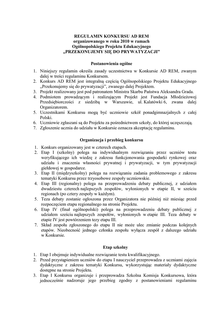 REGULAMIN KONKURSU AD REM organizowanego w roku 2010 w ramach Ogólnopolskiego Projektu Edukacyjnego „PRZEKONUJEMY SIĘ DO PRYWATYZACJI” Postanowienia ogólne 1. Niniejszy regulamin określa zasady uczestnictwa w Konkursie AD REM, zwanym dalej w treści regulaminu Konkursem. 2. Konkurs AD REM jest integralną częścią Ogólnopolskiego Projektu Edukacyjnego „Przekonujemy się do prywatyzacji”, zwanego dalej Projektem. 3. Projekt realizowany jest pod patronatem Ministra Skarbu Państwa Aleksandra Grada. 4. Podmiotem prowadzącym i realizującym Projekt jest Fundacja Młodzieżowej Przedsiębiorczości z siedzibą w Warszawie, ul. Kalatówki 6, zwana dalej Organizatorem. 5. Uczestnikami Konkursu mogą być uczniowie szkół ponadgimnazjalnych z całej Polski. 6. Uczniowie zgłaszani są do Projektu za pośrednictwem szkoły, do której uczęszczają. 7. Zgłoszenie ucznia do udziału w Konkursie oznacza akceptację regulaminu. Organizacja i przebieg konkursu 1. Konkurs organizowany jest w czterech etapach. 2. Etap I (szkolny) polega na indywidualnym rozwiązaniu przez uczniów testu weryfikującego ich wiedzę z zakresu funkcjonowania gospodarki rynkowej oraz udziału i znaczenia własności prywatnej i prywatyzacji, w tym prywatyzacji giełdowej w gospodarce. 3. Etap II (międzyszkolny) polega na rozwiązaniu zadania problemowego z zakresu tematyki Konkursu przez trzyosobowe zespoły uczniowskie. 4. Etap III (regionalny) polega na przeprowadzeniu debaty publicznej, z udziałem dwudziestu czterech najlepszych zespołów, wyłonionych w etapie II, w sześciu regionach (po cztery zespoły w każdym). 5. Teza debaty zostanie ogłoszona przez Organizatora nie później niż miesiąc przed rozpoczęciem etapu regionalnego na stronie Projektu. 6. Etap IV (finał ogólnopolski) polega na przeprowadzeniu debaty publicznej z udziałem sześciu najlepszych zespołów, wyłonionych w etapie III. Teza debaty w etapie IV jest powtórzeniem tezy etapu III. 7. Skład zespołu zgłoszonego do etapu II nie może ulec zmianie podczas kolejnych etapów. Nieobecność jednego członka zespołu wyłącza zespół z dalszego udziału w Konkursie. Etap szkolny 1. Etap I obejmuje indywidualne rozwiązanie testu kwalifikacyjnego. 2. Przed przystąpieniem uczniów do etapu I nauczyciel przeprowadza z uczniami zajęcia dydaktyczne z zakresu tematyki Konkursu, wykorzystując materiały dydaktyczne dostępne na stronie Projektu. 3. Etap I Konkursu organizuje i przeprowadza Szkolna Komisja Konkursowa, która jednocześnie nadzoruje jego przebieg zgodny z postanowieniami regulaminu Konkursu oraz dokonuje oceny odpowiedzi, według otrzymanego i zatwierdzonego przez Organizatora klucza odpowiedzi na zadania testu. 4. Rozwiązywanie testu kwalifikacyjnego odbywa się w szkole, w warunkach kontrolowanej samodzielności, pod nadzorem Szkolnej Komisji Konkursowej. 5. Test kwalifikacyjny składa się z dwudziestu zadań zamkniętych, za każdą prawidłową odpowiedź uczeń otrzymuje 1 punkt. 6. Do etapu II Konkursu zostają zakwalifikowane trzyosobowe zespoły uczniów danej szkoły. Każdy z członków zespołu musi spełniać kryterium punktowe kwalifikacji, tzn. w teście kwalifikacyjnym uzyskać wynik minimum 14 punktów. 7. Dobór członków zespołu spośród uczniów spełniających kryterium punktowe jest dowolny. 8. Liczba zespołów zgłaszanych przez szkoły do etapu II Konkursu nie jest ograniczona. 9. Szkolna Komisja Konkursowa jest uprawniona do zorganizowania dogrywki dla tych uczestników, którzy w etapie I uzyskali mniej niż 14 punktów, ale nie mniej niż 12, i wyłonienie w tym trybie brakującego członka zespołu (o zakwalifikowaniu zespołów uczniowskich do etapu II Konkursu decyduje Szkolna Komisja Konkursowa). 10. Każda ze szkół, której uczniowie uczestniczą w teście kwalifikacyjnym, otrzymuje login i hasło, które umożliwią zgłoszenie zespołów do etapu II Konkursu. 11. Informację o zespołach zakwalifikowanych do etapu II Konkursu Szkolna Komisja Konkursowa przekazuje Organizatorowi Konkursu w terminie wskazanym w terminarzu Konkursu (załącznik 1) za pośrednictwem informatycznego systemu rejestracji zespołów i ich prac. Etap międzyszkolny 1. Etap II obejmuje zespołowe rozwiązanie zadania problemowego dotyczącego tematyki Konkursu. 2. W etapie II Konkursu uczestniczą trzyosobowe zespoły uczniowskie zgłoszone przez Szkolne Komisje Konkursowe. 3. Przed przystąpieniem uczniów do etapu II nauczyciel może przeprowadzić z uczniami zajęcia dydaktyczne z zakresu tematyki Konkursu, wykorzystując materiały dydaktyczne dostępne na stronie Projektu. 4. Zadanie etapu II zostanie ogłoszone na stronie internetowej Projektu. 5. Zespoły uczniowskie przesyłają rozwiązanie zadania za pośrednictwem informatycznego systemu rejestracji zespołów i ich prac w czasie 24 godzin od jego ogłoszenia. Szczegółowe informacje techniczne dotyczące przekazywania odpowiedzi zostaną umieszczone na stronie konkursowej Projektu w dniu zakończenia etapu szkolnego Konkursu. 6. Brak rozwiązania w czasie oznacza rezygnację uczniów z udziału w Konkursie. 7. Prace uczniów są oceniane przez zespół ekspertów powołany przez Organizatora. 8. Prace, w których zespół ekspertów stwierdzi naruszenie praw autorskich (np. kopiowanie prac zaczerpniętych z Internetu) nie będą ocenione, a zespoły zostaną zdyskwalifikowane. Informacja o dyskwalifikacji zostanie przesłana do Szkolnej Komisji Konkursowej. 9. Do etapu III zostaną zakwalifikowane dwadzieścia cztery najlepsze zespoły uczniowskie. Wyniki etapu międzyszkolnego zostaną ogłoszone na stronie internetowej Projektu. Etap regionalny 1. Etap III obejmuje debaty zespołów organizowane w sześciu regionach. 2. W każdym regionie konkurują ze sobą cztery zespoły wyłonione w etapie II. 3. Podczas etapu III odbywają się dwie rundy debat, każda z nich polega na przeprowadzeniu debaty szkolnej nad podaną tezą. Stronę 