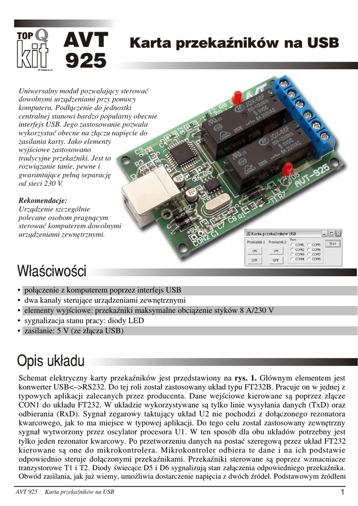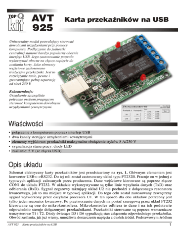 AVT 925 Karta przekaŸników na USB Uniwersalny modu³ pozwalaj¹cy sterowaæ dowolnymi urz¹dzeniami przy pomocy komputera. Pod³¹czenie do jednostki centralnej stanowi bardzo popularny obecnie interfejs USB. Jego zastosowanie pozwala wykorzystaæ obecne na z³¹czu napiêcie do zasilania karty. Jako elementy wyjœciowe zastosowano tradycyjne przekaŸniki. Jest to rozwi¹zanie tanie, pewne i gwarantuj¹ce pe³n¹ separacjê od sieci 230 V. Rekomendacje: Urz¹dzenie szczególnie polecane osobom pragn¹cym sterowaæ komputerem dowolnymi urz¹dzeniami zewnêtrznymi. W³aœciwoœci • • • • • po³¹czenie z komputerem poprzez interfejs USB dwa kana³y steruj¹ce urz¹dzeniami zewnêtrznymi elementy wyjœciowe: przekaŸniki maksymalne obci¹¿enie styków 8 A/230 V sygnalizacja stanu pracy: diody LED zasilanie: 5 V (ze z³¹cza USB) Opis uk³adu Schemat elektryczny karty przekaŸników jest przedstawiony na rys. 1. G³ównym elementem jest konwerter USB<–>RS232. Do tej roli zosta³ zastosowany uk³ad typu FT232B. Pracuje on w jednej z typowych aplikacji zalecanych przez producenta. Dane wejœciowe kierowane s¹ poprzez z³¹cze CON1 do uk³adu FT232. W uk³adzie wykorzystywane s¹ tylko linie wysy³ania danych (TxD) oraz odbierania (RxD). Sygna³ zegarowy taktuj¹cy uk³ad U2 nie pochodzi z do³¹czonego rezonatora kwarcowego, jak to ma miejsce w typowej aplikacji. Do tego celu zosta³ zastosowany zewnêtrzny sygna³ wytworzony przez oscylator procesora U1. W ten sposób dla obu uk³adów potrzebny jest tylko jeden rezonator kwarcowy. Po przetworzeniu danych na postaæ szeregow¹ przez uk³ad FT232 kierowane s¹ one do mikrokontrolera. Mikrokontroler odbiera te dane i na ich podstawie odpowiednio steruje do³¹czonymi przekaŸnikami. PrzekaŸniki sterowane s¹ poprzez wzmacniacze tranzystorowe T1 i T2. Diody œwiec¹ce D5 i D6 sygnalizuj¹ stan za³¹czenia odpowiedniego przekaŸnika. Obwód zasilania, jak ju¿ wiemy, umo¿liwia dostarczenie napiêcia z dwóch Ÿróde³. Podstawowym Ÿród³em AVT 925 Karta przekaŸników na USB 1 jest napiêcie dostêpne na z³¹czu USB, które bezpoœrednio zasila uk³ad FT232, a pozosta³e elementy uk³adu poprzez diodê D2. Napiêcie na tym z³¹czu najczêœciej jest dostêpne tylko w czasie pracy komputera. W tej sytuacji ka¿de wy³¹czenie komputera spowoduje tak¿e wy³¹czenie przekaŸników, a do³¹czone do ich styków obwody mog³yby byæ zamkniête tylko w czasie pracy komputera. Aby utrzymaæ ustawiony stan styków przekaŸników niezale¿nie od pracy komputera, do z³¹cza CON2 mo¿na do³¹czyæ dodatkowe Ÿród³o zasilania o wartoœci 5 V, które bêdzie zasila³o mikrokontroler i cewki przekaŸników w przypadku braku zasilania z portu USB. W ten sposób sterowane przez przekaŸniki urz¹dzenia pozostan¹ w ustawionym stanie tak¿e po wy³¹czeniu komputera. +5V C5 10µ C4 100n U2 FT232B 5 C3 33n 1 2 3 4 5 6 7 8 9 10 11 12 13 14 15 16 R5 1k5 CON1 Vbus DD+ GND 1 2 3 4 R3 27 R4 27 VCC 6 D2 1N5817 D1 CON2 +5V _ 1 2 1N5817 C1 100n EESK EEDATA VCC1 RESET RSTOUT 3V3OUT USBDP USBDM GND1 SLEEP RXLED TXLED VCCIO PWRCTL PWREN TXDEN EECS TEST AVCC AGND XTOUT XTIN VCC3 TXD RXD RTS CTS DTR DSR DCD RI GND2 R6 470 32 31 30 29 28 27 26 25 24 23 22 21 20 19 18 17 C6 100n FT_TXD FT_RXD VCC C2 10µ VCC R1 4k7 U1 PIC12F675 T1 BC846 VCC 1 VDD C9 100n 8 VSS GP0/AN0/CIN+/ICSPDAT GP1/AN1/CIN-/VREF/ICSPCLK GP2/AN2/T0CKI/INT/COUT GP3/MCLR/VPP GP4/AN3/T1G/OSC2/CLKOUT GP5/T1CKI/OSC1/CLKIN 7 6 5 4 3 2 D5 R7 330 CON3 ARK3 D3 1N4007 FT_RXD FT_TXD 1 2 3 P1 RM96P-5 VCC R2 4k7 X C7 33p C8 33p T2 BC846 D6 R8 330 CON4 ARK3 D4 1N4007 1 2 3 P2 RM96P-5 Rys. 1 Schemat elektryczny Monta¿ i uruchomienie Karta przekaŸników zosta³a zmontowana na p³ytce przedstawionej na rys. 2. Poniewa¿ znaczna czêœæ elementów jest wykonana w technologii SMD przy ich monta¿u nale¿y zachowaæ szczególn¹ ostro¿noœæ i precyzjê. W pierwszej kolejnoœci nale¿y wlutowaæ uk³ad FT232, a nastêpnie mikrokontroler. W dalszej kolejnoœci nale¿y montowaæ rezystory, kondensatory i tranzystory. Po wlutowaniu elementów SMD mo¿na przejœæ do montowania elementów przewlekanych rozpoczynaj¹c 2 AVT 925 Karta przekaŸników na USB od diod D1...D4, a koñcz¹c na przekaŸnikach i z³¹czach. Wysokoœæ monta¿u diod œwiec¹cych nale¿y dopasowaæ do wysokoœci ewentualnej obudowy. Jeœli uk³ad ma pracowaæ tak¿e przy wy³¹czonym komputerze, to do z³¹cza CON2 nale¿y doprowadziæ napiêcie stabilizowane o wartoœci 5 V i wydajnoœci pr¹dowej minimum 100 mA. Obwody, które maj¹ za³¹czaæ lub roz³¹czaæ przekaŸniki nale¿y do³¹czyæ odpowiednio: dla przekaŸnika P1 do z³¹cza CON3, dla przekaŸnika P2 do z³¹cza CON4. PrzekaŸniki posiadaj¹ styki prze³¹czne, dlatego w zale¿noœci od potrzeb w stanie spoczynku przekaŸnika obwód mo¿e byæ roz³¹czony lub za³¹czony. Rys. 2 Rozmieszczenie elementów na p³ytce drukowanej Instalacja i obs³uga Poniewa¿ komunikacja karty z komputerem odbywa siê przez z³¹cze USB do pracy konieczne jest zainstalowanie sterowników dla uk³adu FT232. Dostêpne s¹ one na stronie producenta uk³adu http://www.ftdichip.com/Drivers/VCP/Win2000/R2176.zip. Po pod³¹czeniu karty przekaŸników do komputera kablem USB zostanie wykryte nowe urz¹dzenie i nale¿y wówczas wskazaæ odnoœnik do sterowników. Utworzony zostanie wirtualny port COM, przez który mo¿na komunikowaæ siê z kart¹ u¿ywaj¹c dowolnej aplikacji obs³uguj¹cej transmisjê danych przez port szeregowy. Komunikacja odbywa siê w trybie znakowym, dlatego do sterowania mo¿na zastosowaæ program HyperTerminal, który znajduje siê w systemie Windows. Prêdkoœæ jest ustalona na 9600 b/s, bez bitu parzystoœci, z jednym bitem stopu (9600 8–N–1). Oprogramowanie zawarte w mikrokontrolerze umo¿liwia zapis, a tak¿e odczyt stanu danego przekaŸnika. W tab. 1 przedstawiono zestaw znaków steruj¹cych kart¹ zapisanych w kodzie ASCII, a tak¿e realizowane funkcje. W