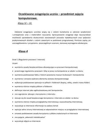 Oczekiwane osiągnięcia ucznia – przedmiot zajęcia komputerowe. Klasy IV – VI. Założone osiągnięcia uczniów wiążą się z celami kształcenia w zakresie wiadomości i umiejętności oraz z materiałem nauczania. Sprecyzowanie osiągnięć daje nauczycielowi możliwość sprawdzenia skuteczności stosowanych procedur dydaktycznych oraz spójności podejmowanych działań z celami zawartymi w podstawie programowej. Poniższe zapisy, po uszczegółowieniu i przypisaniu poszczególnym ocenom, stanowią wymagania edukacyjne. Klasa 4 Dział 1 (Regulamin pracowni i internet) Uczeń: wymienia zasady bezpieczeństwa obowiązujące w pracowni komputerowej przestrzega regulaminu pracowni i bhp w pracy na komputerze w szkole i w domu wymienia podstawowe fakty z historii powstania maszyn liczbowych i komputerów wymienia i omawia wybrane elementy zestawu komputerowego wykonuje podstawowe operacje na plikach i folderach (kopiuj, wklej, utwórz nowy folder) wymienia różnice między plikiem a folderem definiuje internet jako ogólnoświatową sieć komputerów zna zagrożenia płynące z korzystania z internetu stosuje się do zasad bezpiecznego korzystania z internetu w szkole i w domu wymienia różnice między przeglądarką internetową a wyszukiwarką internetową wyszukuje w internecie informacje na zadany temat wpisuje adres strony internetowej w odpowiednim miejscu w przeglądarce internetowej omawia podstawowe zasady korzystania z plików znalezionych w internecie zna pojęcie „własność intelektualna” wyszukuje zdjęcia w internecie korzysta z tłumacza Google tworzy notatkę o zespole muzycznym z wykorzystaniem plików znalezionych w internecie Dział 2 (Paint 6.1.) Uczeń: korzysta z podstawowych narzędzi programu Paint tworzy rysunki w programie Paint tworzy rysunek w programie Paint, korzystając z opcji zaznaczania oraz obracania zaznaczonego obszaru wykorzystuje w programie Paint narzędzie Linia krzywa do narysowania sylwetek statku widocznego z przodu oraz z boku pracuje na kilku oknach programu Paint w programie Paint korzysta z narzędzia Tekst, zmienia czcionkę oraz wielkość liter dodaje cień do napisanego tekstu w programie Paint współpracuje z grupą przy tworzeniu pracy plastycznej w programie Paint Dział 3 (Internet) Uczeń: zna i stosuje zasady bezpiecznego korzystania z poczty elektronicznej zna zasady zapisu adresu mailowego korzysta z poczty elektronicznej, dodaje kontakty, przesyła listy, dodaje załączniki stosuje zasady netykiety podczas korzystania z poczty świadomie i bezpiecznie korzysta z wiadomości błyskawicznych (czat) korzysta z kalendarza internetowego importuje kalendarz klasowy współtworzy dokumenty w aplikacji SkyDrive Klasa 5 Dział 4 (MS Word) Uczeń: korzysta z podstawowych skrótów klawiszowych w edytorze tekstu Word zna i stosuje podstawowe zasady formatowania tekstu tworzy notatkę, stosując podstawowe formatowanie tekstu, m.in. pogrubienie, pochylenie korzysta z opcji Pokaż wszystko, aby sprawdzić poprawność przeprowadzonego formatowania wstawia i formatuje obiekty WordArt stosuje listy punktowe, listy numerowane, listy wielopoziomowe wstawia tabelę i tworzy w niej plan lekcji wstawia do dokumentu obrazy i je formatuje wstawia do dokumentu Kształty i je formatuje korzystając z programu Word, przygotowuje w zespole album przyrodniczy Dział 5 (MS PowerPoint) Uczeń: tworzy prezentacje w programie PowerPoint tworzy album fotograficzny w programie PowerPoint używa efektów przejść między slajdami w PowerPoint używa różnych opcji animacji w prezentacji w programie PowerPoint osadza w prezentacji w programie PowerPoint obiekty Clipart, pliki audio oraz pliki wideo modyfikuje wstawione do prezentacji pliki audio i wiedeo Dział 6. (Movie Maker) Uczeń: zna zastosowanie programu Movie Maker importuje filmy do programu Movie Maker dokonuje montażu zaimportowanego materiału filmowego dodaje efekty przejść oraz filtry w projekcie w programie Movie Maker dodaje materiał muzyczny do filmu w projekcie w programie Movie Maker usuwa niepotrzebne fragmenty z filmu w projekcie w programie Movie Maker eksportuje projekt w programie Movie Maker do formatu pliku wideo Dział 7 (Pivot) Uczeń: tworzy animację „kroczącej postaci” w programie Pivot dodaje własne tło do animacji samodzielnie tworzy postać w programie Pivot i dodaje ją do animacji w zespole współtworzy animację o wędrówce „patyczaków” po labiryncie Klasa 6 Dział 8 (Excel) Uczeń: wyjaśnia pojęcia „arkusz kalkulacyjny”, „komórka”, „arkusz” potrafi wskazać komórkę w skoroszycie według jej adresu formatuje komórki w arkuszu kalkulacyjnym sortuje dane w tabeli odróżnia funkcję od formuły wpisuje i prawidłowo używa funkcji SUMA tworzy arkusz, w którym może obliczyć swój budżet przedstawia dane liczbowe za pomocą dobranego odpowiednio wykresu formatuje wykres Dział 9 (Baltie) Uczeń: zna interfejs programu Baltie korzysta z Banku przedmiotów zapisuje scenę, program, zmodyfikowany Bank przedmiotów rysuje scenę, korzystając z Banku przedmiotów tworzy program w Trybie Programowania: Nowicjusz zna pojęcie „pętla” stosuje elementy poprawiające czytelność kodu (nowe linie, komentarze) pisze program zmieniający postać Baltiego wstawia scenę do programu zmienia tempo poruszania się postaci rozumie pojęcie „instrukcja warunkowa” i potrafi ją zastosować w praktyce tworzy własną grę z wykorzystaniem sterowania z klawiatury Dział 10 (Audacity) Uczeń: obsługuje podstawowe narzędzia Audacity importuje dźwięk, usuwa niepotrzebne fragmenty nagrania używając skonfigurowanego komputera, nagrywa głos, odsłuchuje nagranie i „czyści” je z niepotrzebnych fragmentów łączy nagranie lektora z plikiem muzycznym eksperymentuje z efektami specjalnymi w nagraniu współtworzy program radiowy Dział 11 (GIMP) Uczeń: wyjaśnia pojęcie „warstwy” zna podstawowe narzędzia programu GIMP kor
