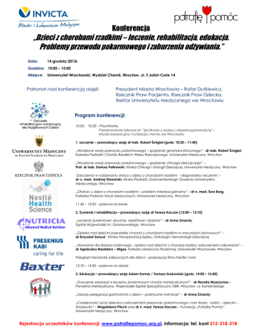 Konferencja „Dzieci z chorobami rzadkimi – leczenie, rehabilitacja, edukacja. Problemy przewodu pokarmowego i zaburzenia odżywiania.” Data: 14 grudnia 2013r. Godzina: 10:00 – 15:00 Miejsce: Uniwersytet Wrocławski, Wydział Chemii, Wrocław, ul. F.Joliot-Curie 14 Patronat nad konferencją objęli: Prezydent Miasta Wrocławia – Rafał Dutkiewicz, Rzecznik Praw Pacjenta, Rzecznik Praw Dziecka, Rektor Uniwersytetu Medycznego we Wrocławiu Program konferencji: 10.00 - 10.20 – Przywitanie. Przedstawienie lalkowe pt. "Spotkanie z osobą z niepełnosprawnością" – etiuda edukacyjna. Fundacja L'Arche we Wrocławiu 1. Leczenie – prowadzący sesję dr hab. Robert Śmigiel (godz. 10:20 – 11:40) „Wrodzone wady przewodu pokarmowego – spojrzenie genetyka klinicznego” - dr hab. Robert Śmigiel, Katedra Pediatrii i Chorób Rzadkich Wieku Rozwojowego, Uniwersytet Medyczny, Wrocław „Wrodzone wady przewodu pokarmowego – spojrzenie chirurga dziecięcego” – Prof. dr hab. Dariusz Patkowski, Klinika Chirurgii i Urologii Dziecięcej, Uniwersytet Medyczny, Wrocław "Zaburzenia w oddawaniu stolca u dzieci z chorobami rzadkimi - diagnostyka i leczenie" – dr n. med. Andrzej Stawarski, Klinika Pediatrii, Gastroenterologii i Żywienia Uniwersytetu Medycznego, Wrocław „Otyłość u dzieci z chorobami rzadkimi – problem interdyscyplinarny” – dr n. med. Ewa Barg, Katedra Podstaw Nauk Medycznych, Uniwersytet Medyczny, Wrocław 11.40 – 12.00 – przerwa na kawę 2. Żywienie i rehabilitacja – prowadzący sesję dr Teresa Kaczan (12:00 – 13:10) „Leczenie żywieniowe: doustne, dojelitowe i dożylne” – dr Anna Zmarzły, Szpital Wojewódzki im. Gromkowskiego, Wrocław „Opieka nad dziećmi przewlekle chorymi z chorobami rzadkimi w warunkach domowych” – dr Krzysztof Szmyd - Klinika Transplantacji Szpiku, Onkologii i Hematologii Dziecięcej „Wyzwanie dla lekarza rodzinnego - opieka nad dziećmi z chorobą rzadką i zaburzeniem odżywiania” – dr Agnieszka Mastalerz – Migas, Katedra Medycyny Rodzinnej, Uniwersytet Wrocławski, Wrocław Przegląd mieszanek odżywczych dla dzieci – propozycja firmy Nestle i inne 13.10 – 14.00 – przerwa na obiad 3. Edukacja – prowadzący sesję Adam Komar / Tomasz Krakowiak (godz. 14:00 – 15.00) „Znaczenie edukacji w leczeniu żywieniowym chorób metabolicznych” - dr Renata Mozrzymas – Poradnia Metaboliczna, Wojewódzki Szpital Specjalistyczny OBR, Wrocław, ul. Kamieńskiego „Zasady pielęgnacji gastrostomii u dzieci – praktyczne instrukcje” – dr Anna Zmarzły „Codzienność życia dziecka z zaburzeniami przewodu pokarmowego i rola triady: rodzic – dziecko – terapeuta” – Magdalena Piluch oraz dr n. med. Teresa Kaczan – Fundacja „Potrafię Pomóc”, Uniwersytet Medyczny, Wrocław 14:40 Podsumowanie i zakończenie konferencji. Rejestracja uczestników konferencji: www.potrafiepomoc.org.pl, informacja: tel. kont 512-318-318