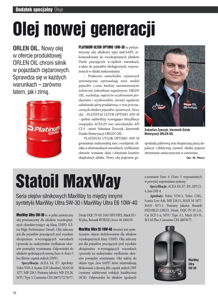 Dodatek specjalny Oleje Olej nowej generacji ORLEN OIL. Nowy olej w ofercie produktowej ORLEN OIL chroni silnik w pojazdach ciężarowych. Sprawdza się w każdych warunkach – zarówno latem, jak i zimą. PLATINUM ULTOR OPTIMO 10W-30 to półsyntetyczny olej silnikowy typu mid-SAPS, rekomendowany do wysokoprężnych silników Diesla pracujących w ciężkich warunkach, a także do pojazdów ekologicznych, wyposażonych w silniki niskoemisyjne. – Producenci samochodów ciężarowych systematycznie wprowadzają nowe modele pojazdów z coraz bardziej zaawansowanymi technicznie jednostkami napędowymi. ORLEN OIL, wychodząc naprzeciw oczekiwaniom producentów i użytkowników, również regularnie udoskonala ofertę produktową, w tym przeznaczoną do silników pojazdów ciężarowych. Nowy olej – PLATINUM ULTOR OPTIMO 10W-30 – spełnia najbardziej wymagające klasyfikacje europejskie ACEA:E9 oraz amerykańskie API CJ-4 – mówi Sebastian Żywczyk, kierownik Działu Motoryzacji ORLEN OIL. PLATINUM UTLOR OPTIMO 10W-30 gwarantuje maksymalną moc i wydajność silnika w ekstremalnych warunkach, wydłużenie okresów wymiany oleju i obniżenie kosztów eksploatacji silnika. Nowy olej poprawia go- Statoil MaxWay Seria olejów silnikowych MaxWay to między innymi syntetyki MaxWay Ultra 5W-30 i MaxWay Ultra E6 10W-40 MaxWay Ultra 5W-30 to w pełni syntetyczny olej przeznaczony dla silników wysokoprężnych charakteryzujący się klasą UHPD (Ultra High Performance Diesel). Olej zalecany jest dla pojazdów pracujących pod wysokim obciążeniem w wymagających warunkach i pozwala na maksymalne wydłużenie okresów pomiędzy wymianami. Odpowiedni do silników spełniających normę Euro 4 i Euro 5 bez filtrów cząstek stałych (DPF). Specyfikacja: ACEA E4, E7. Aprobaty: Volvo VDS-3, Scania LDF (obsolete), MAN M 3277, MB 228.5. Poziomy jakości: MB 235.28, MTU Type 3, Cummins CES 20071/72/76/77, 16 Deutz DQC IV-05, DAF HP1/HP2, Mack EOM plus, Renault RVIRXD, Iveco 18-1804 FE. MaxWay Ultra E6 10W-40 również jest syntetycznym olejem dedykowanym dla silników wysokoprężnych klasy UHPD. Olej zalecany jest dla pojazdów pracujących pod wysokim obciążeniem w wymagających warunkach i pozwala na maksymalne wydłużenie okresów pomiędzy wymianami. Olej należy do olejów typu „low SAPS”, które minimalizują blokowanie i chronią filtr cząstek stałych DPF i systemy selektywnej redukcji katalitycznej (SCR). Odpowiedni do silników zgodnych Sebastian Żywczyk, kierownik Działu Motoryzacji ORLEN OIL spodarkę paliwową oraz bezpieczną pracę dopalaczy i efektywną czystość silnika poprzez utrzymanie zanieczyszczeń w zawiesinie. Opr. M. Mazur z normami Euro 4 i Euro 5 wyposażonych w powyżej wspomniane systemy. Specyfikacje: ACEA E6, E7, E9, API CI4, Jaso DH-4. Aprobaty: Volvo VDS-3, Volvo CNG, Scania Low Ash, MB 228.51, MAN M 3477, MAN 3271-1. Poziomy jakości: Renault RXD/RLD-2/RGD, Deutz DQC-IV-10 LA, Cat ECF-1-a, MTU Type 3.1, Mack EO-N, EO-M Plus, Cummins CES 20076/77. MaxWay Ultra 5W-30
