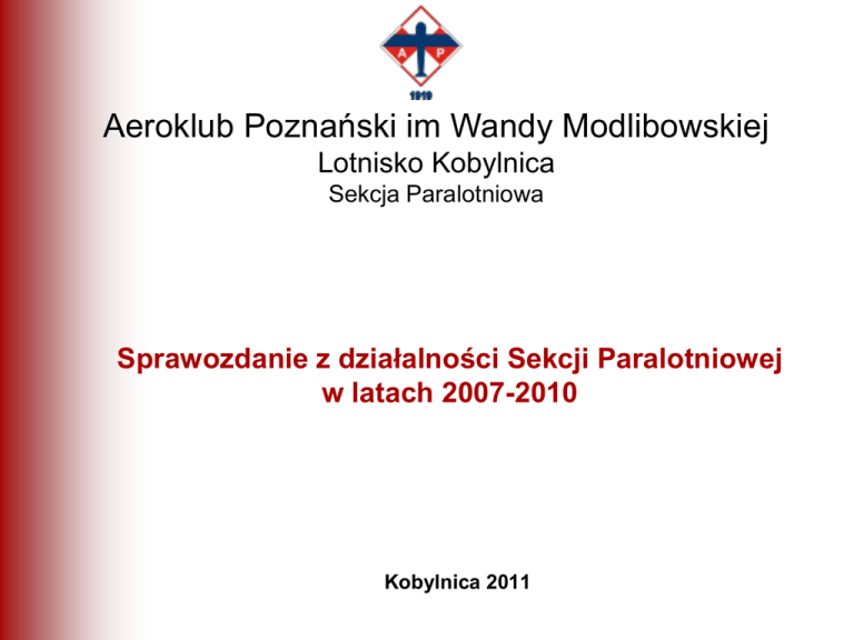 Aeroklub Poznański im Wandy Modlibowskiej Lotnisko Kobylnica Sekcja Paralotniowa Sprawozdanie z działalności Sekcji Paralotniowej w latach 2007-2010 Kobylnica 2011 Sekcja Paralotniowa Rada sekcji: Przewodniczący Marek Baumgart Zastępca Jan Borowicz Sekcja Paralotniowa W ramach sekcji prowadzone są przez Poznańską Szkołę Latania na Paralotniach szkolenia pilotów paralotniowych na następujące stopnie do świadectwa kwalifikacji: Latanie swobodne: I stopień – loty w zakresie podstawowym II stopień – loty wysokie z wykorzystaniem wyciągarki mechanicznej III stopień – loty termiczne i żaglowe Sekcja Paralotniowa W ramach sekcji prowadzone są przez Poznańską Szkołę Latania na Paralotniach szkolenia pilotów paralotniowych na następujące stopnie do świadectwa kwalifikacji: Latanie z napędem: Uprawnienia PPG (latanie z napędem plecakowym) Uprawnienia PPGG (motoparalotnie na podwoziu kołowym) oraz Operator wyciągarki Kierownik startu Sekcja Paralotniowa Sekcja Paralotniowa Członkowie sekcji oraz sympatycy w latach 2007-2010 w ramach treningów doskonalenia techniki i umiejętności latania odwiedzili następujące miejsca: Szczyrk, Czarna Góra, Karpacz, Trzęsacz, Bezmiechowa, Mieroszów, Semonzo –Grappa, Norma – Włochy Val Gardena, Pieve d"Alpago, Dolomity – Włochy Sant Hillar – Francja Sierra Nevada - Andaluzja, Hiszpania Stubai - Austria Lijak – Słowenia Makarska - Chorwacja Kozakov – Czechy Wyspa Madera Oludeniz - Turcja Sekcja Paralotniowa Sekcja Paralotniowa Szkolenia praktyczne i teoretyczne odbywają się głównie na lotniskach: Bednary, Kobylnica oraz Jeżów Sudecki. Zakup sprzętu do latania, wyciągarki, lin oraz wszystkie pozostałe wydatki członkowie pokrywają z własnych środków. Sekcja Paralotniowa Sekcja Paralotniowa Od 2009 roku piloci startują w międzynarodowych zawodach przelotowych XConetst, w 3 kategoriach: otwarta, start nożny, trajki Sekcja Paralotniowa