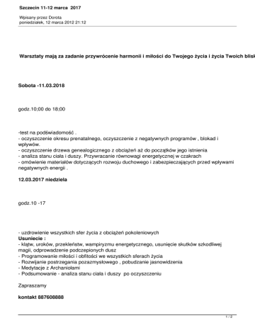 Szczecin 11-12 marca 2017 Wpisany przez Dorota poniedziałek, 12 marca 2012 21:12 Warsztaty mają za zadanie przywrócenie harmonii i miłości do Twojego życia i życia Twoich blisk Sobota -11.03.2018 godz.10;00 do 18;00 -test na podświadomość . - oczyszczenie okresu prenatalnego, oczyszczenie z negatywnych programów , blokad i wpływów. - oczyszczenie drzewa genealogicznego z obciążeń aż do początków jego istnienia - analiza stanu ciała i duszy. Przywracanie równowagi energetycznej w czakrach - omówienie materiałów dotyczących rozwoju duchowego i zabezpieczających przed wpływami negatywnych energii . 12.03.2017 niedziela godz.10 -17 - uzdrowienie wszystkich sfer życia z obciążeń pokoleniowych Usuniecie : - klątw, uroków, przekleństw, wampiryzmu energetycznego, usunięcie skutków szkodliwej magii, odprowadzenie podczepionych dusz - Programowanie miłości i obfitości we wszystkich sferach życia - Rozwijanie postrzegania pozazmysłowego , pobudzanie jasnowidzenia - Medytacje z Archaniołami - Podsumowanie - analiza stanu ciała i duszy po oczyszczeniu Zapraszamy kontakt 887608888 1/2 Szczecin 11-12 marca 2017 Wpisany przez Dorota poniedziałek, 12 marca 2012 21:12 Spotkania indywidualne 09-10 marca 2017 2/2