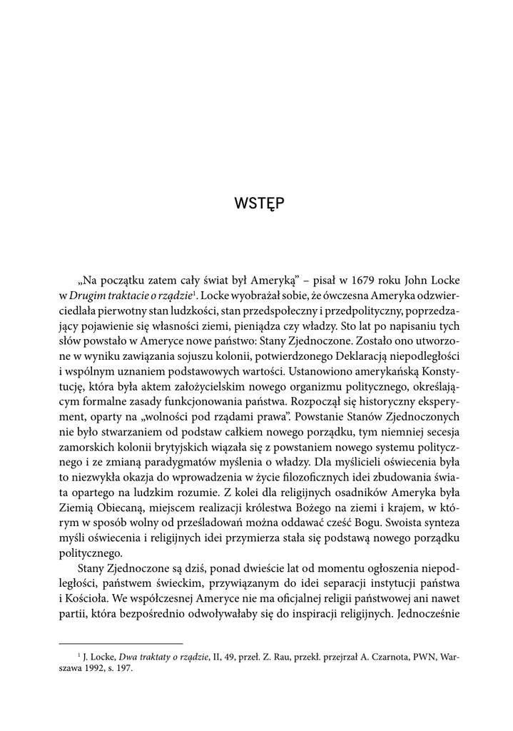 13 Wstęp WSTĘP „Na początku zatem cały świat był Ameryką” – pisał w 1679 roku John Locke w Drugim traktacie o rządzie1. Locke wyobrażał sobie, że ówczesna Ameryka odzwierciedlała pierwotny stan ludzkości, stan przedspołeczny i przedpolityczny, poprzedzający pojawienie się własności ziemi, pieniądza czy władzy. Sto lat po napisaniu tych słów powstało w Ameryce nowe państwo: Stany Zjednoczone. Zostało ono utworzone w wyniku zawiązania sojuszu kolonii, potwierdzonego Deklaracją niepodległości i wspólnym uznaniem podstawowych wartości. Ustanowiono amerykańską Konstytucję, która była aktem założycielskim nowego organizmu politycznego, określającym formalne zasady funkcjonowania państwa. Rozpoczął się historyczny eksperyment, oparty na „wolności pod rządami prawa”. Powstanie Stanów Zjednoczonych nie było stwarzaniem od podstaw całkiem nowego porządku, tym niemniej secesja zamorskich kolonii brytyjskich wiązała się z powstaniem nowego systemu politycznego i ze zmianą paradygmatów myślenia o władzy. Dla myślicieli oświecenia była to niezwykła okazja do wprowadzenia w życie filozoficznych idei zbudowania świata opartego na ludzkim rozumie. Z kolei dla religijnych osadników Ameryka była Ziemią Obiecaną, miejscem realizacji królestwa Bożego na ziemi i krajem, w którym w sposób wolny od prześladowań można oddawać cześć Bogu. Swoista synteza myśli oświecenia i religijnych idei przymierza stała się podstawą nowego porządku politycznego. Stany Zjednoczone są dziś, ponad dwieście lat od momentu ogłoszenia niepodległości, państwem świeckim, przywiązanym do idei separacji instytucji państwa i Kościoła. We współczesnej Ameryce nie ma oficjalnej religii państwowej ani nawet partii, która bezpośrednio odwoływałaby się do inspiracji religijnych. Jednocześnie 1 J. Locke, Dwa traktaty o rządzie, II, 49, przeł. Z. Rau, przekł. przejrzał A. Czarnota, PWN, Warszawa 1992, s. 197. 14 Nagie forum – Religia w amerykańskiej przestrzeni publicznej według Richarda Johna Neuhausa jednak na globalnej mapie religijności Amerykanie znajdują się w czołówce społeczeństw religijnych. Wiara w Boga jest silnie obecna w indywidualnym życiu ludzi i w przestrzeni publicznej. Amerykanie częściej niż inne zaawansowane gospodarczo społeczeństwa deklarują przynależność religijną oraz fakt, że religia jest w ich życiu ważna (55%); regularnie uczestniczą w nabożeństwach (44%) i przyznają, że wierzą w Boga (94%). Aż 58% Amerykanów deklaruje, że modli się codziennie, a duża część z nich jest przekonana, że Bóg odpowiada na ich modlitwy. Z badań wynika, że aż 49% Amerykanów twierdzi, iż Bóg w ostatnim czasie odpowiedział na ich prośby, a 19% doświadcza tego przynajmniej raz w tygodniu2. Ponadto religijność Amerykanów, na pozór głęboko indywidualistyczna, ma silnie publiczny wymiar. Widoczne jest to na przykład w czasie tak zwanych wielkich przebudzeń religijnych, w okresach mobilizacji moralnej oraz w działaniach licznych ruchów społecznych. Także podczas wyborów prezydenckich religia staje się widoczna i odgrywa ogromną rolę społeczną i polityczną. Charakterystyczną cechą amerykańskiej tradycji jest oddziaływanie na politykę na poziomie społeczeństwa obywatelskiego, między innymi poprzez ruchy społeczne. To właśnie za pośrednictwem samoorganizujących się ruchów społecznych przekonania moralne i religijne „transmitowane” są w przestrzeń polityczną. Jak zauważają amerykańscy socjologowie, kwestie religijne wpływają na zachowania wyborcze obywateli, a przez to na kształt amerykańskiej sceny politycznej, dwa razy silniej niż podziały klasowe czy status materialny3. Niektórzy badacze mówią o religijnej wyjątkowości Ameryki, ale podkreślają zarazem, że jest to wyjątkowość polegająca nie tyle na silnej religijności społeczeństwa, ile na specyficznej roli, jaką religia odgrywa w przestrzeni publicznej4. Silna obecność religii w amerykańskiej przestrzeni publicznej może być uznana za zjawisko przemijające, o historycznym jedynie znaczeniu. Znaczenie religii, jak twierdził Max Weber, zanika wraz z rozwojem państwa demokratycznego i gospodarki rynkowej, zaś Ameryka bądź jest w tej kwestii historycznie spóźniona, bądź też jest anomalią5. Z kolei Alexis de Tocqueville uważał, że religia odgrywa w amerykańskim projekcie politycznym rolę istotną, kluczową i świadomie przyjętą, a oddziałując na przestrzeń publiczną, zapewnia właściwą, przedpolityczną perspektywę 2 2007 U.S. Religious Landscape Survey, Pew Research Center, Washington, D.C. 2008; oraz: Religion in the Millenial Generation, Pew Forum, Washington, D.C. 2010; www.pewforum.org. 3 J. Manza, C. Brookes, A Great Divide? Religion and Political Change in U.S. National Elections, 1972–2000, „The Sociological Quarterly” 45 (2004), s. 421–450. 4 E.A. Tiryakian, American Religious Exceptionalism: A Reconcideration, „Annals of the American Academy of Political and Social Science”, vol. 527, May 1993, s. 40–54. 5 M. Weber, Asceza i duch kapitalizmu, w: M. Weber, Szkice z socjologii religii, przeł. J. Prokopiuk, H. Wandowski, Książka i Wiedza, Warszawa 1984, s. 104. Wstęp 15 aksjologiczną. Próby usuwania religii z przestrzeni publicznej Ameryki powodują kryzys całego systemu demokracji6. W związku z powyższym pojawiają się pytania o miejsce religii w amerykańskim projekcie politycznym. Pytania o to, czy w ramach tego projektu religia pełni funkcję elementu ważnego jedynie przy budowaniu jedności i tożsamości narodowej w okresie powstawania państwa, i czy w konsekwencji funkcja ta zanika wraz z rozwojem państwa oraz umacnianiem się systemu demokratycznego i gospodarki. A może jest dokładnie odwrotnie: może religia odgrywa w amerykańskim projekcie politycznym rolę istotną i świadomie przyjętą, a j