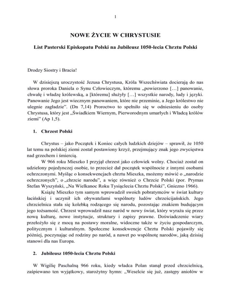 1 NOWE ŻYCIE W CHRYSTUSIE List Pasterski Episkopatu Polski na Jubileusz 1050-lecia Chrztu Polski Drodzy Siostry i Bracia! W dzisiejszą uroczystość Jezusa Chrystusa, Króla Wszechświata docierają do nas słowa proroka Daniela o Synu Człowieczym, któremu „powierzono […] panowanie, chwałę i władzę królewską, a [któremu] służyły […] wszystkie narody, ludy i języki. Panowanie Jego jest wiecznym panowaniem, które nie przeminie, a Jego królestwo nie ulegnie zagładzie”. (Dn 7,14) Proroctwo to spełniło się w odniesieniu do osoby Chrystusa, który jest „Świadkiem Wiernym, Pierworodnym umarłych i Władcą królów ziemi” (Ap 1,5). 1. Chrzest Polski Chrystus – jako Początek i Koniec całych ludzkich dziejów – sprawił, że 1050 lat temu na polskiej ziemi został postawiony krzyż, przejmujący znak jego zwycięstwa nad grzechem i śmiercią. W 966 roku Mieszko I przyjął chrzest jako człowiek wolny. Chociaż został on udzielony pojedynczej osobie, to przecież dał początek wspólnocie z innymi osobami ochrzczonymi. Myśląc o konsekwencjach chrztu Mieszka, możemy mówić o „narodzie ochrzczonych”, o „chrzcie narodu”, a więc również o Chrzcie Polski (por. Prymas Stefan Wyszyński, „Na Wielkanoc Roku Tysiąclecia Chrztu Polski”, Gniezno 1966). Książę Mieszko tym samym wprowadził swoich pobratymców w świat kultury łacińskiej i uczynił ich obywatelami wspólnoty ludów chrześcijańskich. Jego chrzcielnica stała się kolebką rodzącego się narodu, pozostając znakiem budującym jego tożsamość. Chrzest wprowadził nasz naród w nowy świat, który wyraża się przez nową kulturę, nowe instytucje, struktury i zapisy prawne. Doświadczenie wiary przełożyło się z mocą na postawy moralne, widoczne także w życiu gospodarczym, politycznym i kulturalnym. Społeczne konsekwencje Chrztu Polski pojawiły się później, poczynając od rodziny po naród, a nawet po wspólnotę narodów, jaką dzisiaj stanowi dla nas Europa. 2. Jubileusz 1050-lecia Chrztu Polski W Wigilię Paschalną 966 roku, kiedy władca Polan stanął przed chrzcielnicą, zaśpiewano ten wyjątkowy, starożytny hymn: „Weselcie się już, zastępy aniołów w niebie, weselcie się, słudzy Boga. Niechaj zabrzmią dzwony głoszące zbawienie, gdy Król tak wielki odnosi zwycięstwo. Raduj się ziemio, opromieniona tak niezmiernym blaskiem […], poczuj, że wolna jesteś od mroku, co świat okrywa!” („Exultet”). I odtąd – każdego roku w Wigilię Paschalną – Kościół w Polsce śpiewa ten hymn tuż przed odnowieniem przyrzeczeń chrzcielnych; przepiękny hymn, przepełniony radością z dzieła zbawienia, skupiony na Chrystusie, który wyzwala nas ku miłości do Boga i ludzi. W chwili chrztu świętego każdej i każdego z nas to zbawcze wydarzenie staje się przełomowym momentem naszej osobistej duchowej biografii. Chrzest święty jest fundamentem całego życia chrześcijańskiego i bramą do życia w Trójcy Świętej. Jest to nie tylko zanurzenie w poświęconej wodzie, ale prawdziwe zanurzenie w śmierci i zmartwychwstaniu Pana, w Jego zwycięstwie nad złem. To prawdziwe źródło życia wiecznego dla nas. Pełne wiary spojrzenie na to przełomowe w dziejach naszego narodu wydarzenie sprawia, że przeżycie Jubileuszu 1050-lecia Chrztu Polski nie ogranicza się do rozważania zagadnień o charakterze społecznym, kulturowym czy narodowym. Są to z pewnością kwestie ważne, ale to przecież nie te pytania usłyszał Mieszko I, gdy stanął przy chrzcielnicy. Najpierw zapytano go o to, czy wyrzeka się szatana i jego próżnej chwały. Następnie, czy wierzy w Boga Ojca Wszechmogącego, w Jego Jedynego Syna – Jezusa Chrystusa, wcielonego, ukrzyżowanego i zmartwychwstałego, w Ducha Świętego, w święty, katolicki i apostolski Kościół, w społeczność świętych i w zmartwychwstanie ciała. Na wszystkie te pytania Mieszko odpowiedział: „Wierzę!”. To samo wyznanie wiary powtarzamy i my 1050 lat później. 3. Millennium Chrztu Polski Obchodzić Jubileusz Chrztu Polski to świadczyć własnym życiem o Chrystusie. Takie odważne świadectwo w niełatwych czasach PRL-u złożyli katolicy w 1966 roku, w czasie obchodów milenijnych. Pomogła w tym dziewięcioletnia Wielka Nowenna, czyli program duszpasterski opracowany przez Sługę Bożego Księdza Kardynała Stefana Wyszyńskiego. Jej główne hasło rozbrzmiewa po dziś dzień w naszych uszach: „Wierność Bogu, Krzyżowi, Ewangelii, Kościołowi i jego Pasterzom”. Ogromna praca duchowa, towarzysząca Millennium Chrztu, zakończyła się uroczystościami na Jasnej Górze 3 maja 1966 roku. W tym dniu zawierzono Matce Bożej nasz naród na kolejne 1000 lat. Bez tamtego Millennium trudno sobie wyobrazić następne ćwierć wieku polskiej historii: pontyfikat św. Jana Pawła II, wielki ruch „Solidarność” oraz odzyskaną w 1989 roku wolność. Po pięćdziesięciu latach pasterze Kościoła wraz ze zgromadzonymi wiernymi ponowią ten akt na Jasnej Górze 3 maja 2016 roku, zawierzając Polaków w Ojczyźnie i poza jej granicami naszej duchowej Matce i Królowej. 4. Wyzwanie ekumeniczne Chrzest jest wydarzeniem, którego nie da się zamknąć tylko w kontekście Kocioła katolickiego. Św. Paweł pisze, że „[…] w jednym Duchu wszyscy zostaliśmy ochrzczeni w jedno Ciało” (por. 1Kor 12,13), tworząc jeden, święty, powszechny i apostolski Kościół. Dlatego chrzest czyni chrześcijan, niezależnie od istniejących między nimi podziałów, członkami jednego Ciała Chrystusowego. Tworzy jedność, która nie sprowadza się wyłącznie do obojętnej tolerancji i wzajemnej wiedzy o sobie, lecz spełnia się w wymianie duchowych darów. Dziękujemy Bogu za przyjętą na początku 2000 r. przez Kościół Katolicki i Kościoły zrzeszone w Polskiej Radzie Ekumenicznej „Deklarację o wzajemnym uznaniu chrztu jako sakramentu jedności”. Jest ona bezprecedensowa w
