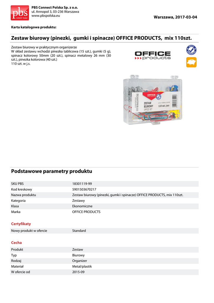 PBS Connect Polska Sp. z o.o. ul. Annopol 3, 03-236 Warszawa www.pbspolska.eu Warszawa, 2017-03-04 Karta katalogowa produktu: Zestaw biurowy (pinezki, gumki i spinacze) OFFICE PRODUCTS, mix 110szt. Zestaw biurowy w praktycznym organizerze W skład zestawu wchodzi pinezka tablicowa (15 szt.), gumki (5 g), spinacz kolorowy 50mm (20 szt.), spinacz metalowy 26 mm (30 szt.), pinezka kolorowa (40 szt.) 110 szt. w j.s. Podstawowe parametry produktu SKU PBS 18301119-99 Kod kreskowy 5901503670217 Nazwa produktu Zestaw biurowy (pinezki, gumki i spinacze) OFFICE PRODUCTS, mix 110szt. Kategoria Zestawy Klasa Ekonomiczne Marka OFFICE PRODUCTS Certyfikaty Nowy produkt w ofercie Standard Cecha Produkt Zestaw Typ Biurowy Rodzaj Organizer Materiał Metal/plastik W ofercie od 2015-09 PBS Connect Polska Sp. z o.o. ul. Annopol 3, 03-236 Warszawa www.pbspolska.eu Warszawa, 2017-03-04 Karta katalogowa produktu cd. Zestaw biurowy (pinezki, gumki i spinacze) OFFICE PRODUCTS, mix 110szt. Podstawowe parametry produktu Wspólny słownik zamówień CPV 30197100-7 Zszywki, gwoździki z szerokim łebkiem, pinezki kreślarskie Jednostki logistyczne Opakowanie 1 5 op Opakowanie 2 160 op Opakowanie 3 3200 op