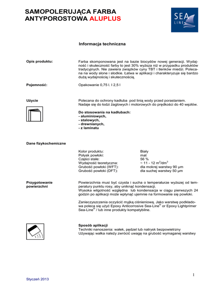 SAMOPOLERUJĄCA FARBA ANTYPOROSTOWA ALUPLUS Informacja techniczna Opis produktu: Farba skomponowana jest na bazie biocydów nowej generacji. Wydajność i skuteczność farby to jest 30% wyŜsza niŜ w przypadku produktów tradycyjnych. Nie zawiera związków cyny TBT i tlenków miedzi. Polecana na wody słone i słodkie. Łatwa w aplikacji i charakteryzuje się bardzo duŜą wydajnością i skutecznością. Pojemność: Opakowanie 0,75 l. I 2,5 l UŜycie Polecana do ochrony kadłuba pod linią wody przed porastaniem. Nadaje się do łodzi Ŝaglowych i motorowych do prędkości do 40 węzłów. Do stosowania na kadłubach: - aluminiowych, - stalowych, - drewnianych, - z laminatu Dane fizykochemiczne Kolor produktu: Połysk powłoki: Części stałe: Wydajność teoretyczna: Grubość powłoki (WFT): Grubość powłoki (DFT): Przygotowanie powierzchni Biały mat 56 % 2 3 ~ 11 - 12 m /dm dla mokrej warstwy 90 µm dla suchej warstwy 50 µm Powierzchnia musi być czysta i sucha o temperaturze wyŜszej od temperatury punktu rosy, aby uniknąć kondensacji. Wysoka wilgotność względna lub kondensacja w ciągu pierwszych 24 godzin po aplikacji moŜe wpłynąć ujemnie na formowanie się powłoki. Zanieczyszczenia oczyścić myjką ciśnieniową. Jako warstwę podkłado® wa poleca się uŜyć Epoxy Anticorrosive Sea-Line or Epoxy Lightprimer ® Sea-Line / lub inne produkty kompatybilne. Sposób aplikacji Techniki nanoszenia: wałek, pędzel lub natrysk bezpowietrzny UŜywając wałka naleŜy zwrócić uwagę na grubość wymaganej warstwy 1 Styczeń 2013 SAMOPOLERUJĄCA FARBA ANTYPOROSTOWA ALUPLUS o Sucha na dotyk: 20 C 1 godzina 10 C 2 godziny Pełne utwardzenie 5 godziny 8 godziny Minimum 5h Minimum 8h Minimum 12 godzin Minimum 24 godzin Utwardzanie powłoki: Czas do naniesienia następnej warstwy Czas do wodowania o Podany czas jest czasem orientacyjnym. Właściwy czas moŜe być krótszy lub dłuŜszy co zaleŜy od takich czynników jak: grubość powłoki, wilgotności, przewiewności, poprzedniej warstwy farby. Maksymalny czas nałoŜenia kolejnej warstwy tego samego produktu nie ma ograniczeń. Maksymalny czas wodowania nie ma ograniczeń. o Minimalna temperatura aplikacji +5 C. Warunki BHP NaleŜy stosować się do zaleceń zawartych w Karcie Charakterystyki Niebezpiecznej Substancji Chemicznej oraz przestrzegać polskich przepisów bezpieczeństwa. Generalną zasadą jest unikanie kontaktu ciekłego produktu ze skórą i oczami. Podczas stosowania podkładu w pomieszczeniach zamkniętych naleŜy zapewnić wymuszoną wentylację. Zaleca się ochronę dróg oddechowych, skóry i oczu. NaleŜy zachować szczególną ostroŜność w zakresie ochrony przeciwpoŜarowej i zagroŜenia wybuchem. Przechowywanie Składniki produktu naleŜy przechowywać w szczelnie zamkniętych poo jemnikach, w pomieszczeniach o temperaturze 5÷35 C, z dala od źródeł ognia, ciepła i promieni słonecznych. Po kaŜdorazowym uŜyciu, pojemniki naleŜy natychmiast zamknąć. Okres przydatności 36 miesięcy od daty produkcji Gwarancja jakości Produkcja, kontrola jakości i realizacja dostaw spełniają wymagania standardów ISO 9001 oraz 14001 Wszystkie informacje opierają się na skrupulatnych badaniach laboratoryjnych i długoletnim doświadczeniu. Ugruntowana pozycja na rynku nie zwalnia nas z ciągłej kontroli jakości naszych produktów. Jednak nie ponosimy odpowiedzialności za końcowe efekty przy niewłaściwym przechowywaniu lub uŜytkowaniu naszych wyrobów oraz za pracę niezgodną ze sztuką dobrego rzemiosła. TROTON sp. z o.o. Ząbrowo. 2 Styczeń 2013